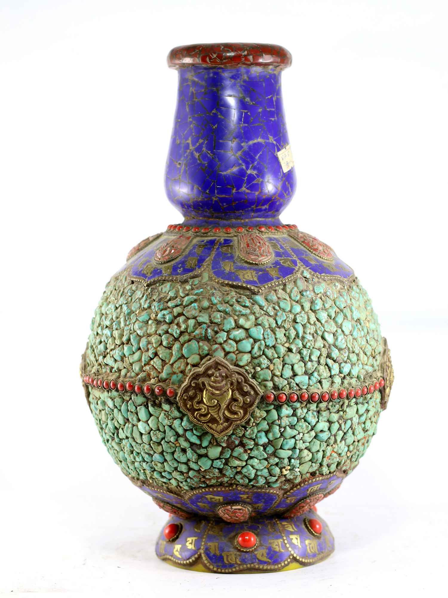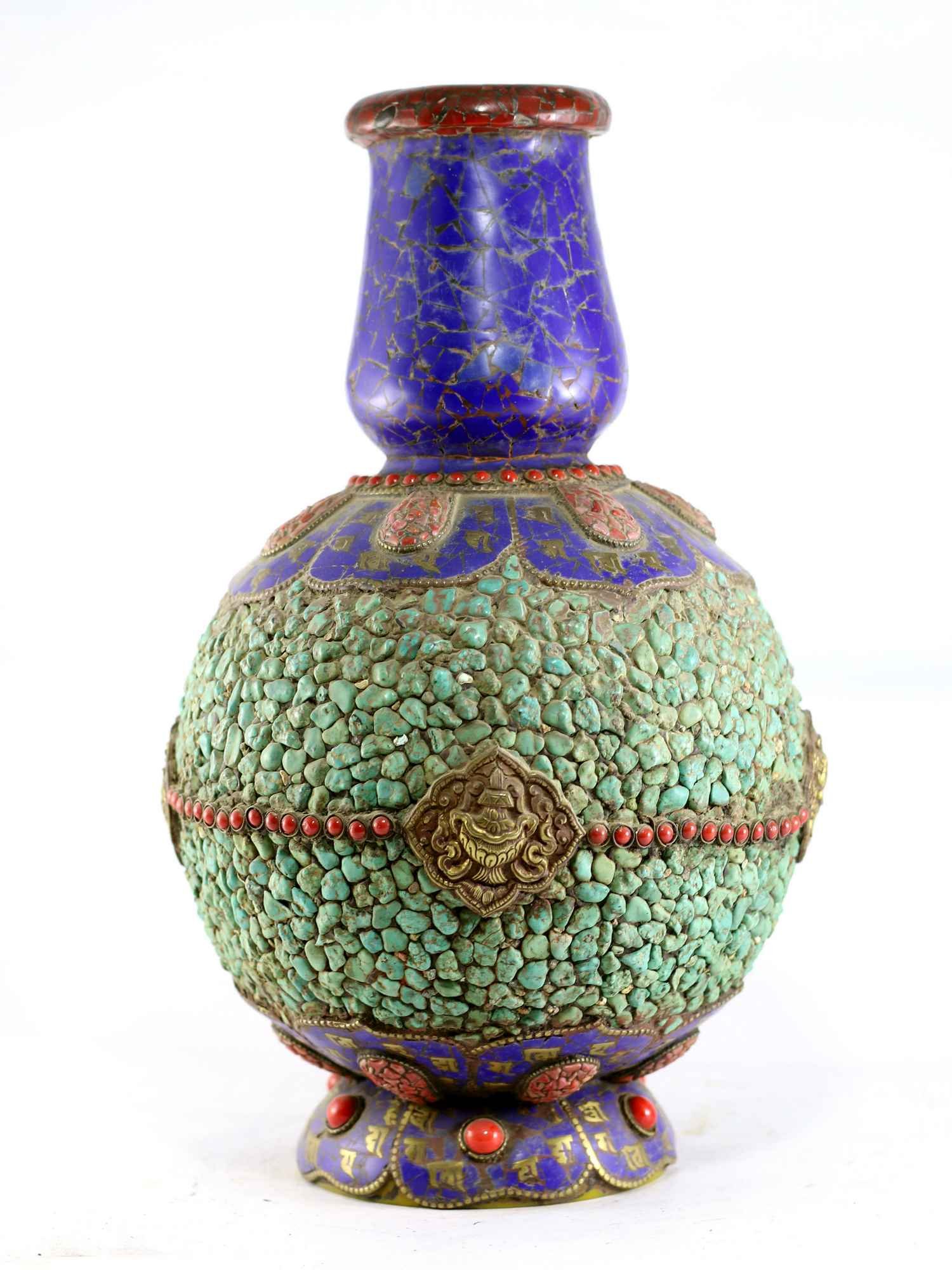 Tibetan Flower Vase :Vase with Stone Setting, Ashtamangala, Tourquise Coral and Lapis , The offering of flowers, symbolizing devotion, purity, and the transience of life