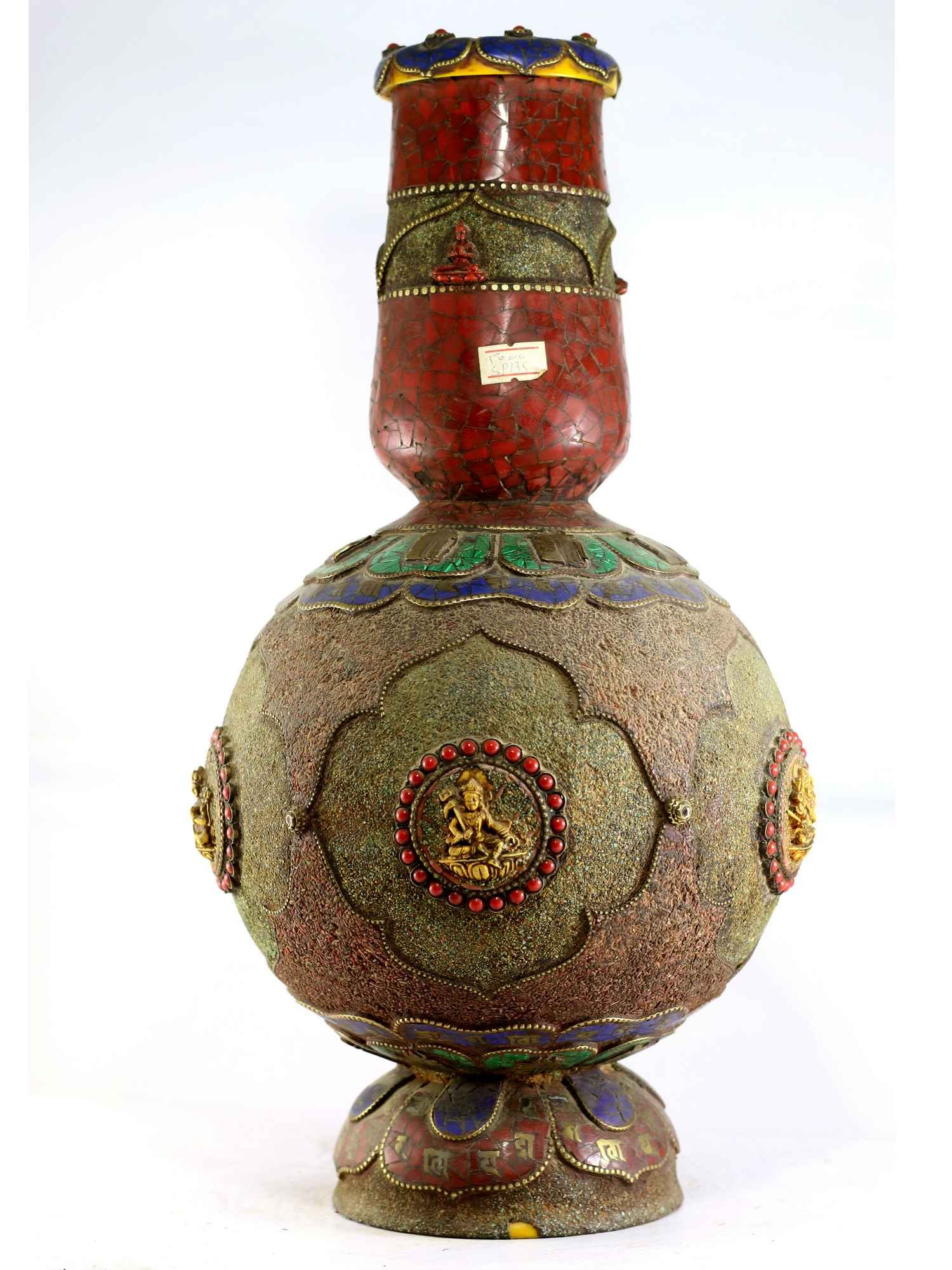 Tibetan Flower Vase : Vase with Stone Setting, Buddha, Tourquise Coral and Lapis , The offering of flowers, symbolizing devotion, purity, and the transience of life