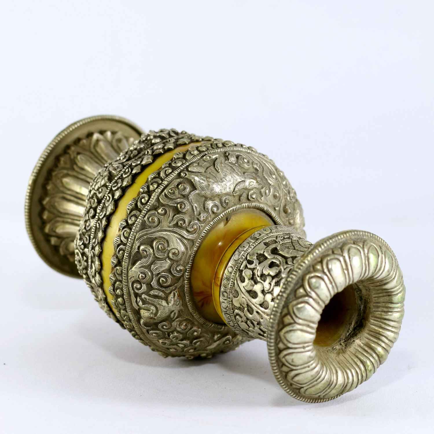 Tibetan Flower Vase :Silver Vase Over Imitation Amber , The offering of flowers, symbolizing devotion, purity, and the transience of life