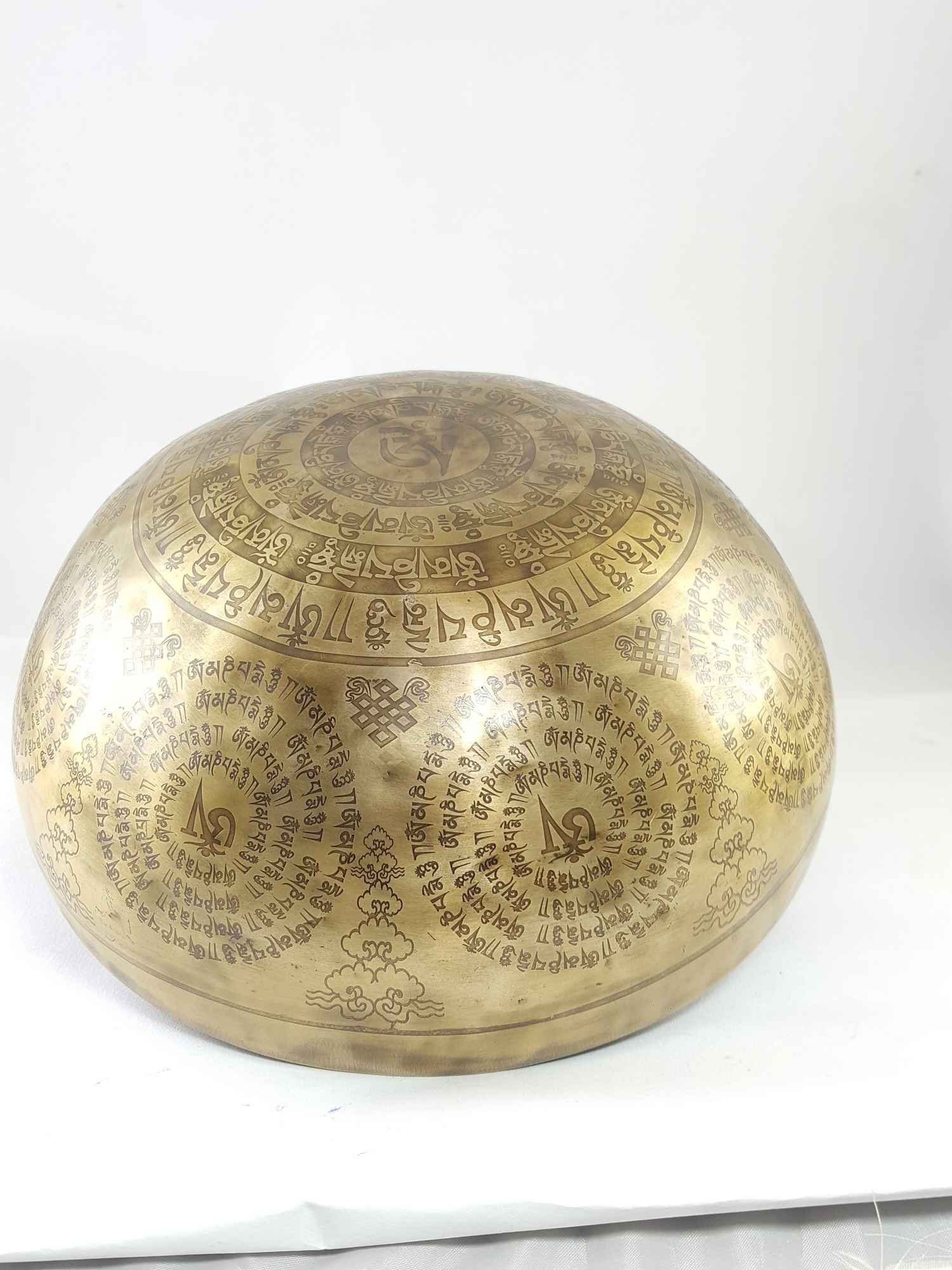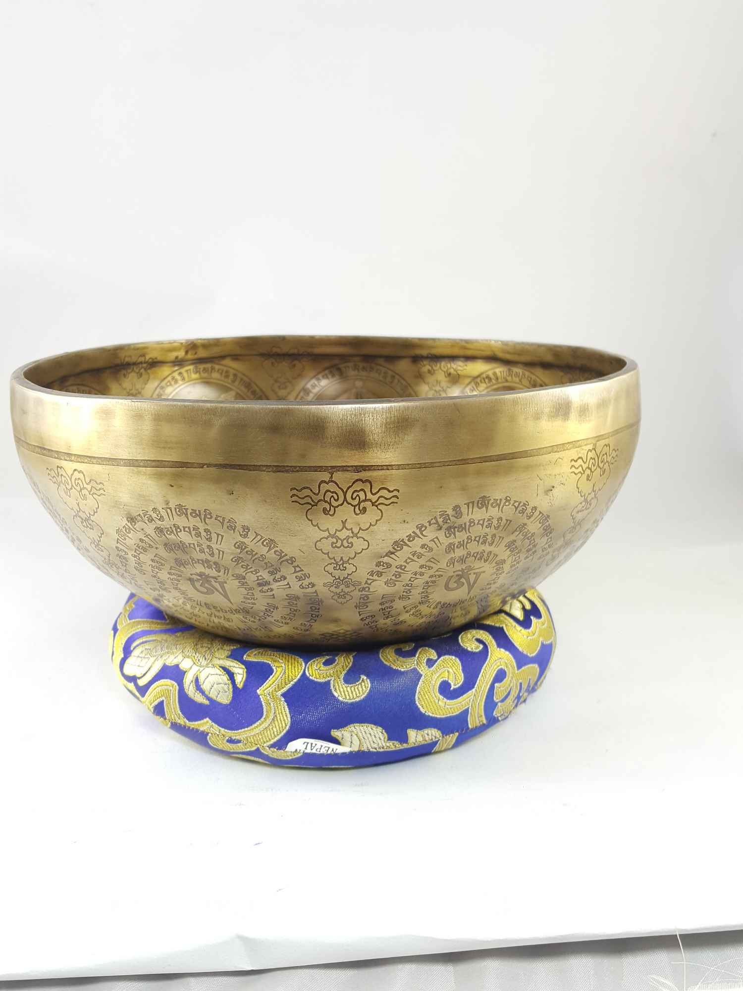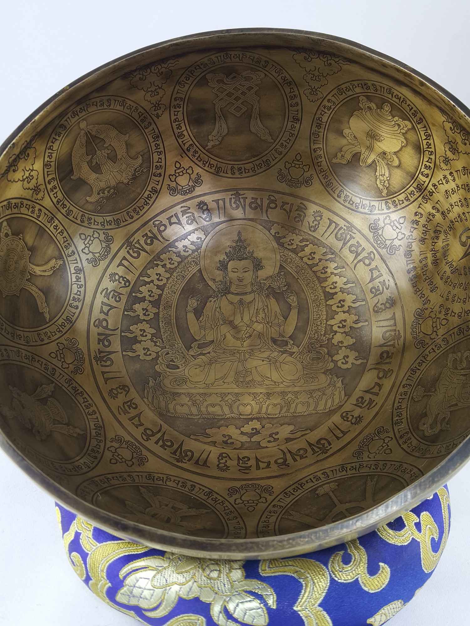 Solar Chakra High Quality Singing Bowl Jambati, with Chenrezig At The Centre and Ashtamangala, Select Accessories , A bowl used for meditation and healing, producing a soothing sound that promotes relaxation and mindfulness