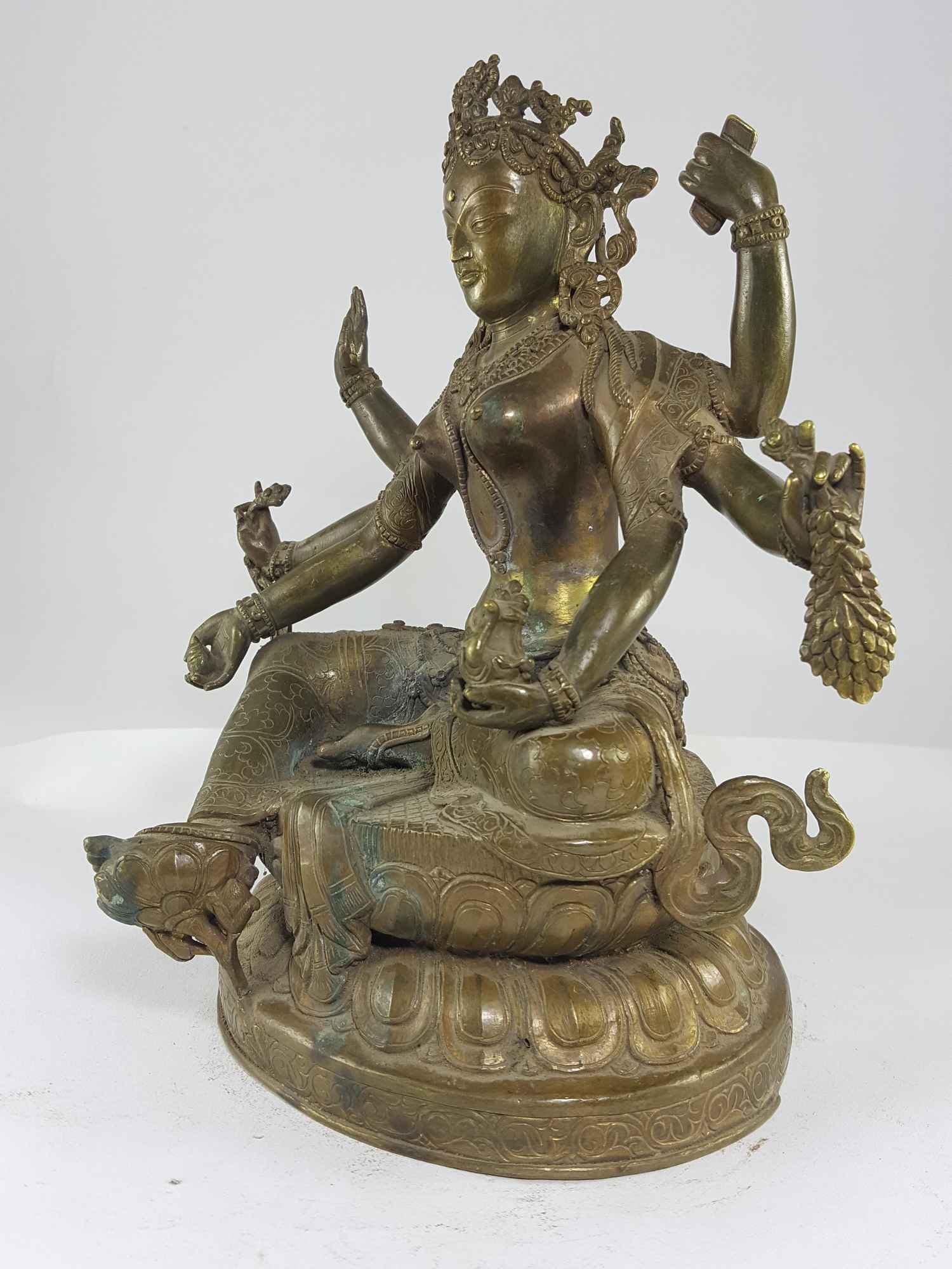 Vasudhara or Vasundhara, the 'treasure holder', is a popular Newar goddess of fertility and prosperity, and a consort of the wealth-god Jambhala. She sits in the posture of 'royal ease' on a moon disc and a pink lotus, with her left leg drawn up and her extended right foot resting (similar posture to Green Tara - showing her willingness to "come down from her lotus throne" to help those who call upon her) upon a white conch shell (symbolising having conquered/having perfect control of speech) and a golden treasure-vase (wealth/prosperity). She is beautiful and attractive, as youthful as a sixteen-year-old, and her golden body scintillates with radiant light. Her three beautiful and smiling faces are coloured red (right - red being the colour of controlling), golden (centre, golden being the colour of increasing), and red (left), representing perfect compassion, wisdom understanding, awareness and insight into the past, present and future, she is adorned with the five divine silks and the eight jewelled ornaments. Her first right hand makes the gesture of generosity, while her other two right hands hold the 'Three Jewels' of the Buddha, Dharma and Sangha, - symbolising the necessity of maintaining the commitments of refuge to the three jewels, and a golden rosary, symbolising continuous practise and self-examination, vital to enlightenment. With her three left hands she holds a small treasure-vase, for long life and initiation, an ear of grain, for abundant harvests and earthly benefits, and a sacred text to grant wisdom. In her hands, Vasudhara holds a variety of objects attributed to her. Most representations show her holding a sheaf of corn in her left hand, symbolizing an abundant harvest. She may also be holding a gem or small treasure, a symbol of wealth. Representations with more arms, such as the six-armed Nepali representation, also depict her holding a full vase and the Book of Wisdom. With her free hands, Vasudhara performs mudras. A commonly seen mudra in paintings and figurines featuring Vasudhara is the varada mudra, also known as the charity mudra, which symbolizes the "pouring forth of divine blessings." In her 2 armed one faced form, she has a golden body, representing the earth element, Ratnasambhava in her crown, sometimes 2 eyes or 3 eyes, if with 3 eyes - representing perfect awareness, understanding, compassion, wisdom and insight into the past, present and future. Her 2 hands holding a sheaf or corn for agricultural prosperity and to "sew the seeds" of enlightenment, and either a single wish fulfilling jewel or a bowl of wish fulfilling jewels for wealth and wish fulfilment. Vasudhara is the subject of numerous bronzes and paintings. She is predominantly the central figure of bronze sculptures or painted mandalas. She may also, however, appear alongside her consort, Vaiśravaṇa (Jambhala) the Buddhist God of Riches. Despite his status, she surpasses him in popularity and is more commonly the central figure of her own mandalas