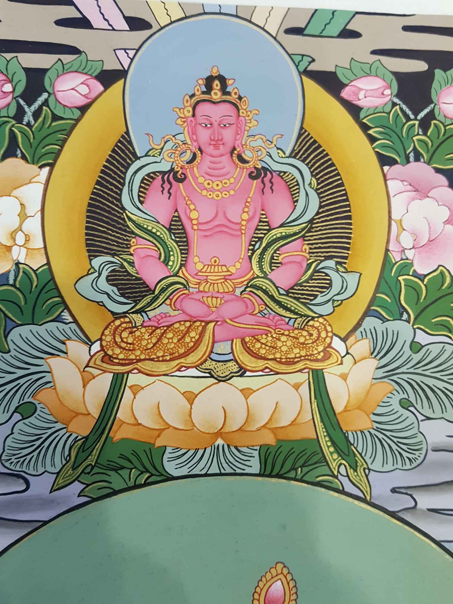 Manjushree is the Bodhisattva who holds the flaming sword [Skt. Khadga] of enlightenment, by his left hand in a warning( Tarjani) hand gesture ( Mudra) in his left hand representing his realization of wisdom to cut through ignorance & wrong view. His right hand depicted in teaching (Jnana Mudra) holds the stem of a Blue Lotus (Utpala) flower upon which rests the Book (Pustaka) of Perfection of Transcendental Wisdom. The blue lotus is a symbol of the victory of the spirit over the senses and signifies the wisdom of knowledge. This represents the lotus that he obtained from the middle of the lake in the Kathmandu Valley out of which grew a lotus bearing a Blue Flame which represents wisdom. Manjushree sits upon a moon disc upon a lotus with an elongated stem arising from a lake. He wears a gold diadem fitted with precious jewels. He wears a silk scarf fastened at the waist and over this, a softly glowing green scarf decorated with golden motifs. His head is silhouetted against a nimbus. The lotus he is sitting on has an elongated stem and arises from a lake representing his recovery of the blue flame of transcendent wisdom and the teaching he originated. The white sash is the attire of the Vajrayana school of Buddhism.