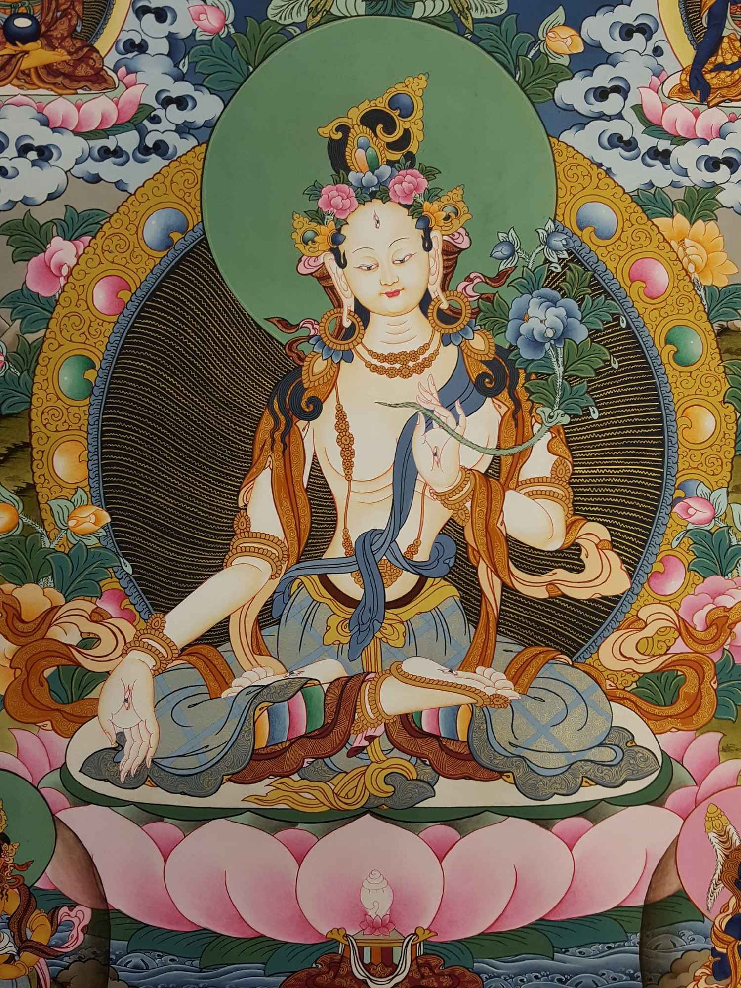 White Tara Real Hand Painted Thanka Painting Real Gold, HQ, One Hair Brush, Lamas Painting , Goddess of longevity, healing, and serene compassion