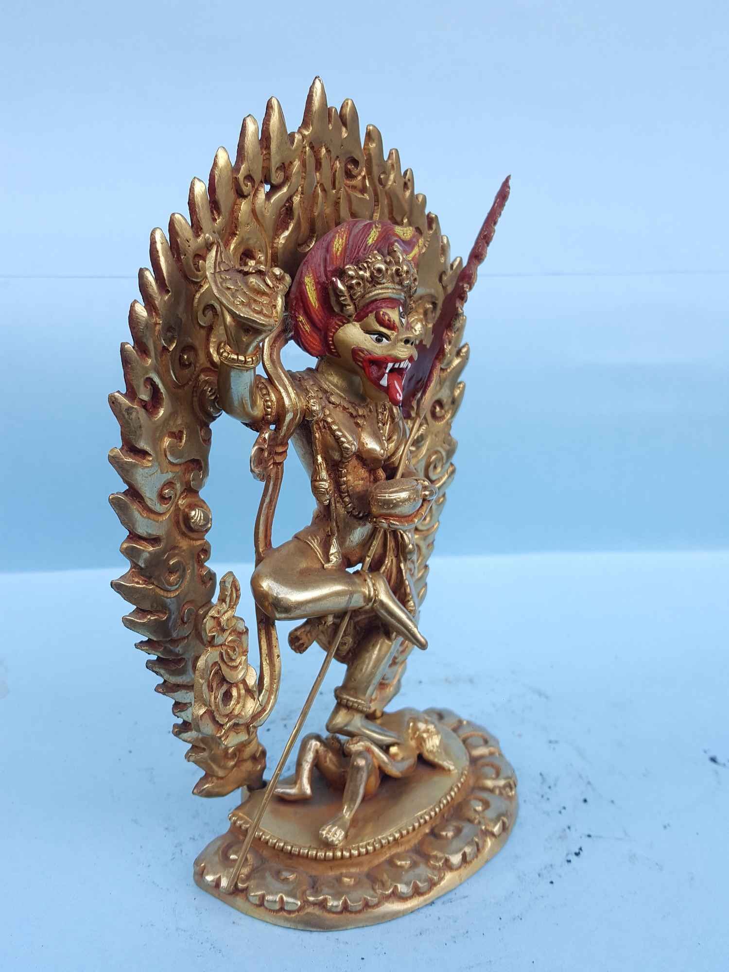 Simhamukha Yogini, Senge Dongma - Tibetan Handmade Statue Full Fire Gold Plated, Painted Face , Fierce Protector and Obstacle Remover