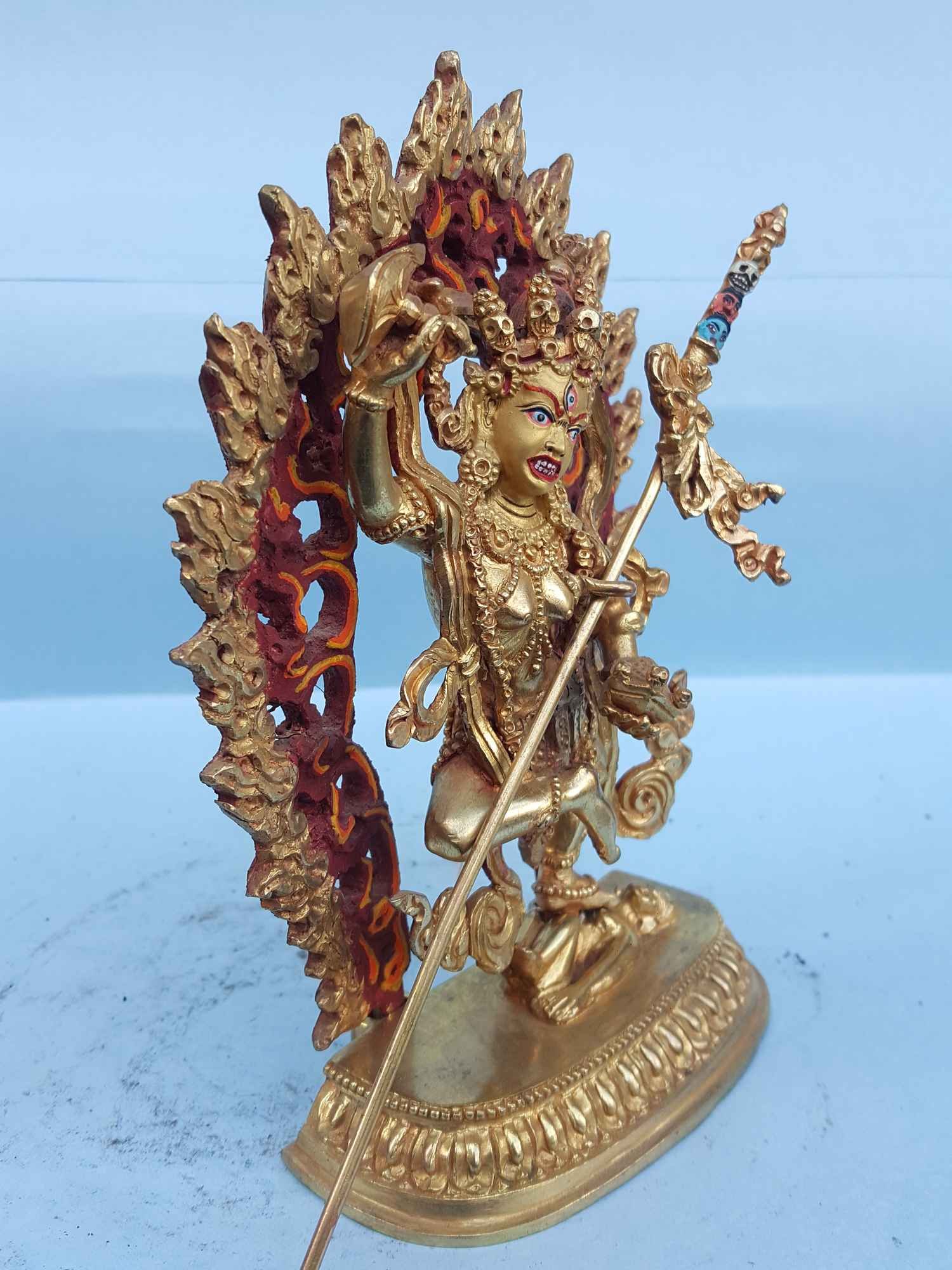 The face of Vajravarahi is painted with gold to enhance its significant features, particularly the eyes, and lips. This detailed painting is essential as it brings forth the crucial attributes of the expression of eyes and lips that metal carving alone cannot capture.