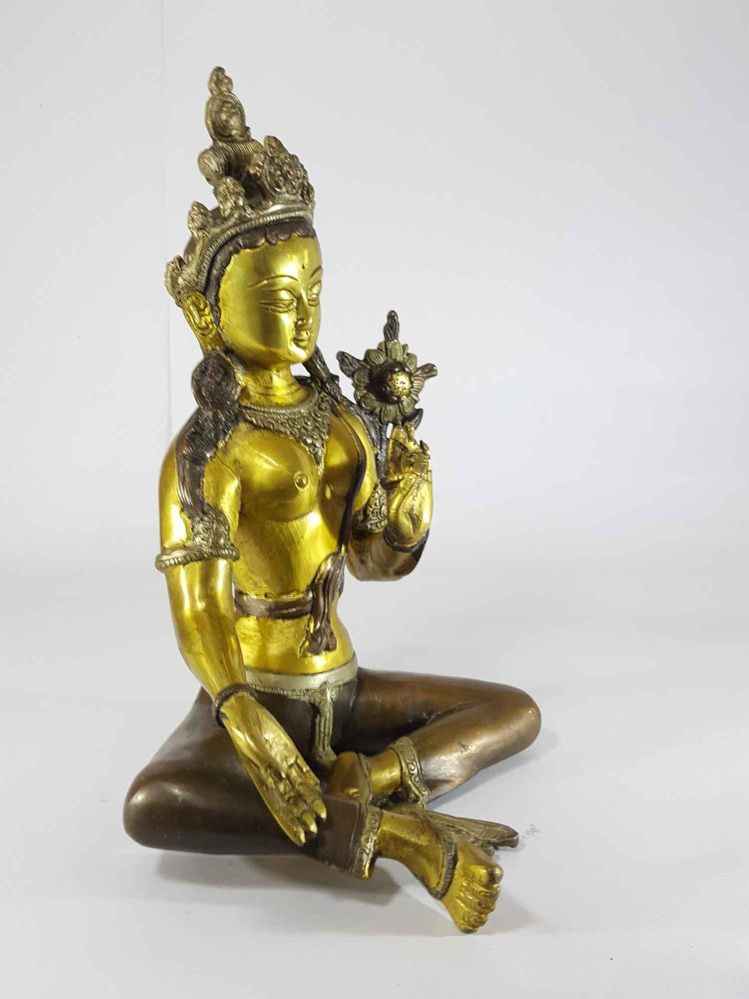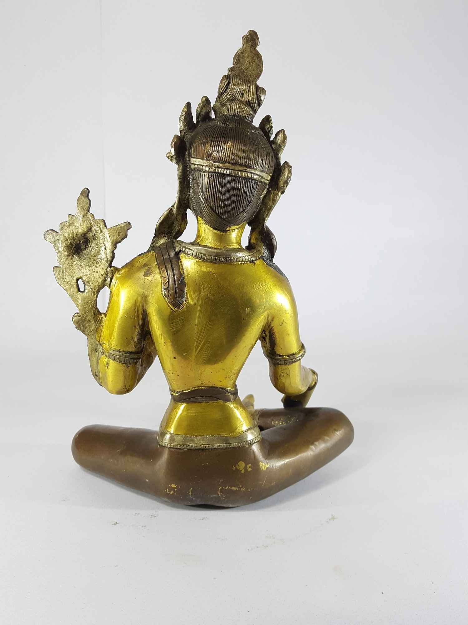 This Green Tara has been created using the sand casting system, also known as sand molding casting. This widely employed manufacturing process utilizes a sand mold to produce metal products and components in various sizes and shapes. Sand casting holds significant popularity in the industry, accounting for approximately 60% of all metal castings. The sand casting process involves six primary steps. First, a pattern or replica of the desired sculpture, in this case, Green Tara, is created using a material like wood or metal. The pattern is then placed in a flask, which is a box-like structure divided into two halves. The next step involves packing the flask tightly with specially formulated molding sand, creating a mold cavity that matches the shape of the pattern. The pattern is subsequently removed, leaving behind a negative impression of the sculpture within the sand mold. Read More