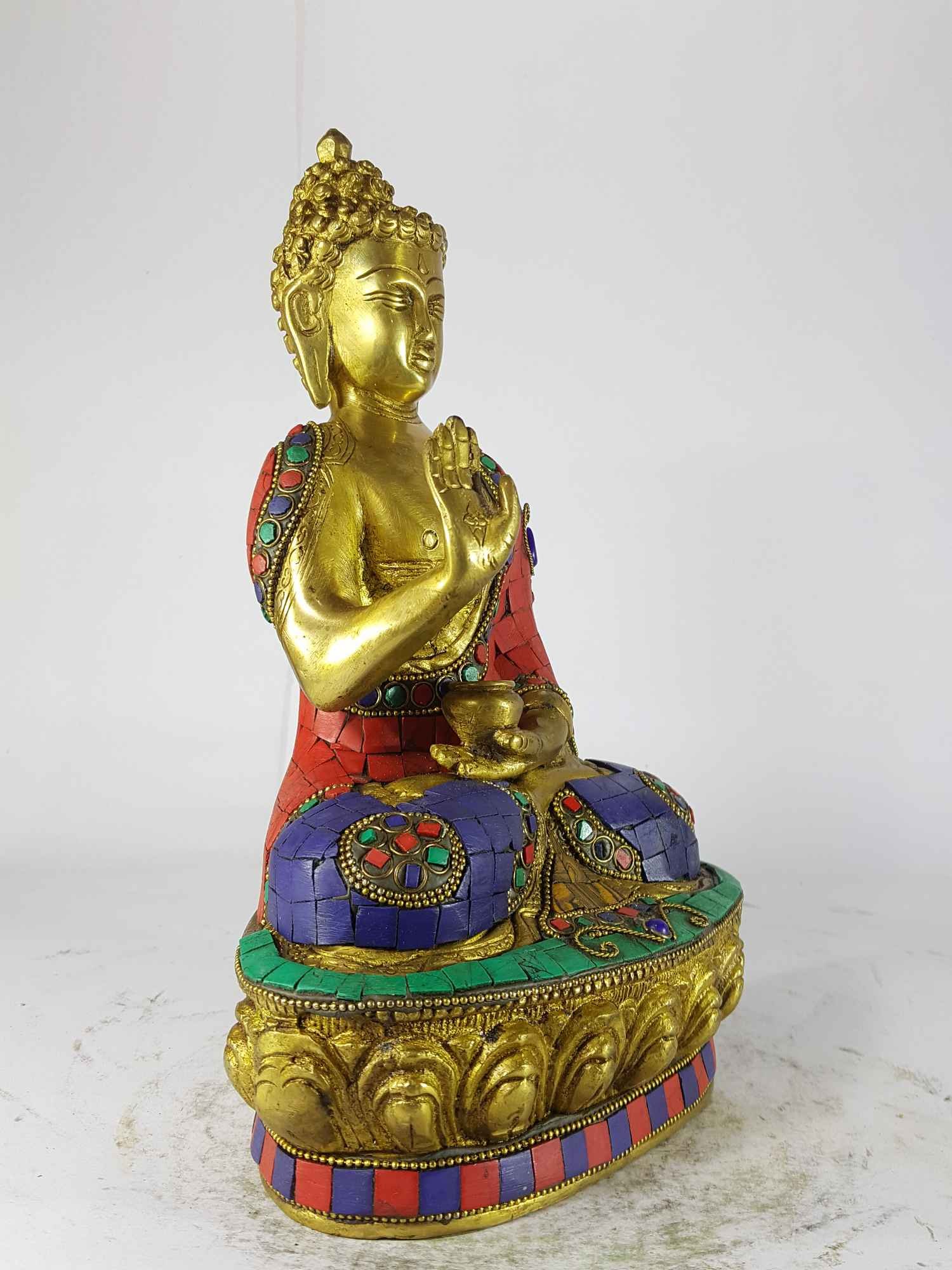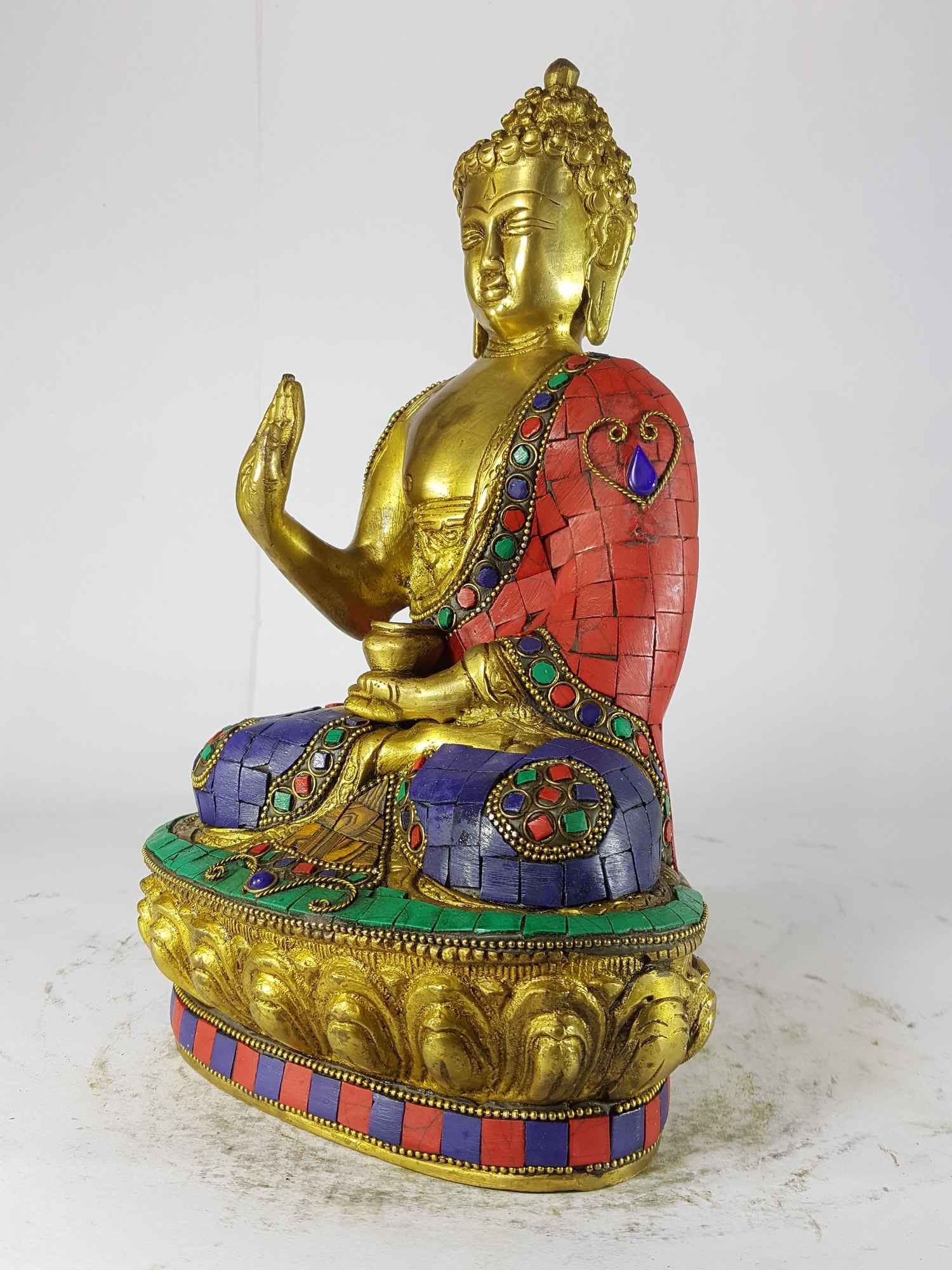 The Amoghasiddhi Buddha is adorned with an exquisite array of semi-precious stones, including turquoise, coral, and lapis lazuli. These stones are carefully selected and meticulously placed on the Amoghasiddhi Buddha's surface, adding a touch of opulence and enhancing its overall beauty. Each stone is thoughtfully positioned using a high-quality adhesive, ensuring secure and long-lasting attachment. The vibrant colors and unique patterns of the stones create a captivating contrast against the backdrop of the Amoghasiddhi Buddha, elevating its visual appeal and making it truly eye-catching. Read More