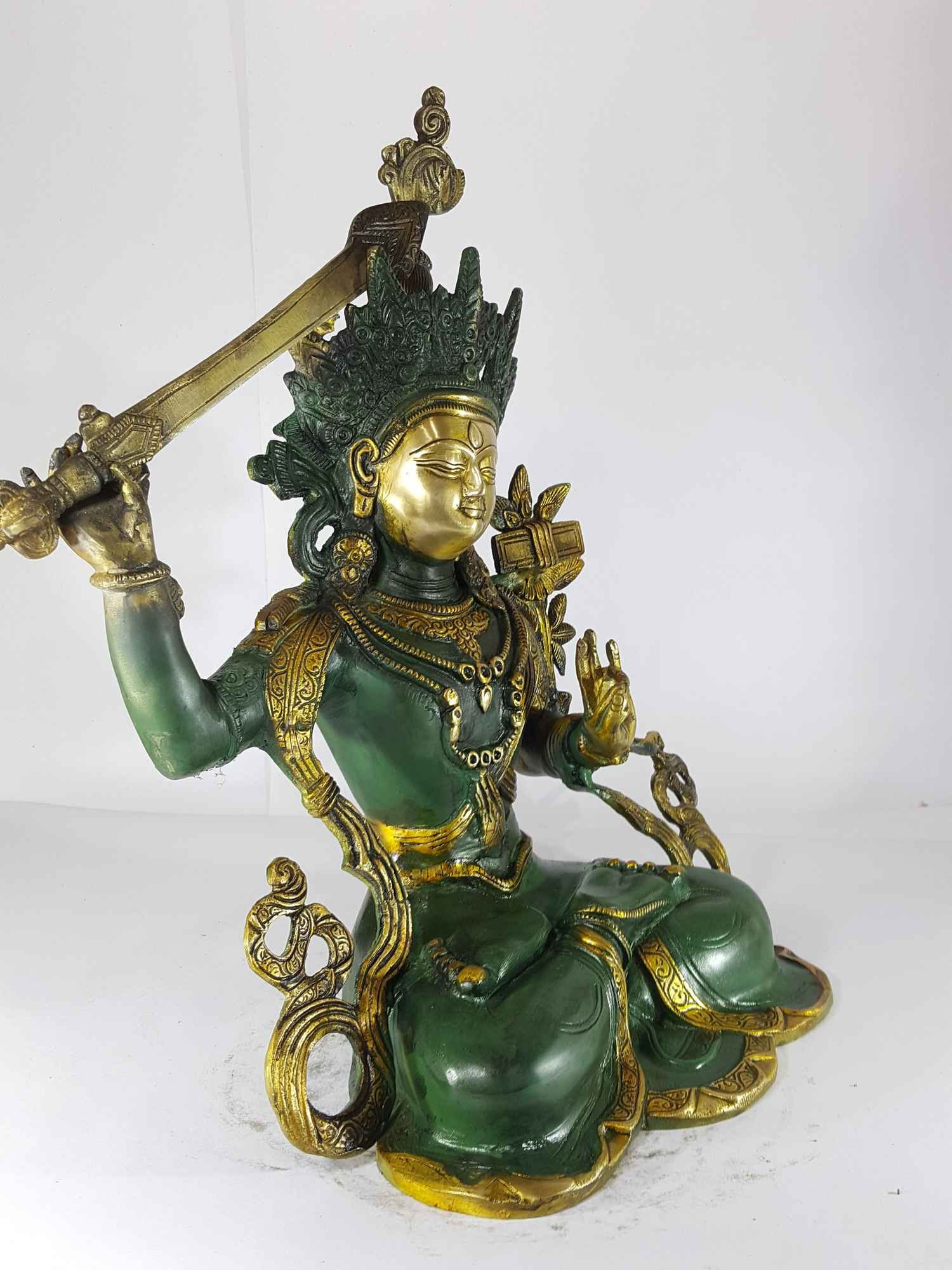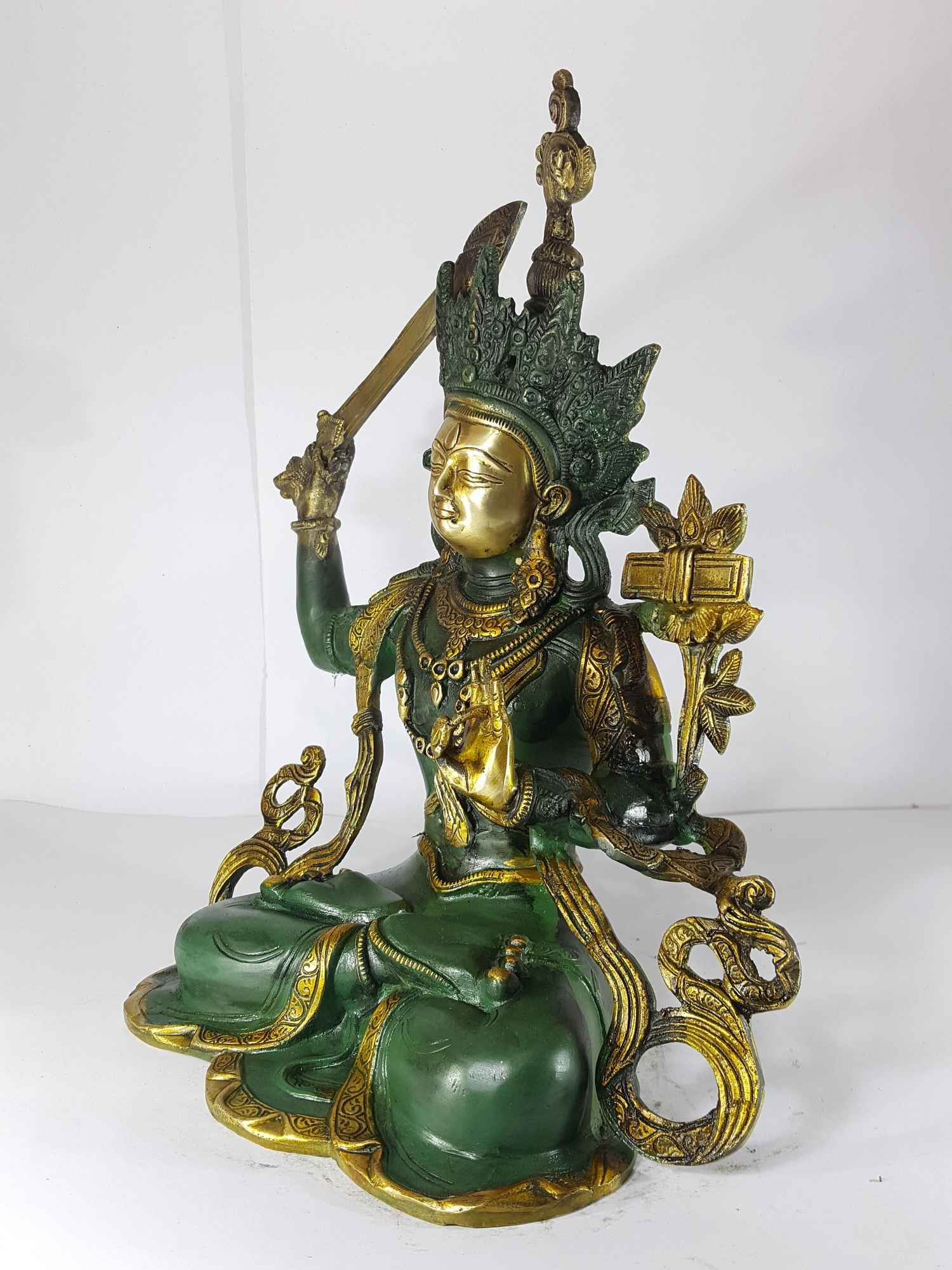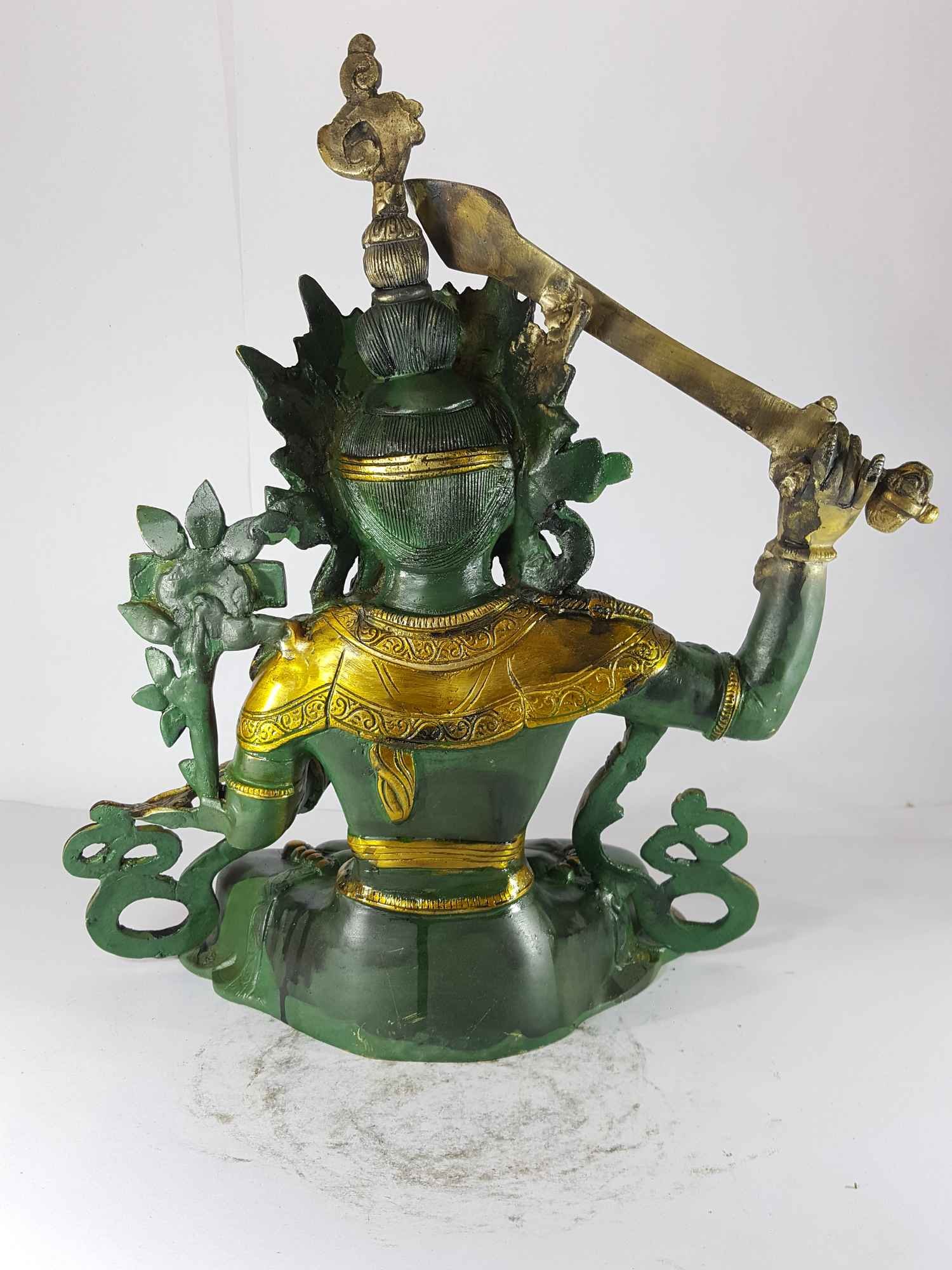 Manjushri Statue Sand Casting, Green Painted , Wisdom Buddha, cutting through ignorance with the sword of insight