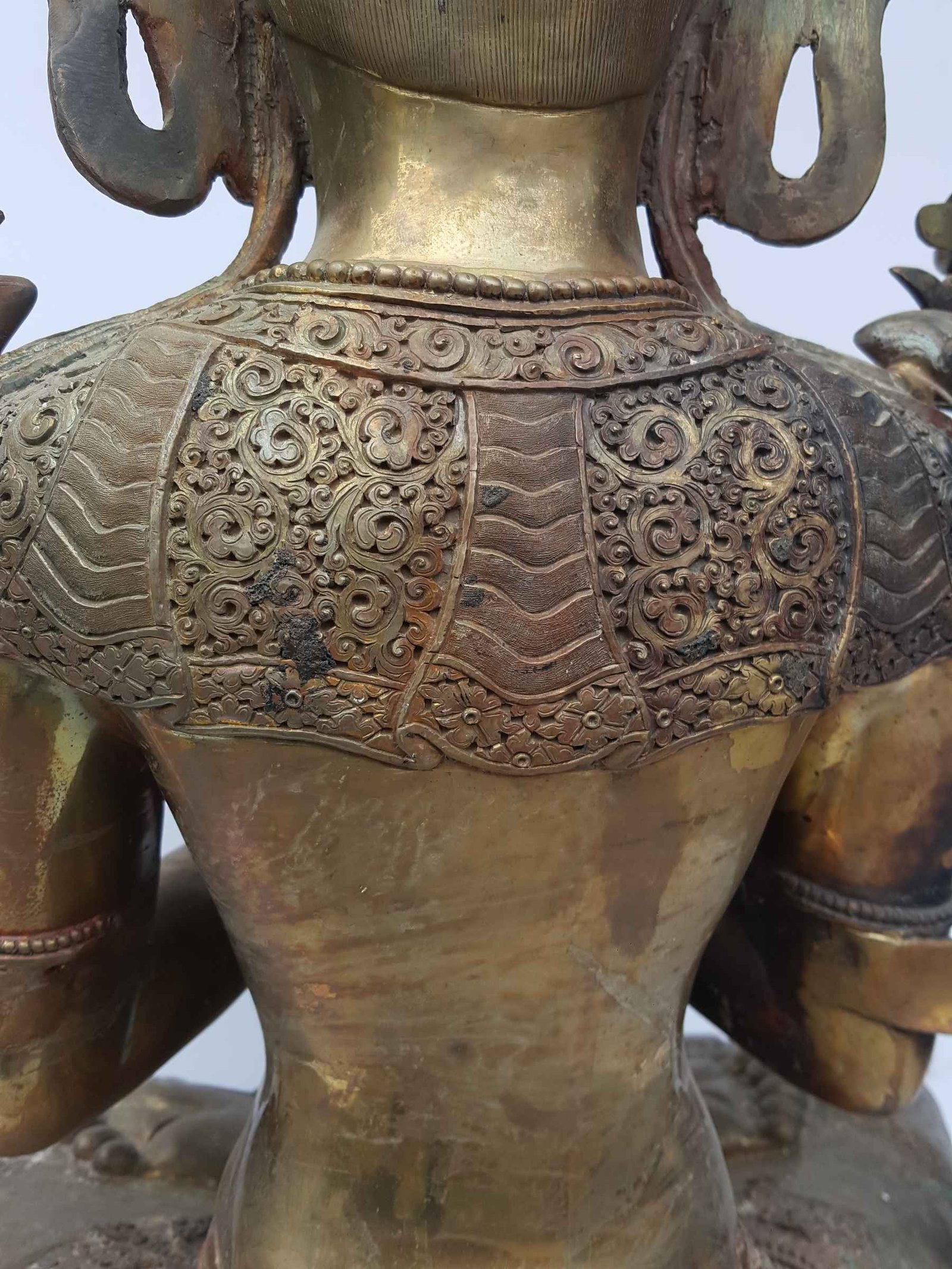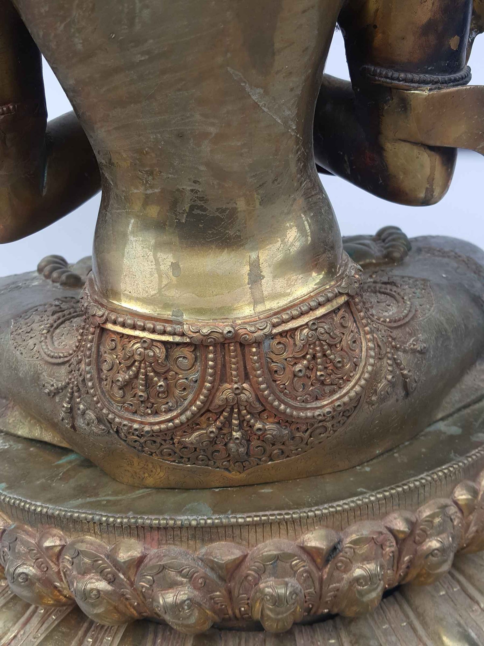 The Manjushri has no patina finishing over it. presenting a unique opportunity for personalization. As it is, the statue can be displayed in its raw form, showcasing its inherent beauty and craftsmanship. Alternatively, you have the option to further enhance the statue's appearance by applying various finishes such as gold plating, oxidation, or silver plating. Over time, if left untreated, the statue will naturally develop a patina. This is a gradual process where the surface undergoes subtle changes, resulting in a charming and distinct aged appearance. The patina adds character and depth to the statue, telling a story of its journey and the passage of time. Read More