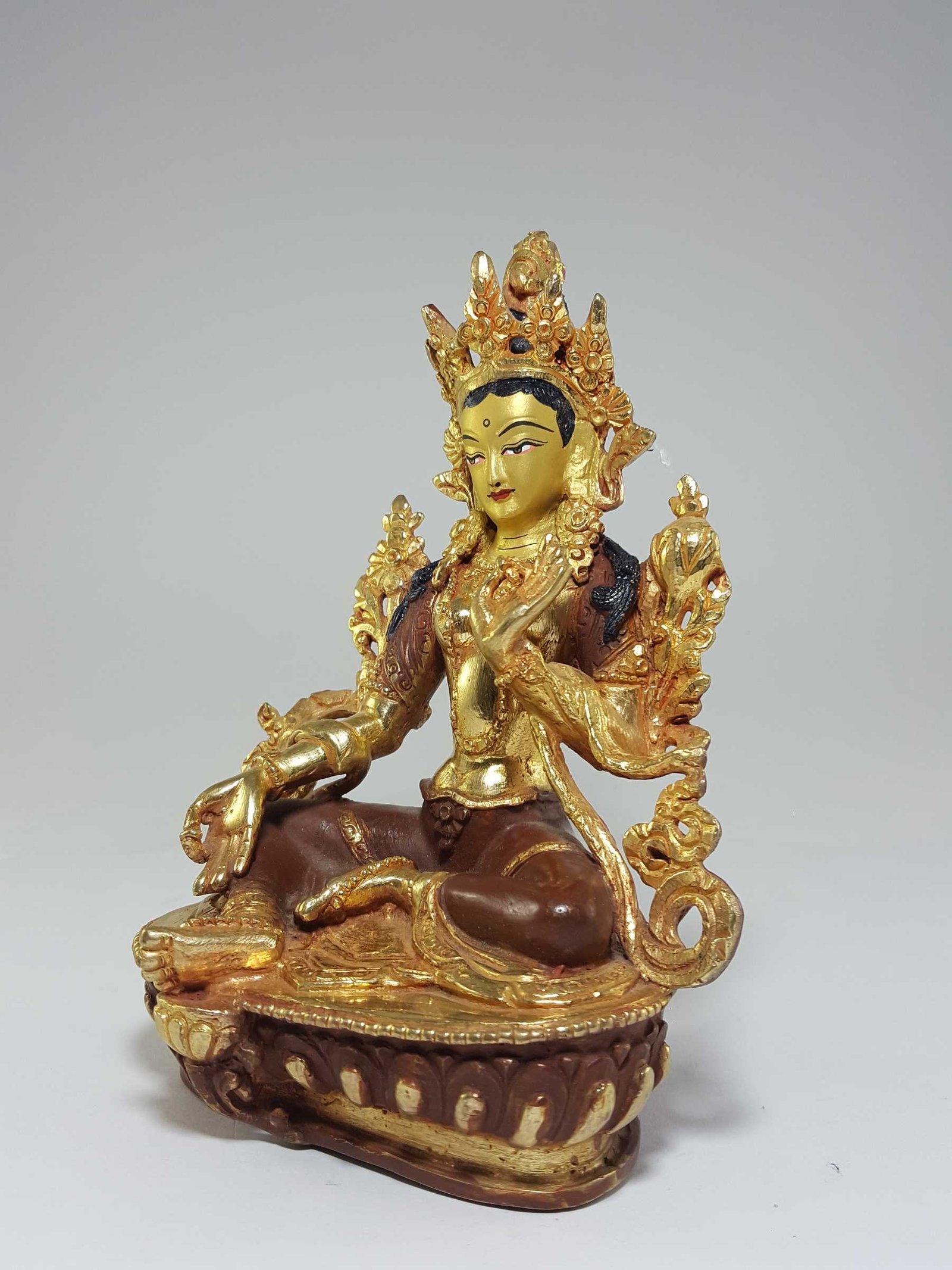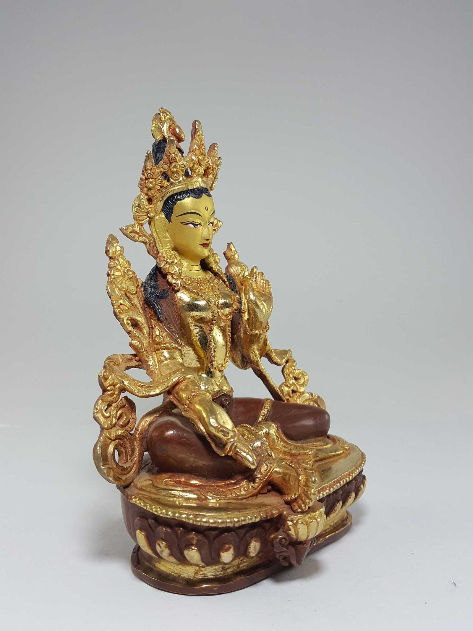 Statue of Green Tara Partly Fire Gold Plated, Painted Face, Good Quality , Goddess of Compassion, Protection, and Swift Action