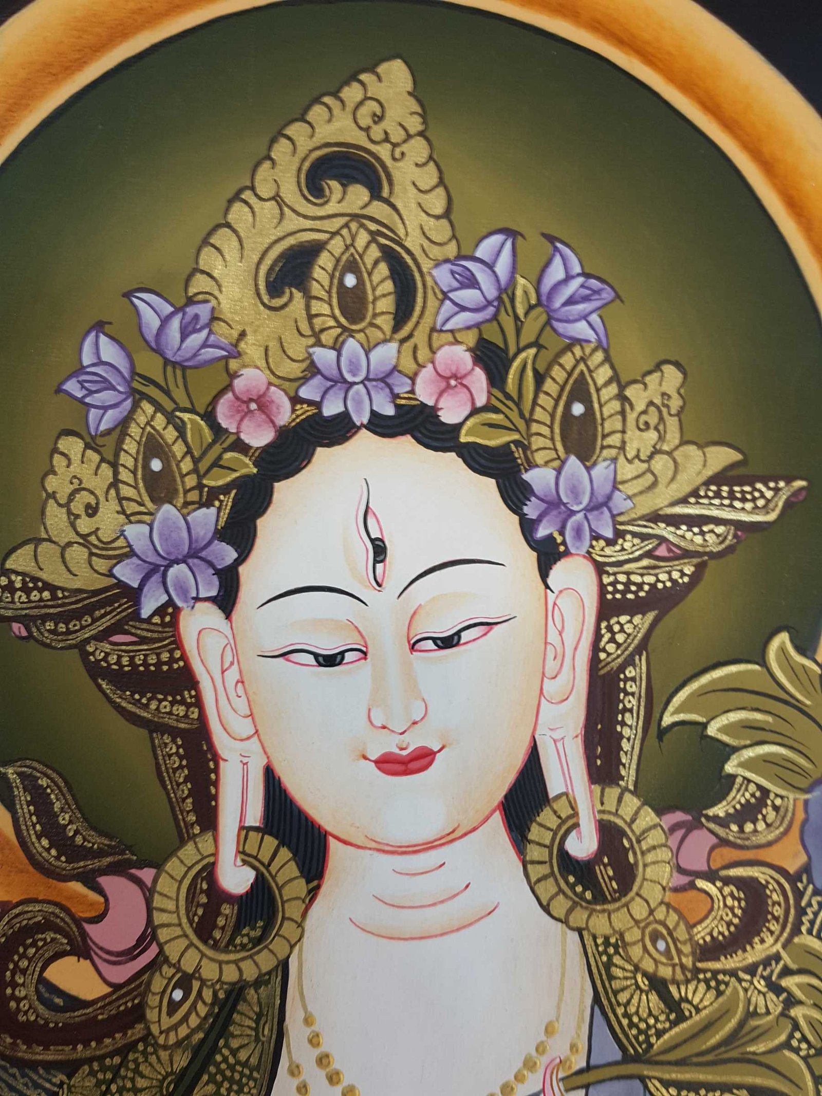 Tibetan Thangka of Healing Thangka, White Tara, Aparimita, Namgyalma High Quality Real Gold and Tibetan Colors , Goddess of longevity, healing, and serene compassion