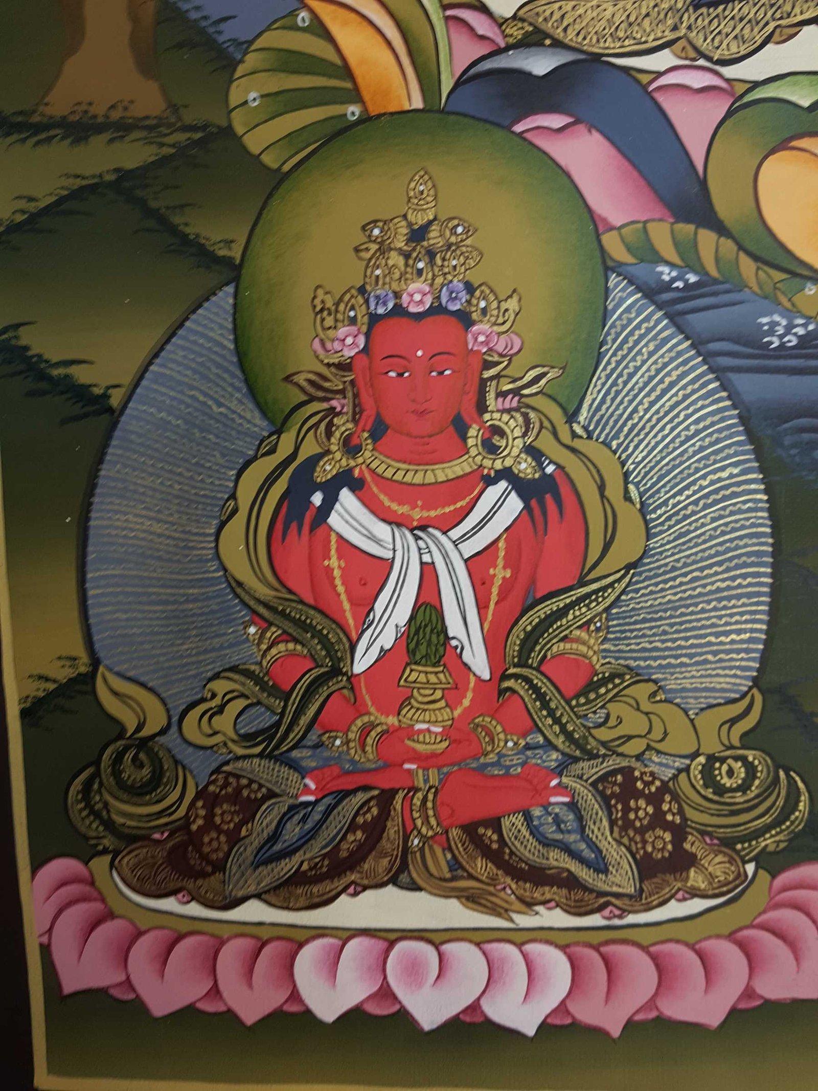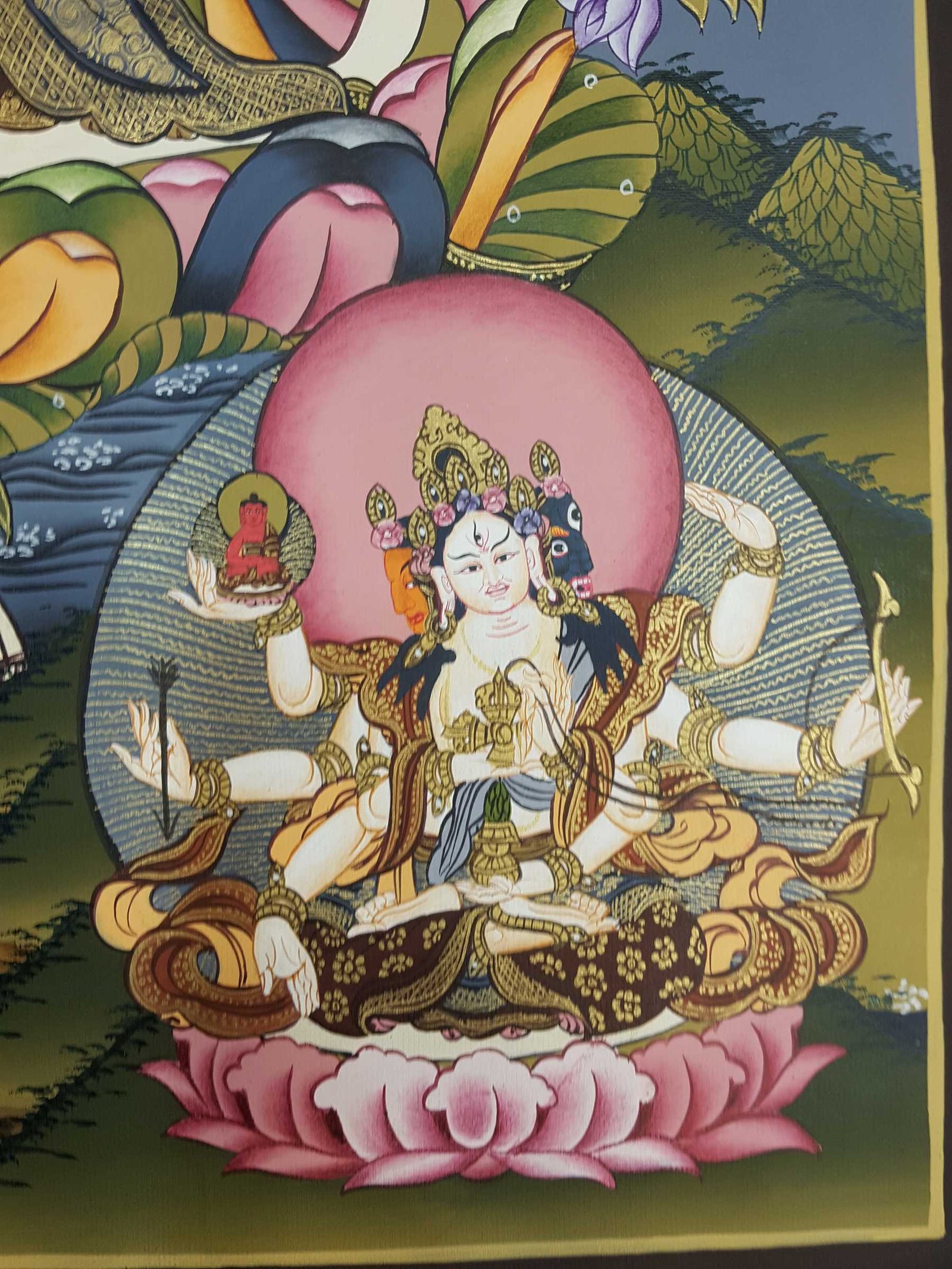 This is a hand painted Thangka. This Thangka is painted on a handmade cotton canvas, Painted using natural color in a traditional Tibetan thangka color scheme by the artist with proper Lama schooling. This thangka is using real gold to paint the golden color.