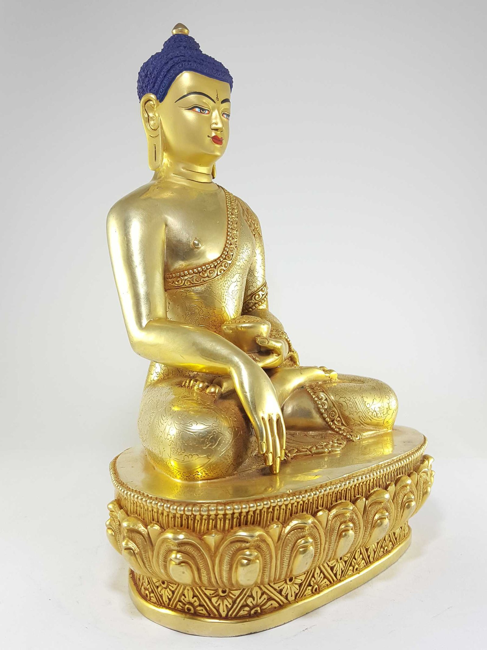 The face of Shakyamuni Buddha is painted with gold to enhance its significant features, particularly the eyes, and lips. This detailed painting is essential as it brings forth the crucial attributes of the expression of eyes and lips that metal carving alone cannot capture.