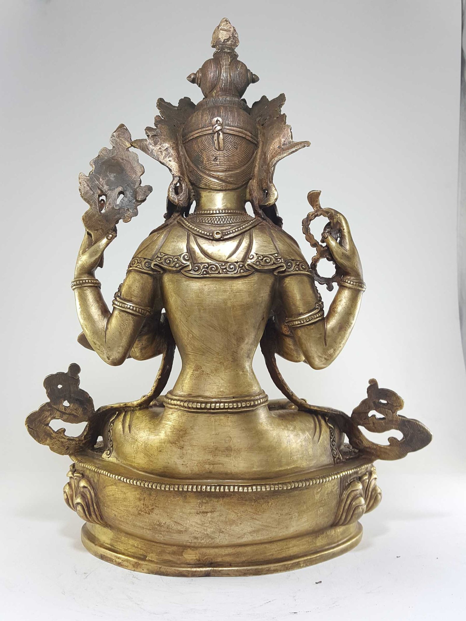 This Chenrezig product features a stunning Bronze patina finish. Our store takes pride in offering this exclusive patina, which involves a meticulous process utilizing organic materials such as butter and vegetable color. The aim is to recreate the appearance of an aged bronze statue, evoking a sense of timeless elegance.