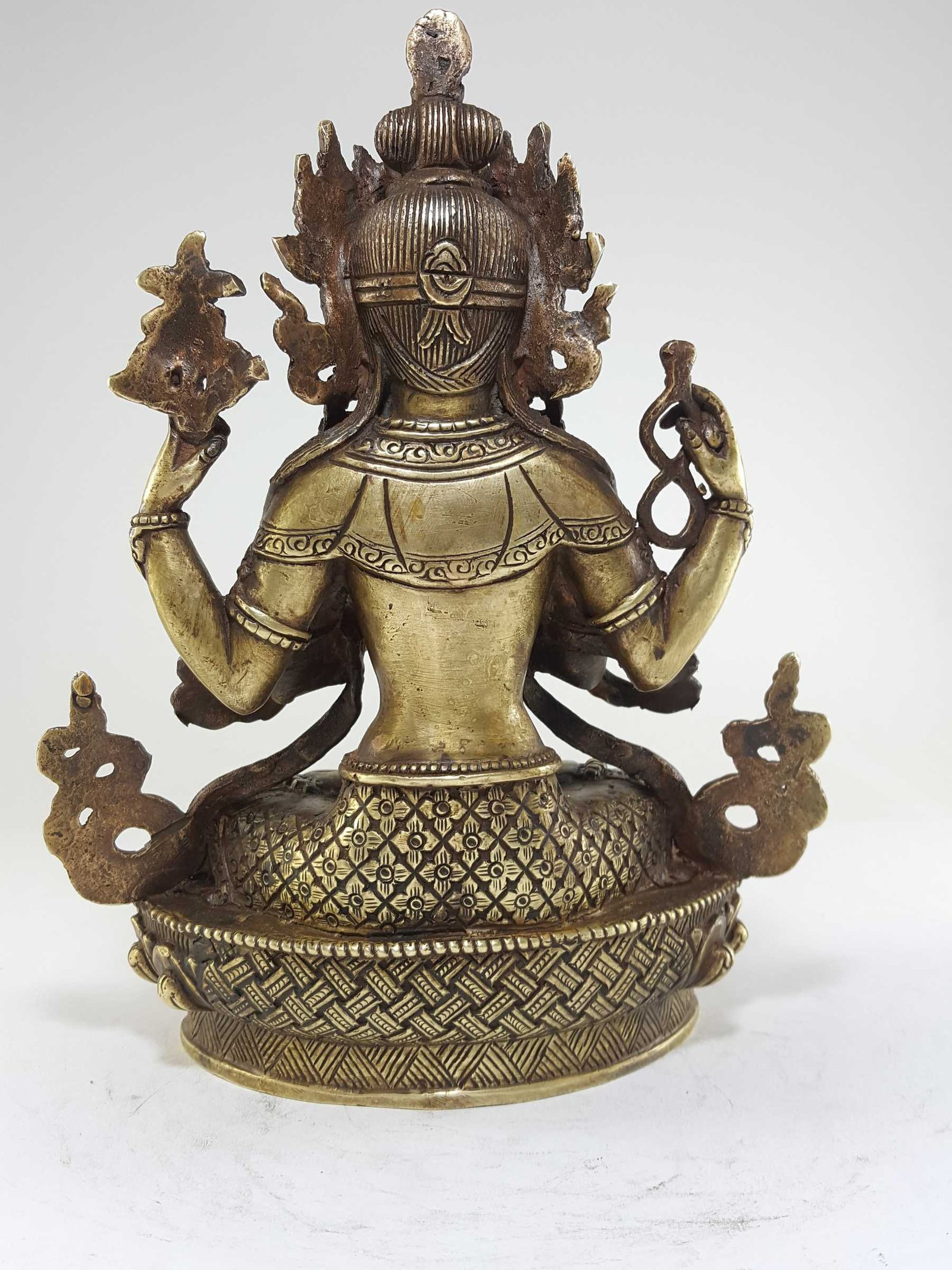 This Chenrezig product features a stunning Bronze patina finish. Our store takes pride in offering this exclusive patina, which involves a meticulous process utilizing organic materials such as butter and vegetable color. The aim is to recreate the appearance of an aged bronze statue, evoking a sense of timeless elegance.