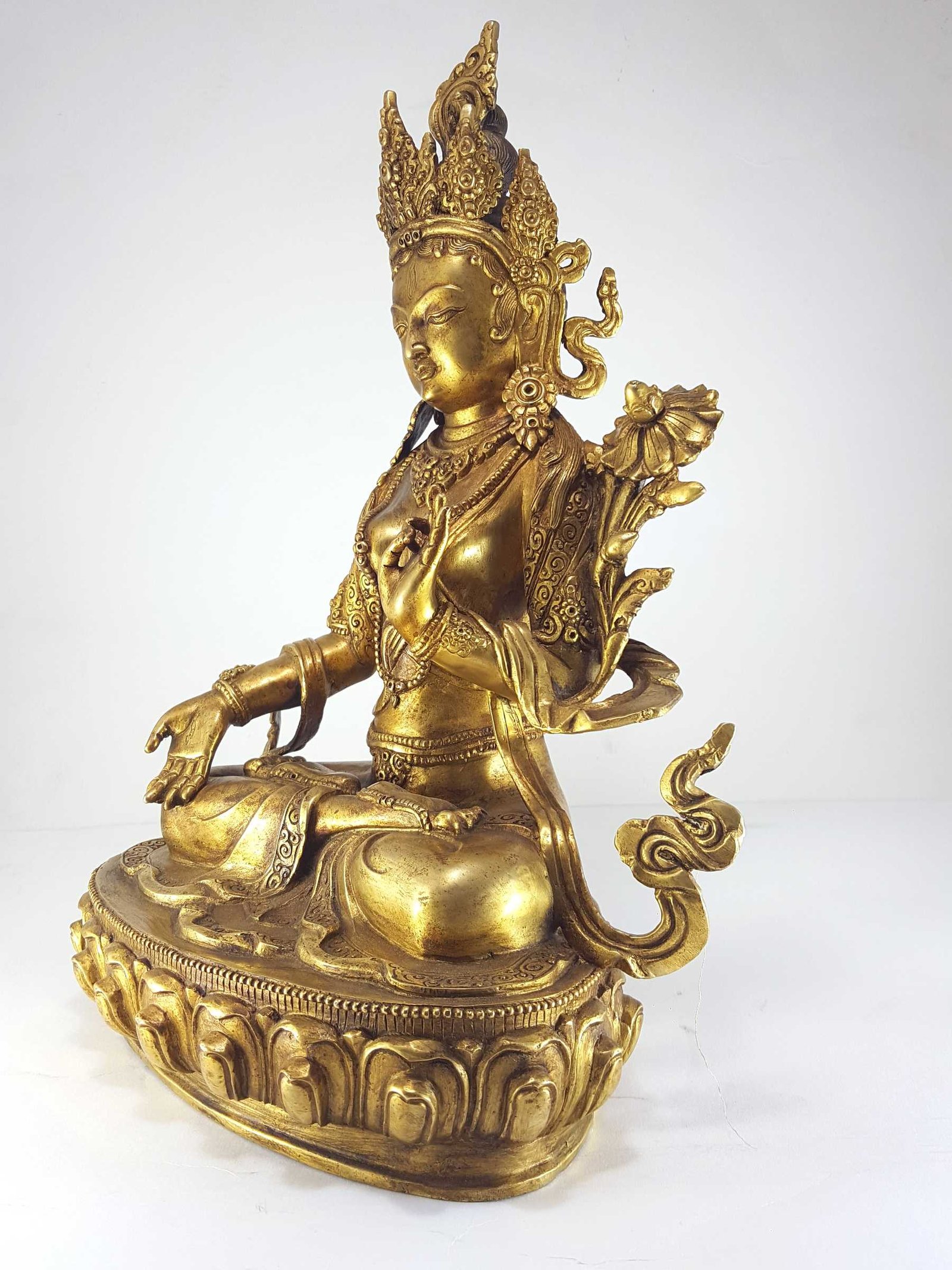 Statue of White Tara Single Lotus full Gold Plated, antique Finishing , Goddess of longevity, healing, and serene compassion