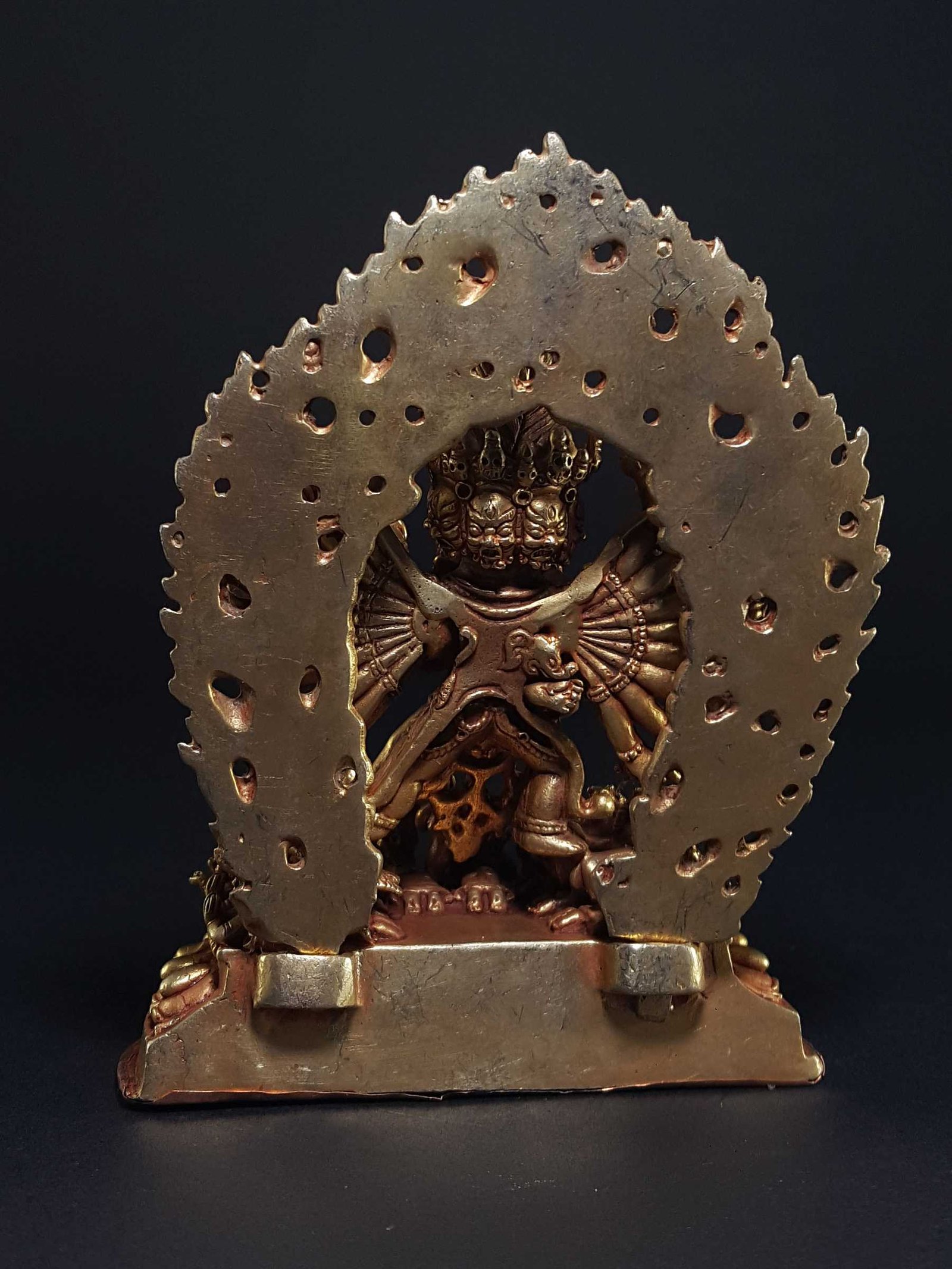 The Yamantaka has been crafted using the ceramic mold casting process, a modern approach that provides an alternative to traditional methods such as the lost-wax system or rubber molding. Also referred to as ceramic molding, this technique involves the creation of a ceramic mold to cast the statue. The process begins by making a precise and detailed wax model of the desired sculpture. The wax model is then coated with layers of ceramic material, creating a sturdy mold. Once the mold is complete, it is fired in a kiln, causing the wax to melt and escape, leaving behind a cavity that perfectly replicates the original sculpture. Molten metal is then poured into the mold, allowing it to fill the cavity and take on the desired form. Once cooled and solidified, the ceramic mold is carefully broken away, revealing the final metal statue. Read More