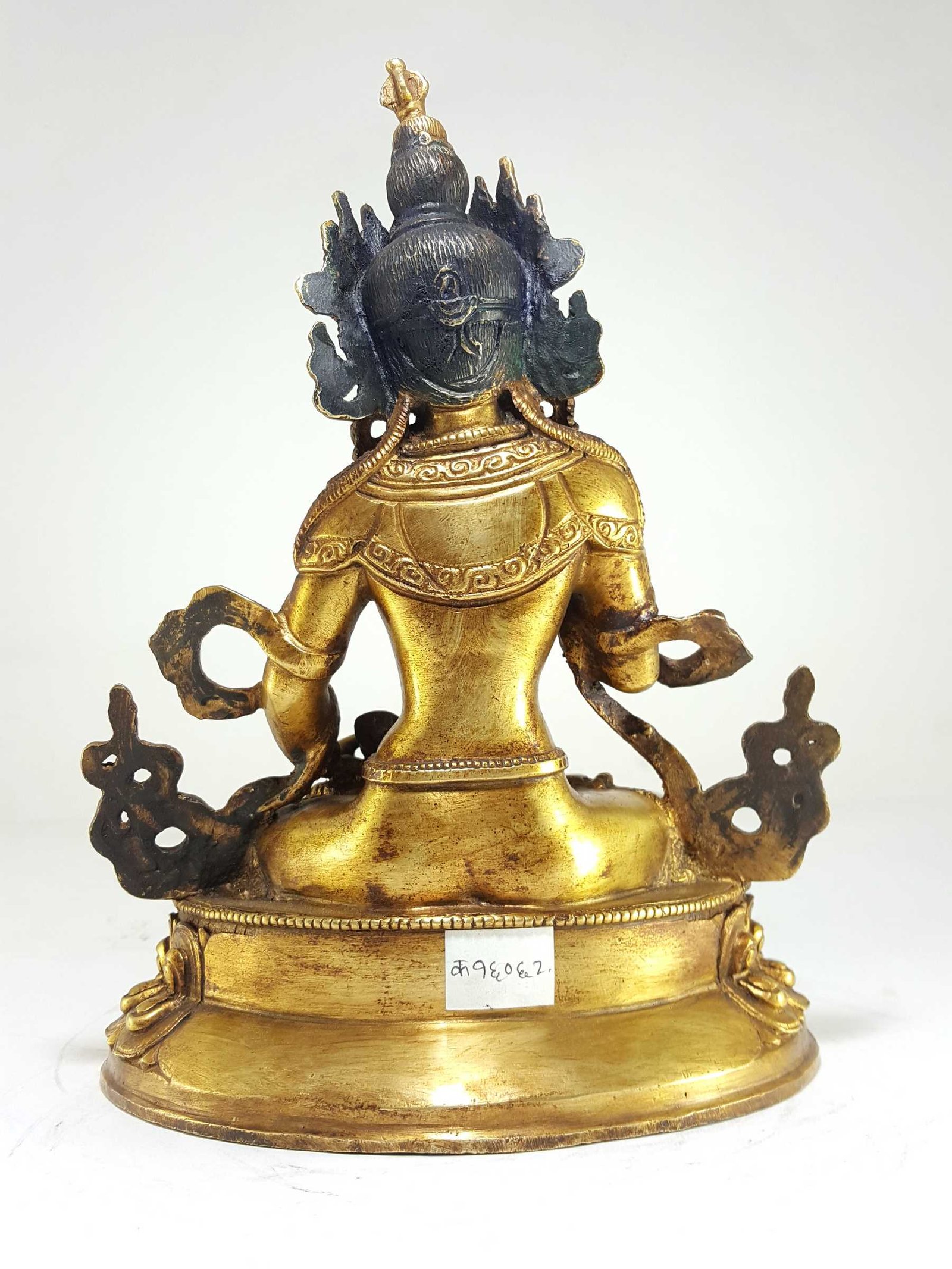This Vajrasattva has finished in a full gold Plated antique patina. The Antique finishing imparts a sense of age and character to the Vajrasattva, enhancing its overall appeal. In the Antique finishing process, after the Gold plating is applied, a carefully applied layer of varnish is added. This varnish not only contributes to the antique look but also serves as a protective barrier, ensuring the longevity of the gold plating. It helps to safeguard the gold layer but also prevents tarnishing for an extended period. Read More