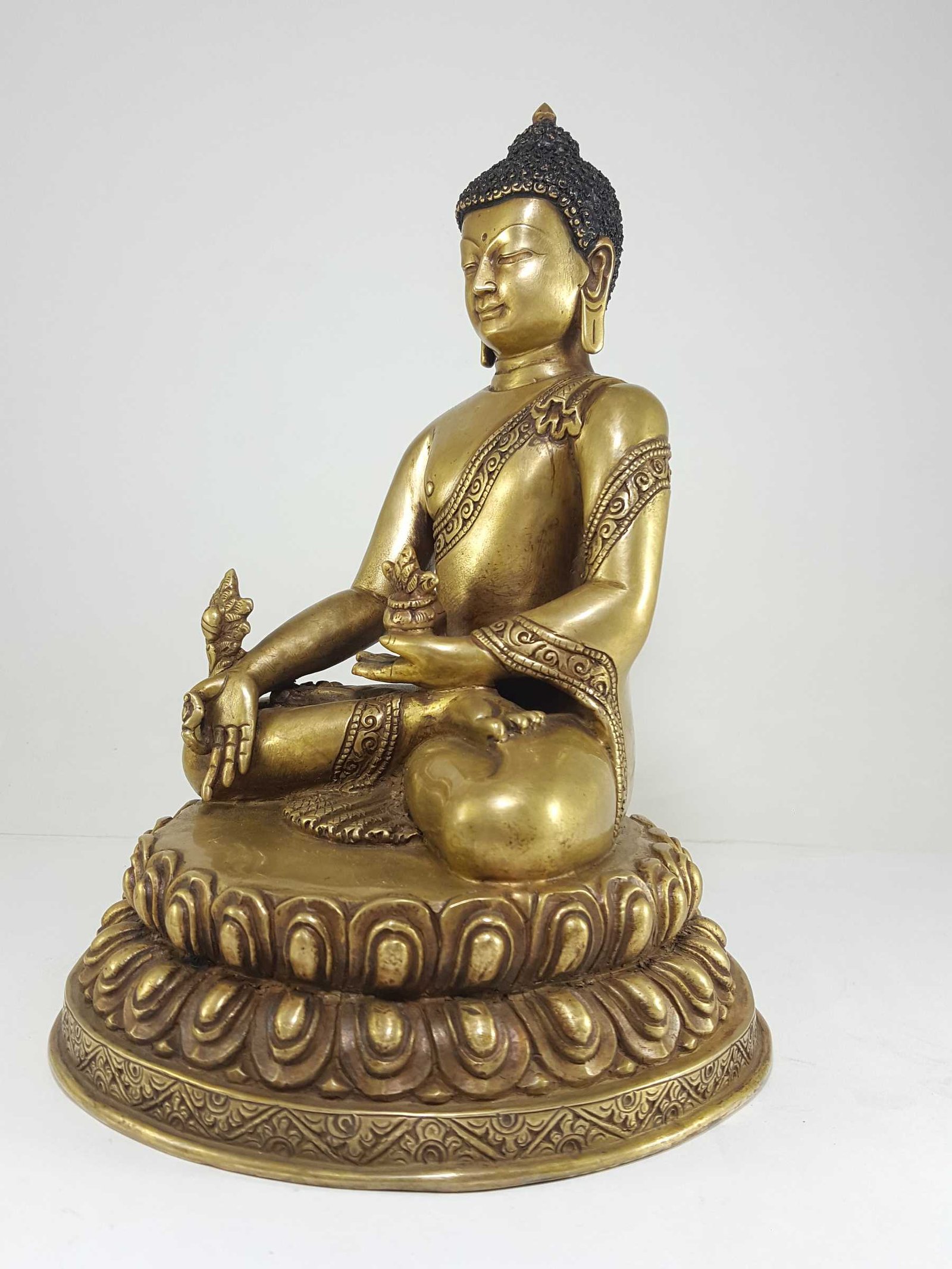 Unique High Quality Statue of Medicine Buddha with Double Lotus Base and Newari Statue, Bronze Finishing , Healer of physical and spiritual ailments, bringer of health and peace