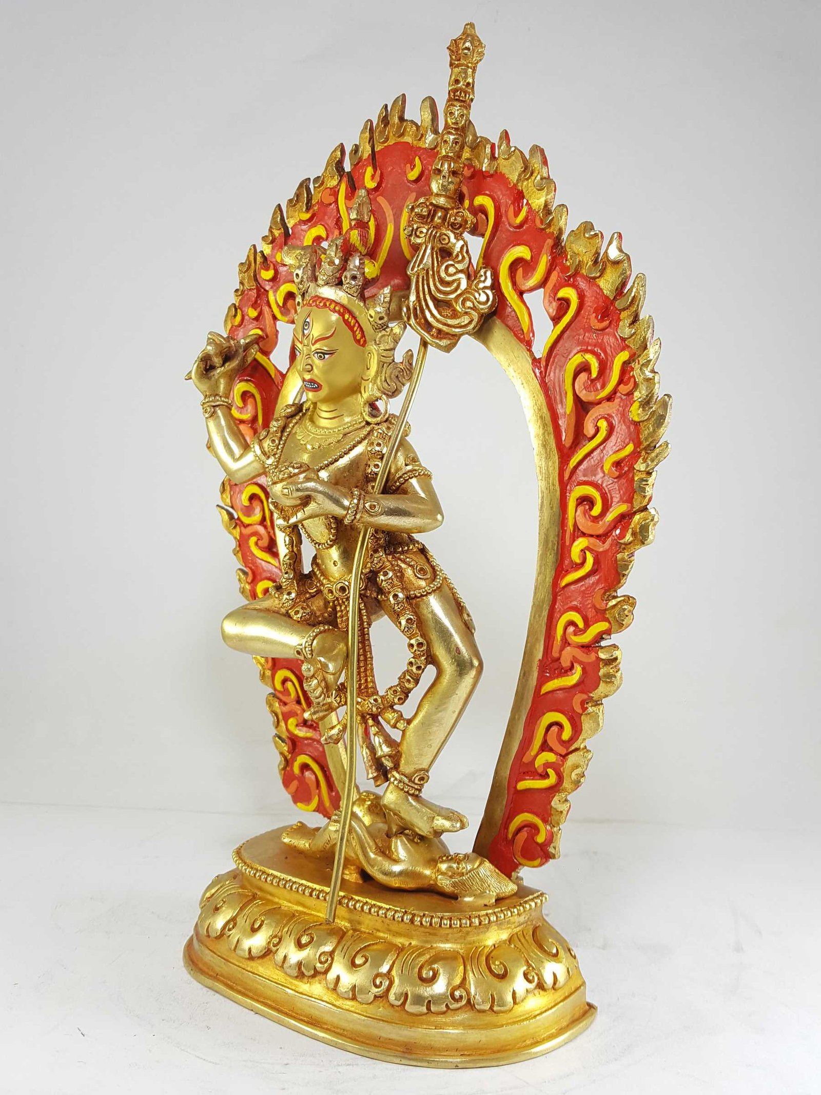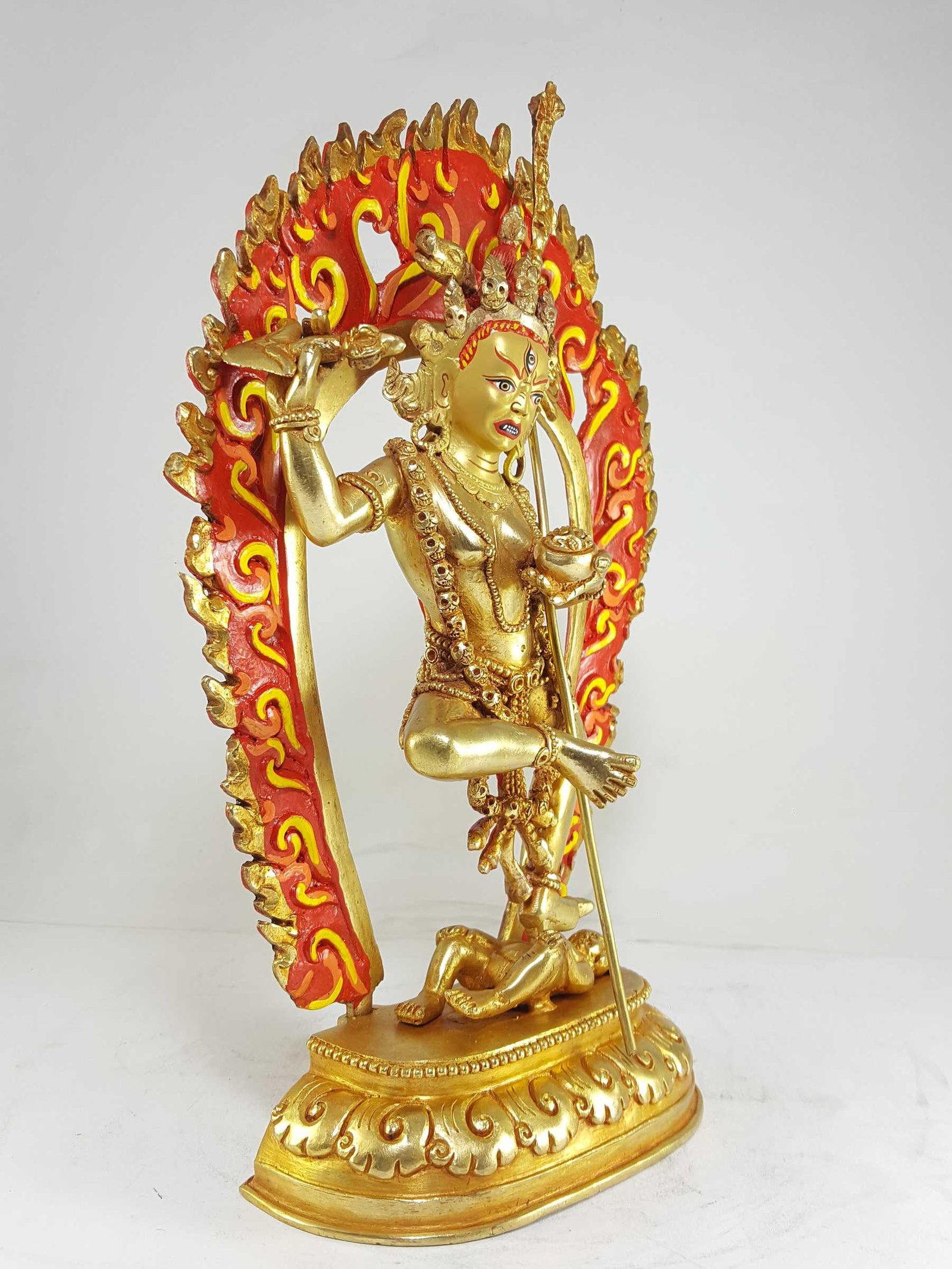 The face of Vajravarahi is painted with gold to enhance its significant features, particularly the eyes, and lips. This detailed painting is essential as it brings forth the crucial attributes of the expression of eyes and lips that metal carving alone cannot capture.