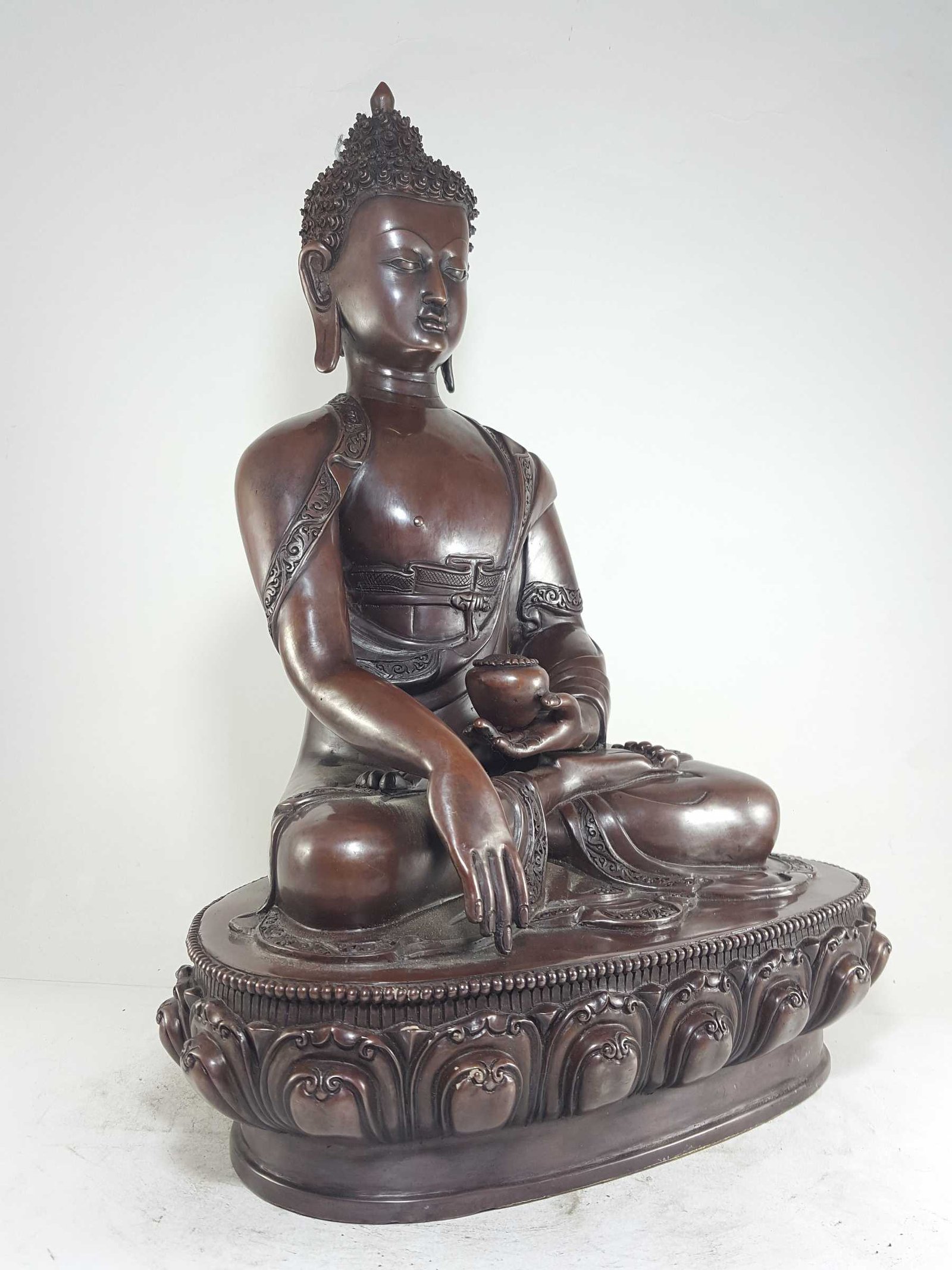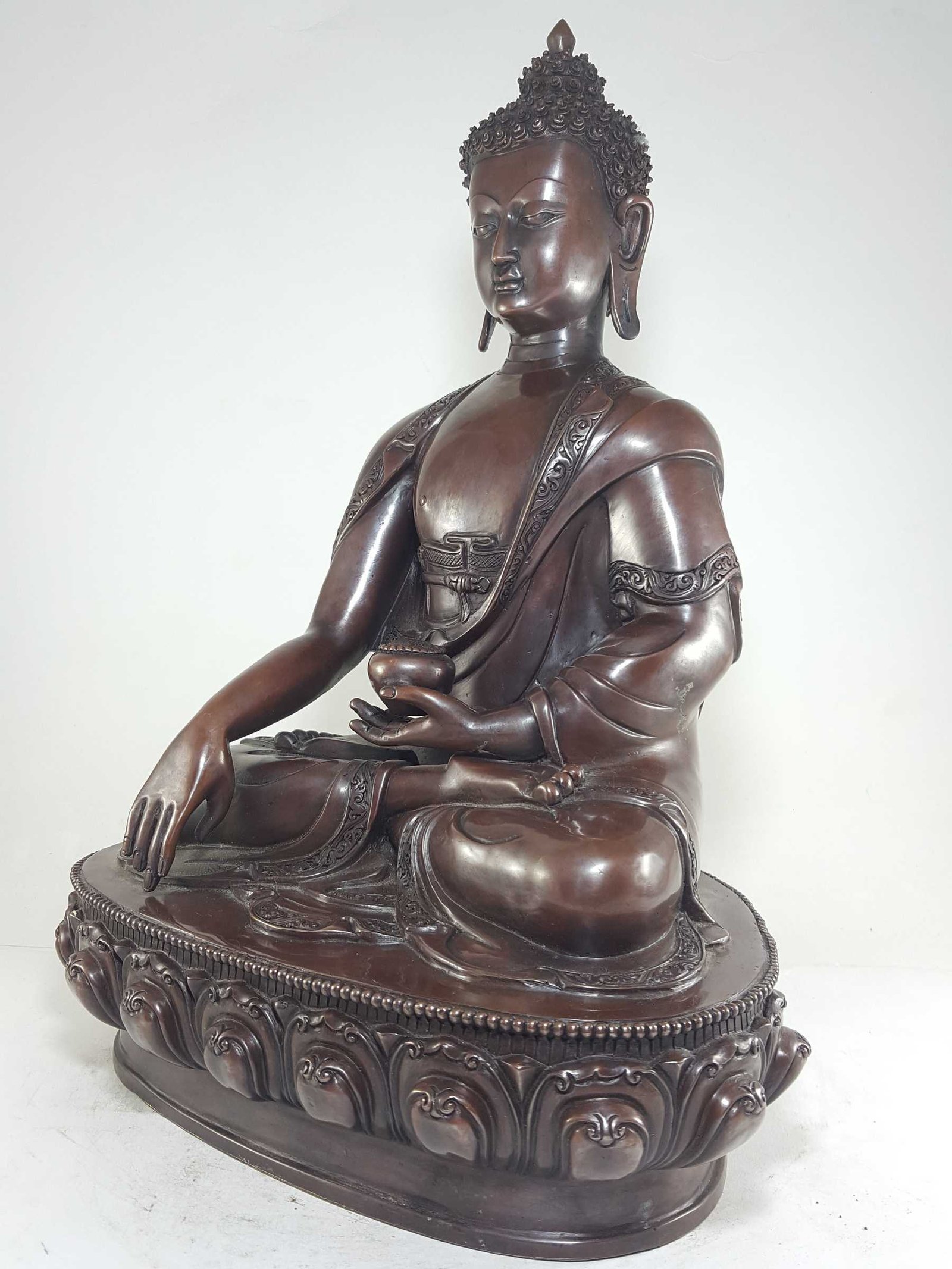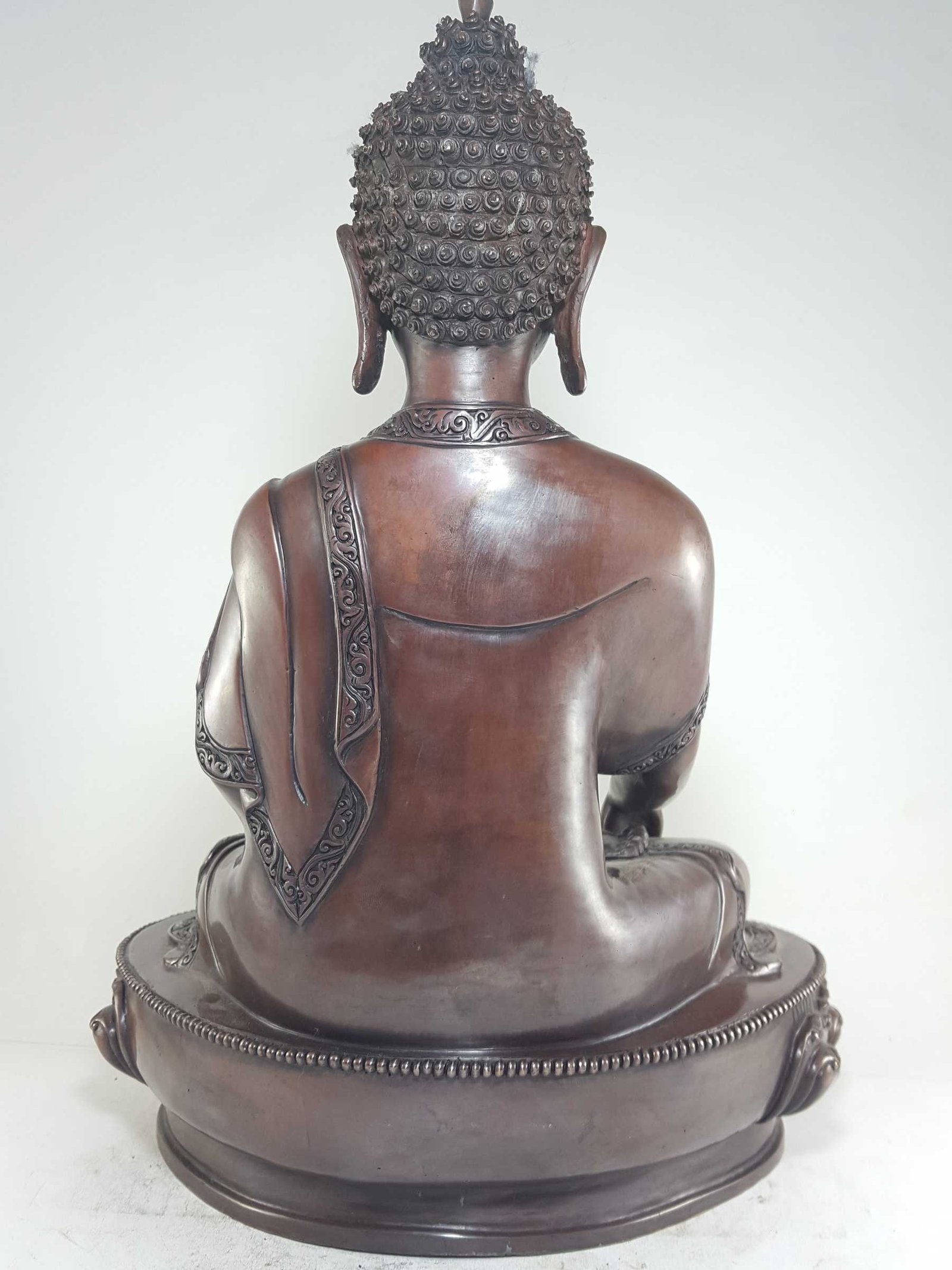 This Shakyamuni Buddha has been meticulously treated with a chocolate color antique patina. The intention behind this patina is to replicate the appearance of a copper statue that has gracefully aged over a century. Unlike a simple coat of paint, this patina is not applied superficially and is designed to endure. It undergoes an artificial oxidation process that adds depth and character, while also serving as a protective layer against natural oxidation.