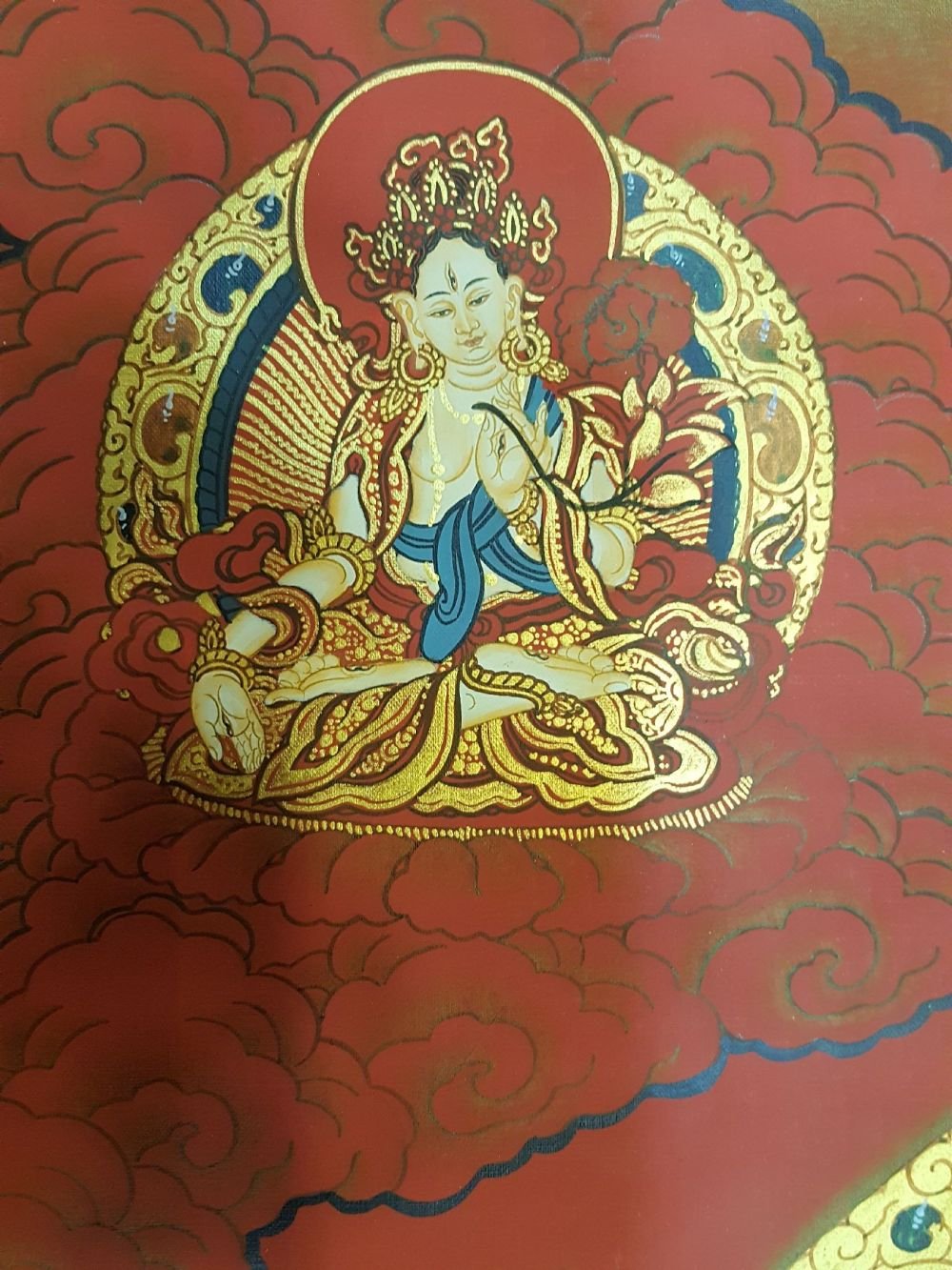 The first two, the inner arms, have palms joined at the heart, holding a sky-blue, and wish fulfilling jewel. This symbolizes that in whatever way Chenrezig manifests to benefit beings, the quality of Chenrezig's mind is never separate from the all-pervasive primal wisdom.