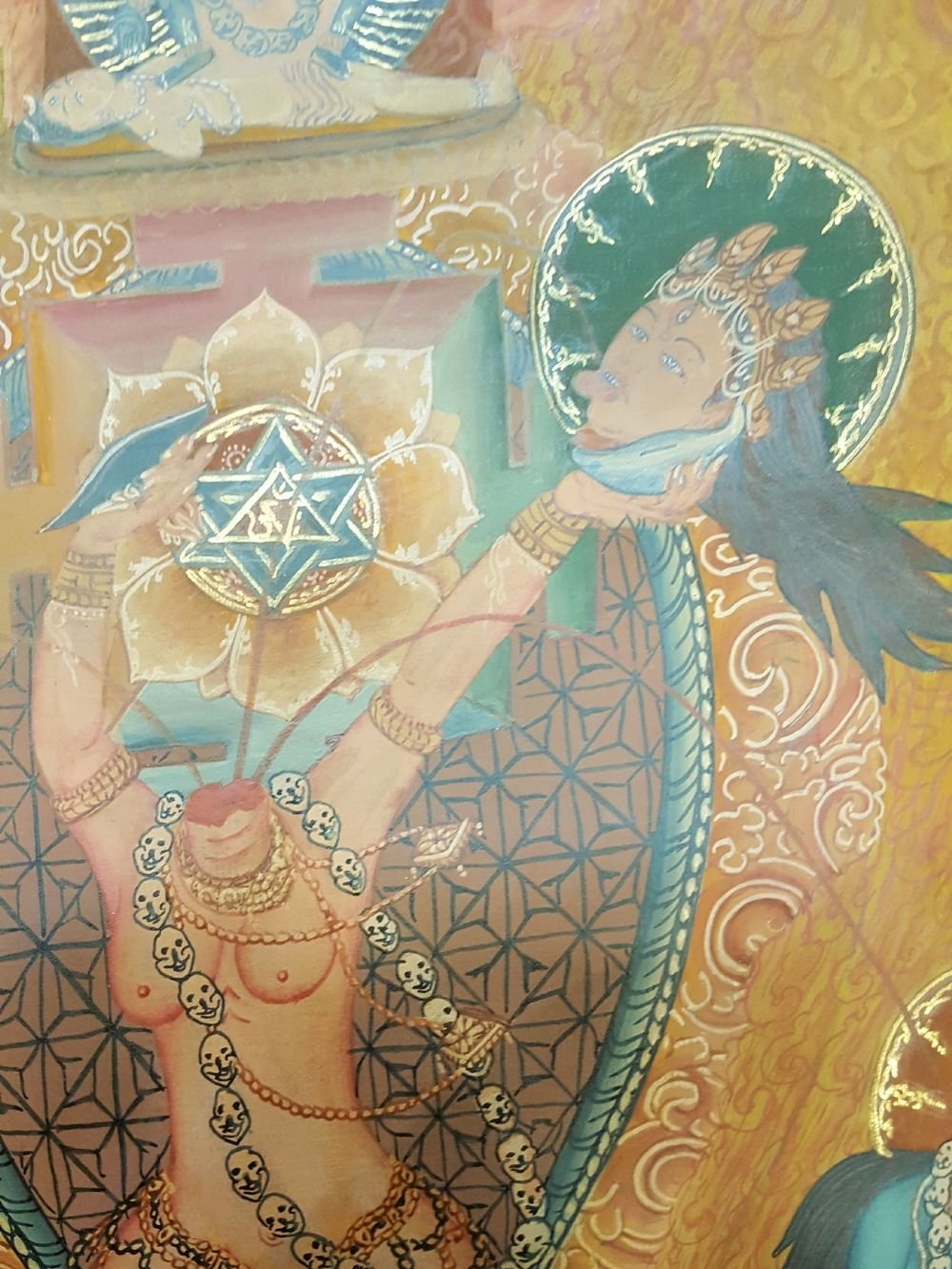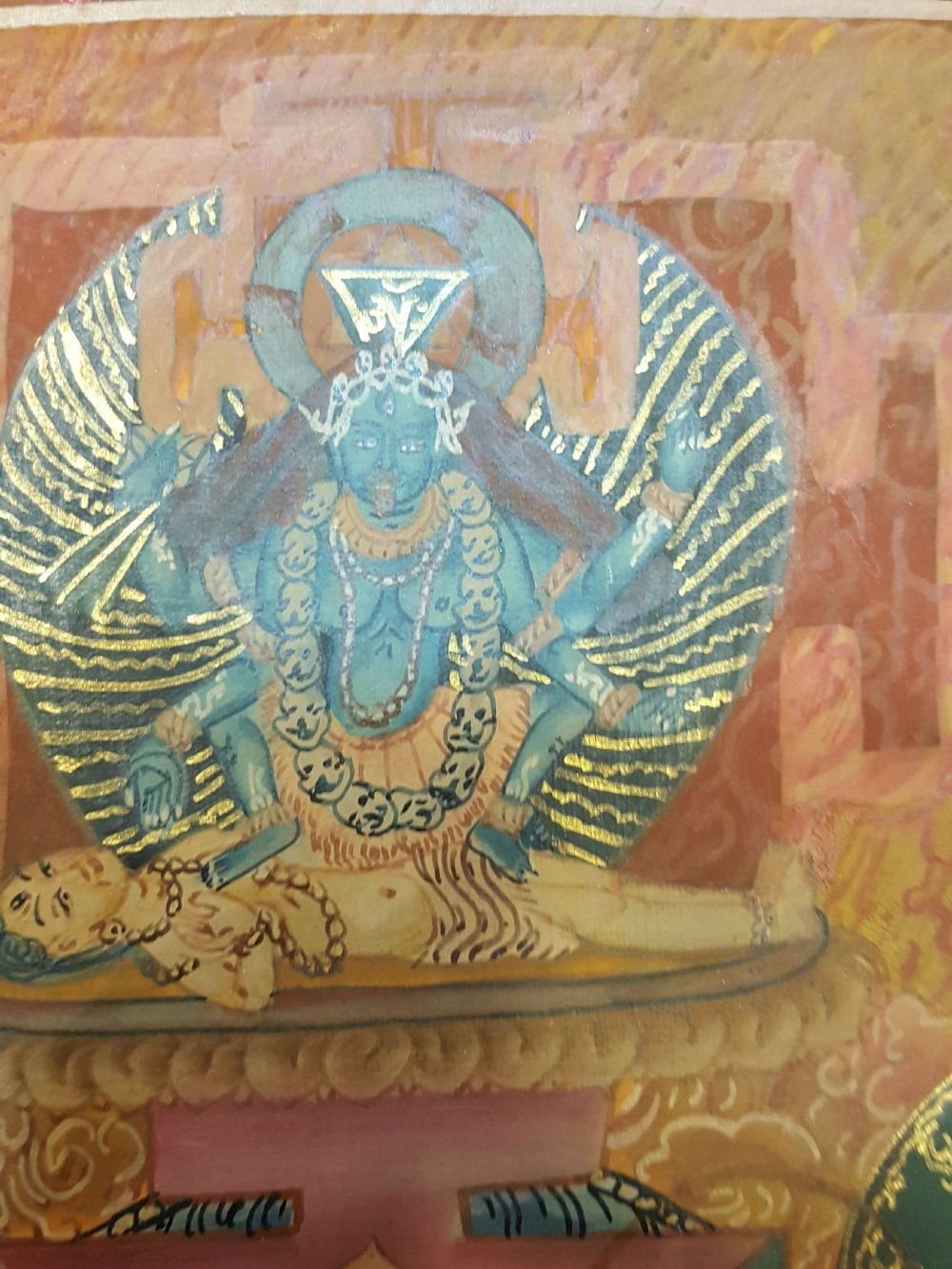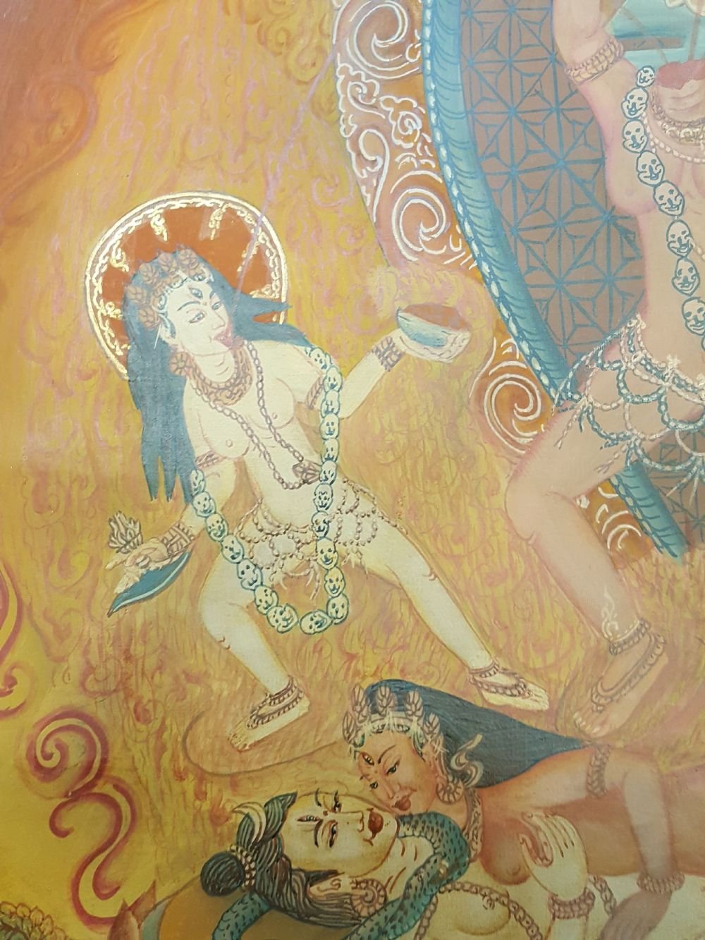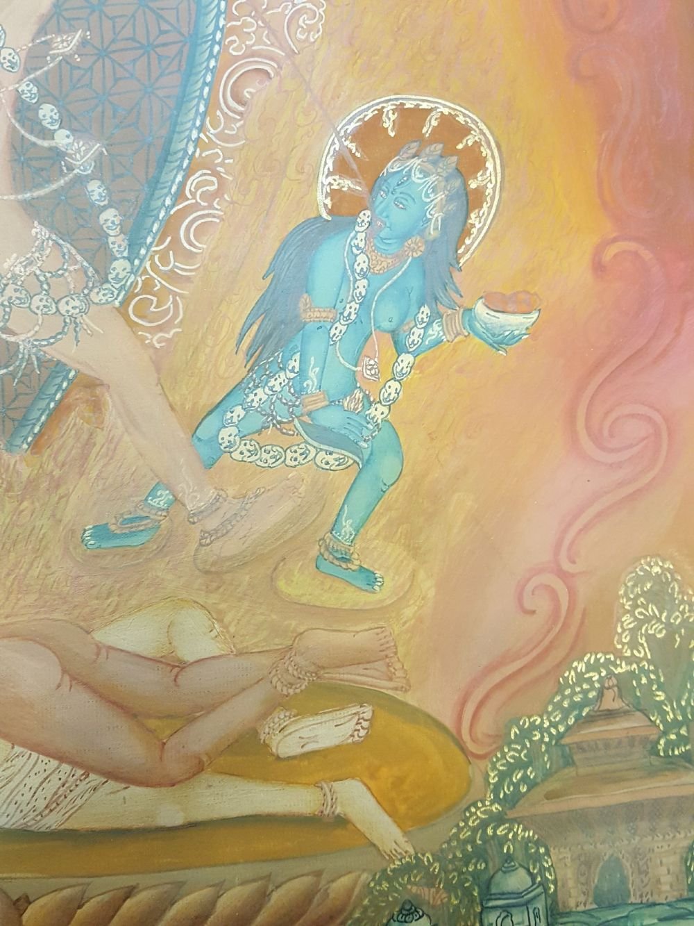 This Chhinnamasta is a newari thangka or Paubaha, Paubha, also known as "paubhas," is a traditional religious painting created by the Newar people of Nepal. These exquisite artworks depict various subjects, including deities, mandalas, and monuments, and serve as aids for meditation and spiritual practices. Paubhas are similar to Tibetan Thangka paintings and are highly regarded for their religious and cultural significance.