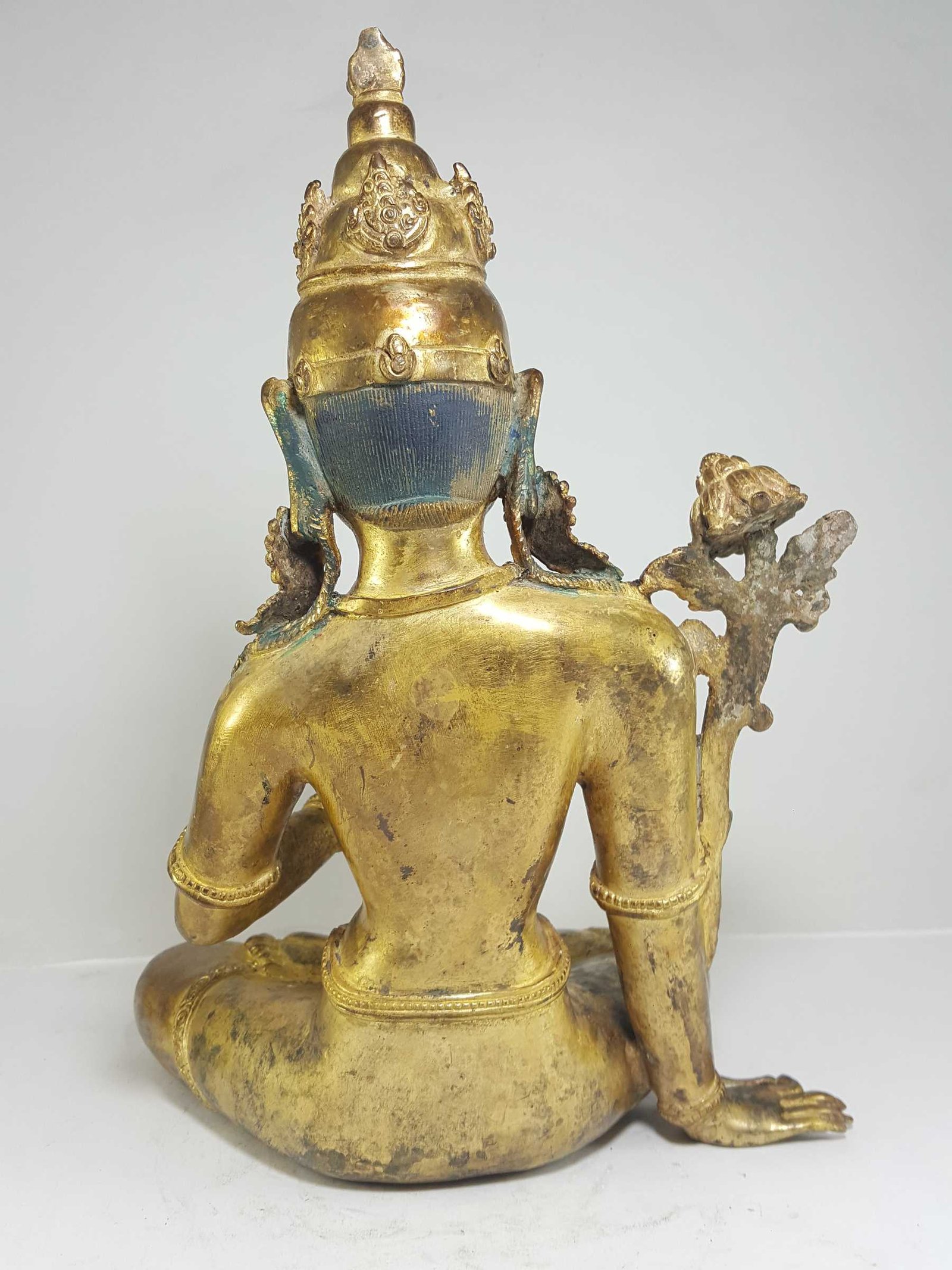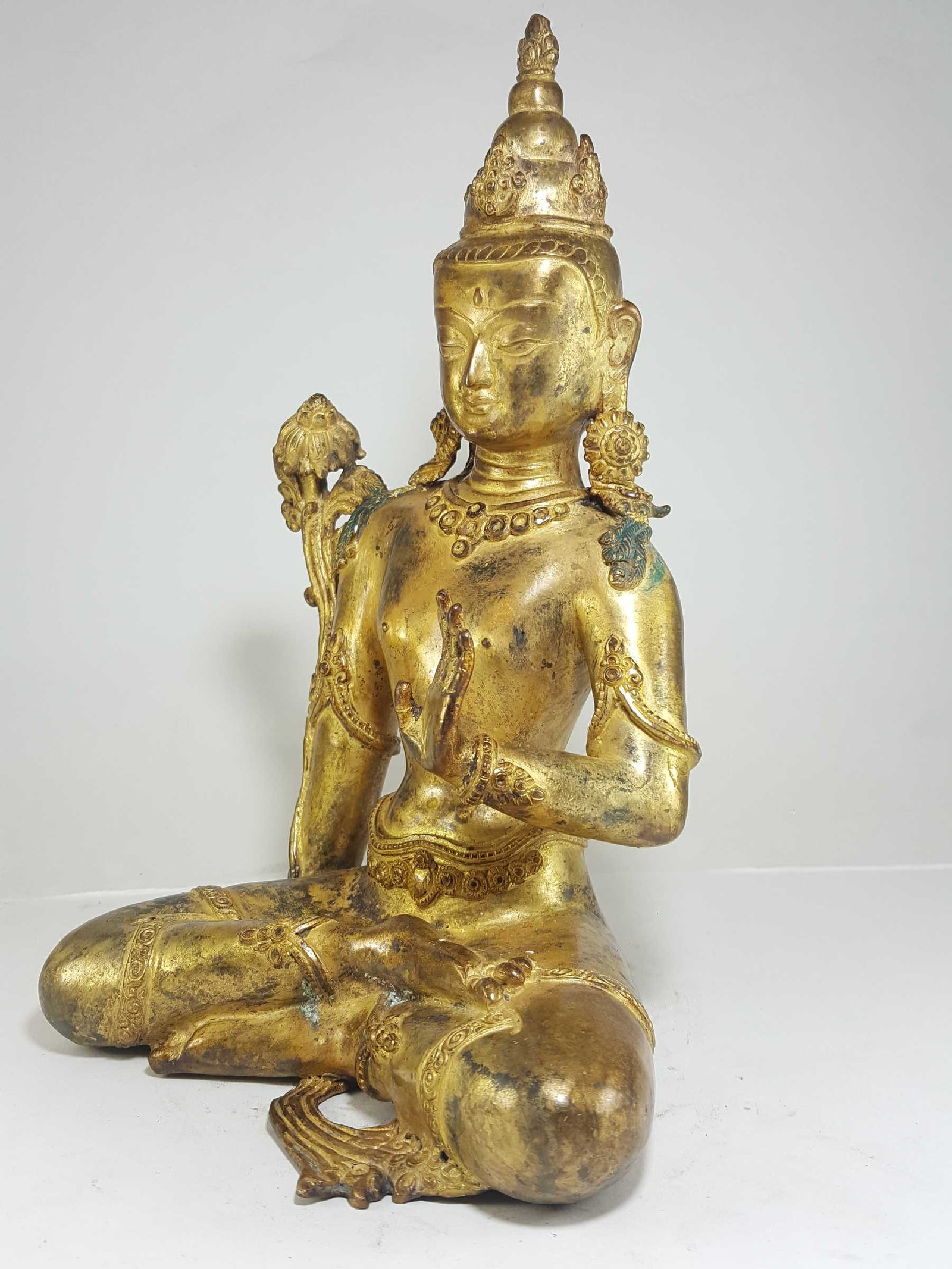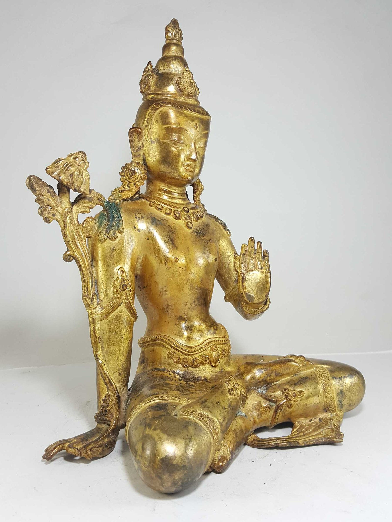 The Bodhisattva has full gold plated antique finishing. This finishing is a combination of fire mercury gold plating and antique finishing. This traditional technique involves the application of a genuine layer of gold onto the Bodhisattva using the time-honored process of mercury gold plating. Skilled artisans meticulously handle the amalgamation of gold with mercury, ensuring precise application and a truly authentic result. To enhance its charm further, the Bodhisattva undergoes an antique finishing process. This meticulous treatment adds a touch of age and character to the gold plating, creating a sense of antiquity. Through careful craftsmanship and the application of specialized techniques, the Bodhisattva acquires a beautifully aged appearance that adds depth and uniqueness to its overall aesthetic. Read More