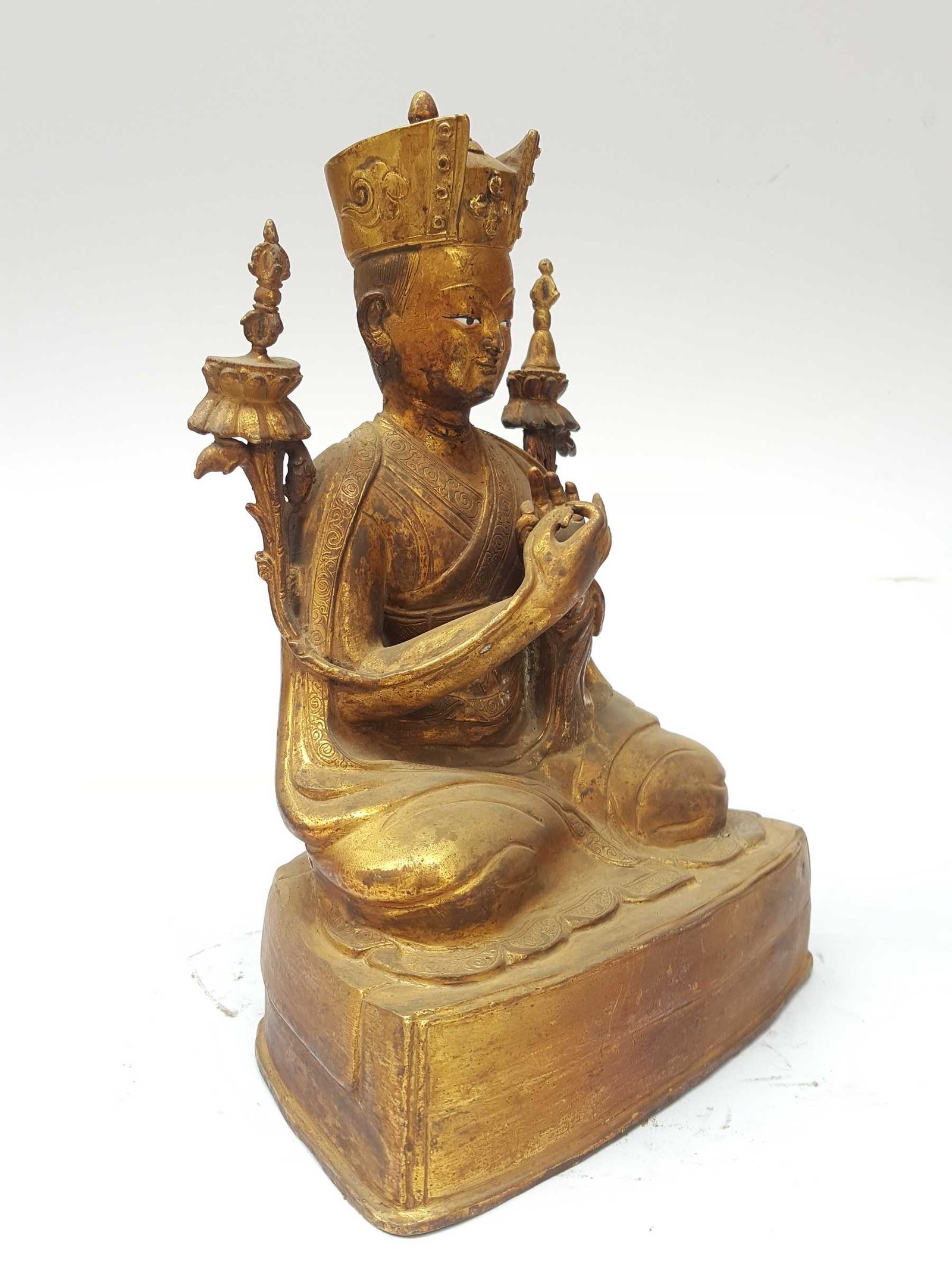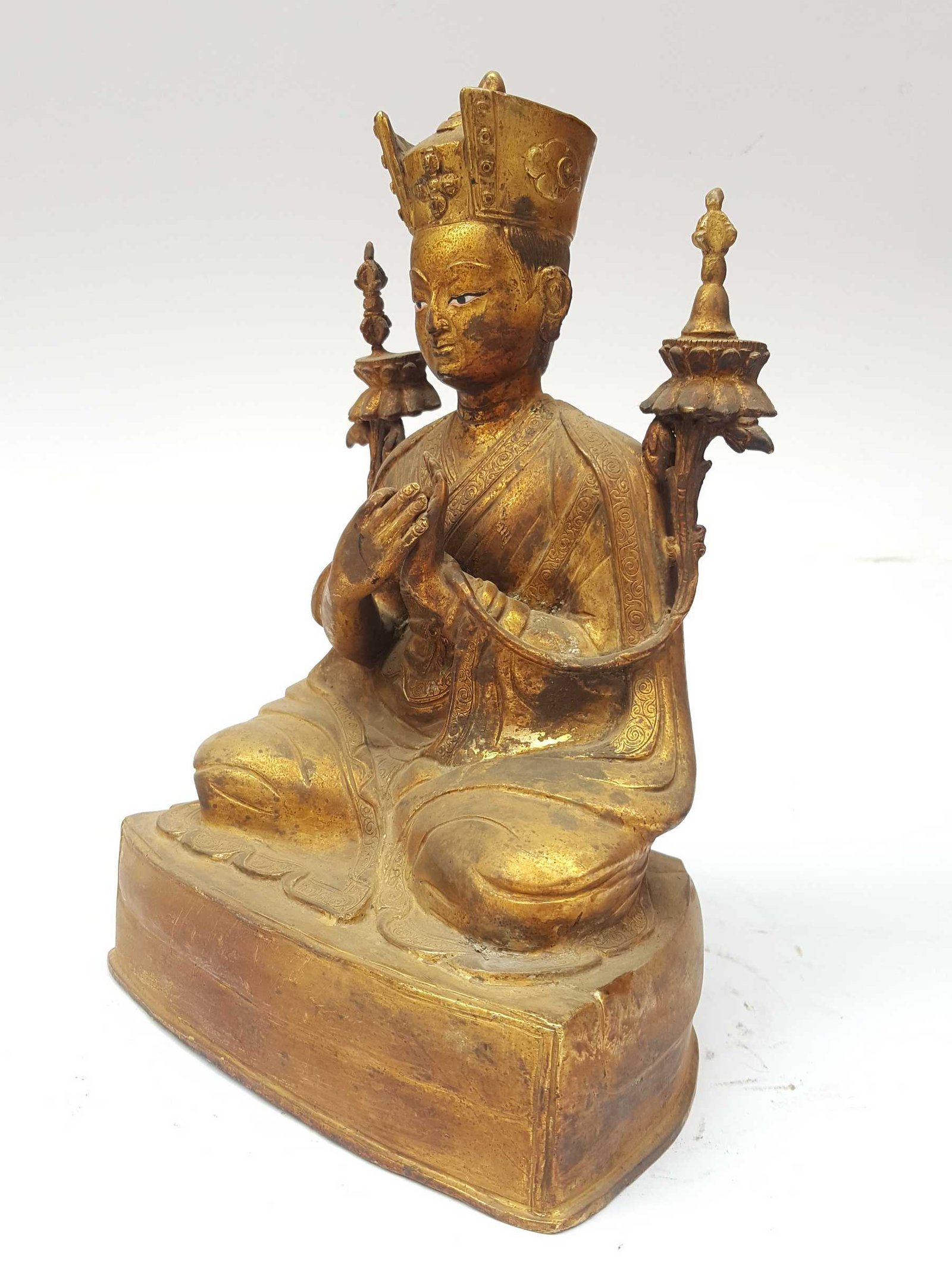The Karmapa has full gold plated antique finishing. This finishing is a combination of fire mercury gold plating and antique finishing. This traditional technique involves the application of a genuine layer of gold onto the Karmapa using the time-honored process of mercury gold plating. Skilled artisans meticulously handle the amalgamation of gold with mercury, ensuring precise application and a truly authentic result. To enhance its charm further, the Karmapa undergoes an antique finishing process. This meticulous treatment adds a touch of age and character to the gold plating, creating a sense of antiquity. Through careful craftsmanship and the application of specialized techniques, the Karmapa acquires a beautifully aged appearance that adds depth and uniqueness to its overall aesthetic. Read More