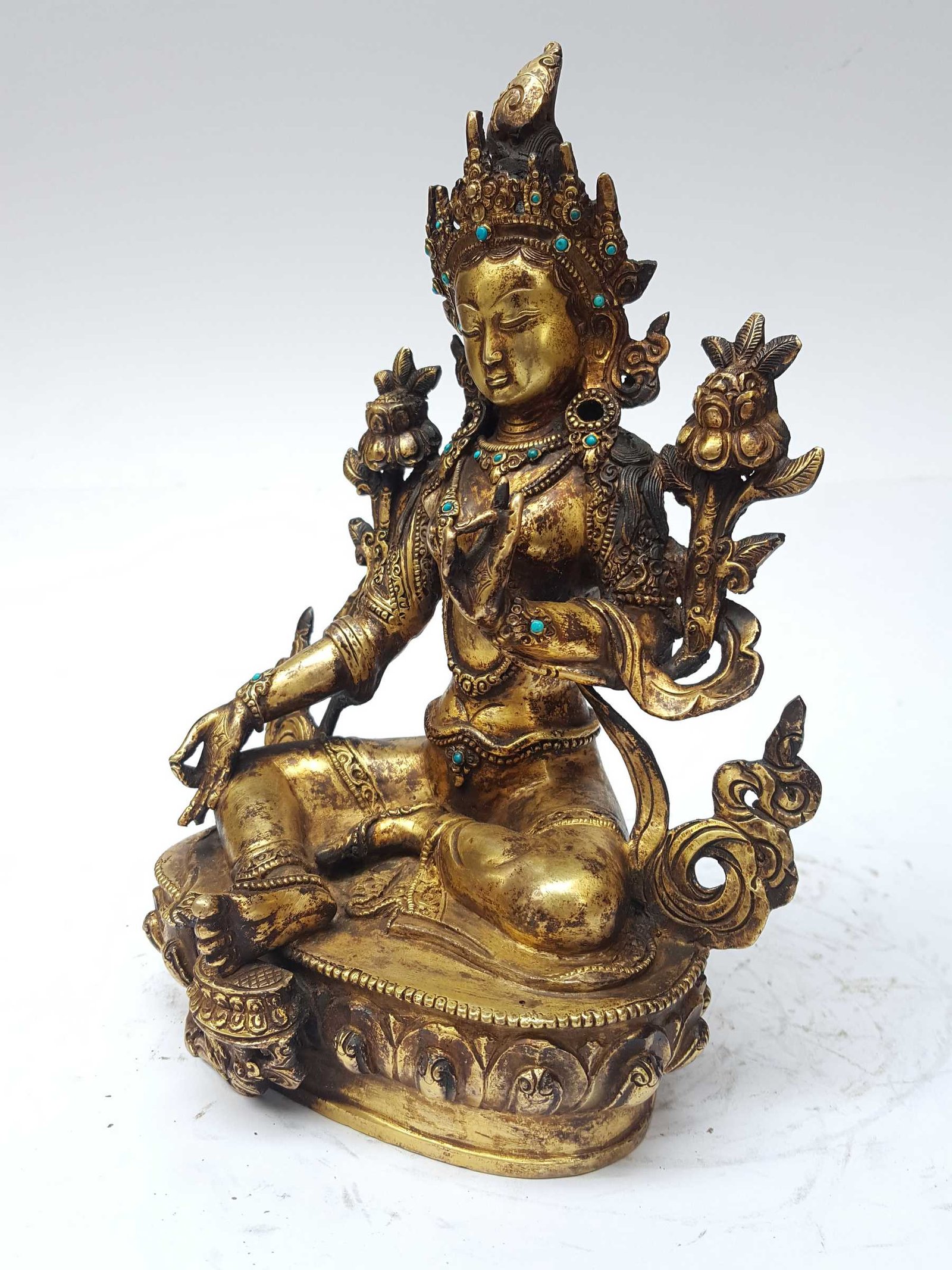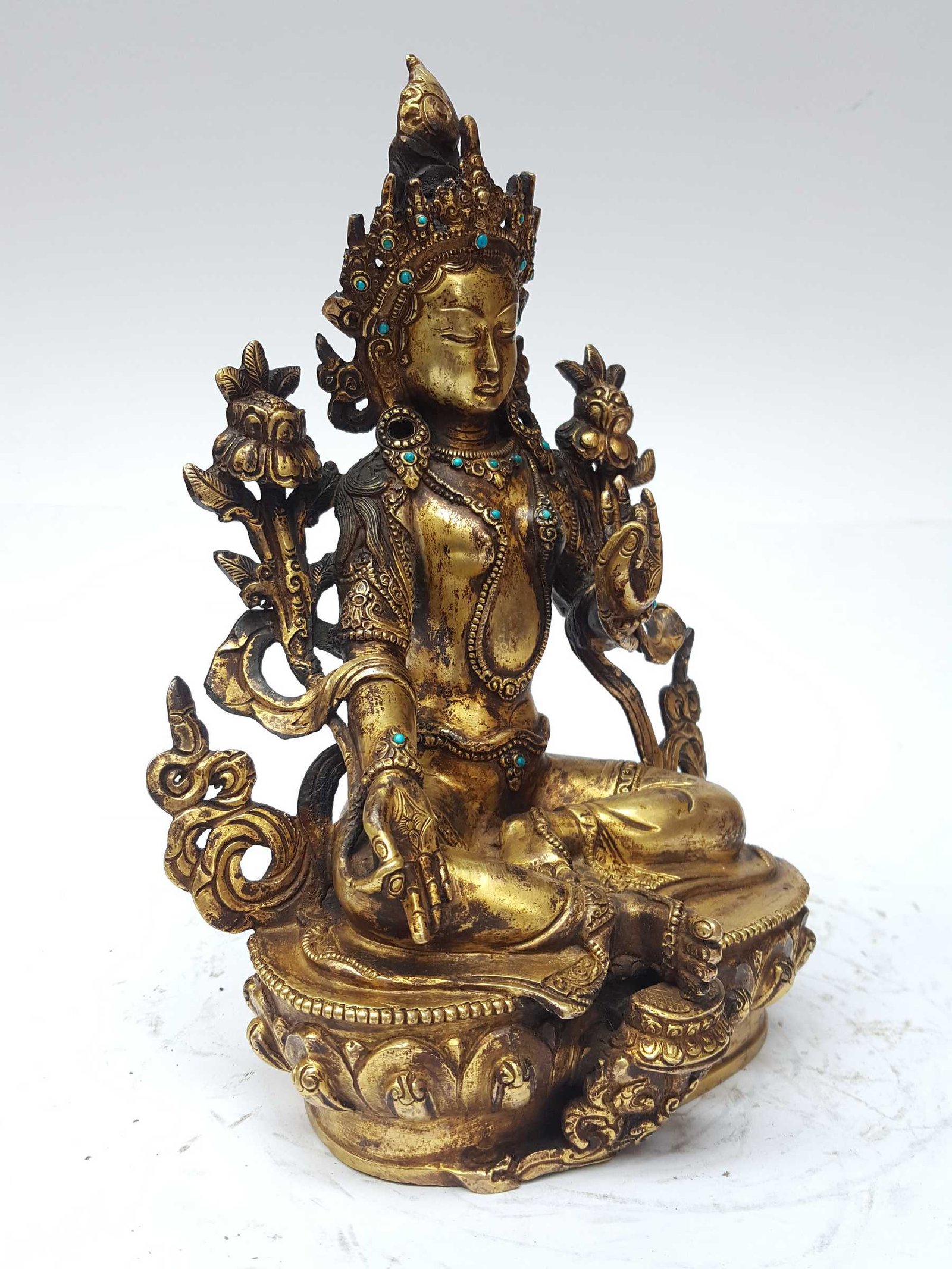 Statue of Green Tara Full Fire Gold Plated, and Antique Finishing , Goddess of Compassion, Protection, and Swift Action