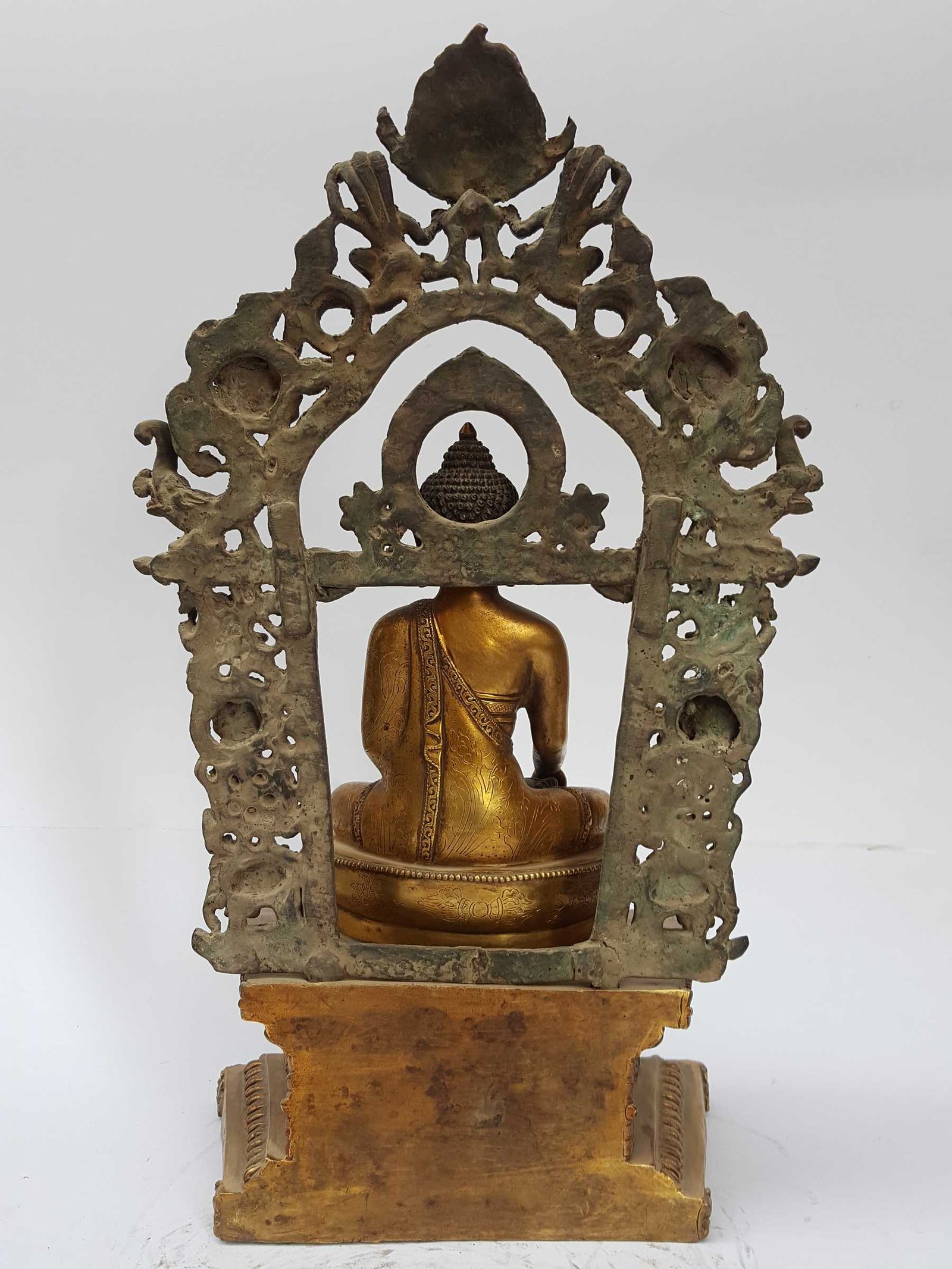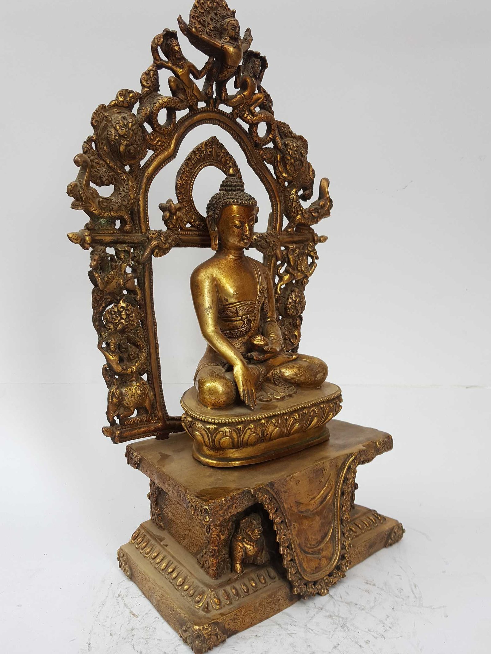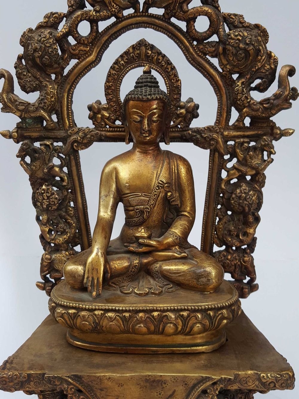 The Shakyamuni Buddha has full gold plated antique finishing. This finishing is a combination of fire mercury gold plating and antique finishing. This traditional technique involves the application of a genuine layer of gold onto the Shakyamuni Buddha using the time-honored process of mercury gold plating. Skilled artisans meticulously handle the amalgamation of gold with mercury, ensuring precise application and a truly authentic result. To enhance its charm further, the Shakyamuni Buddha undergoes an antique finishing process. This meticulous treatment adds a touch of age and character to the gold plating, creating a sense of antiquity. Through careful craftsmanship and the application of specialized techniques, the Shakyamuni Buddha acquires a beautifully aged appearance that adds depth and uniqueness to its overall aesthetic. Read More