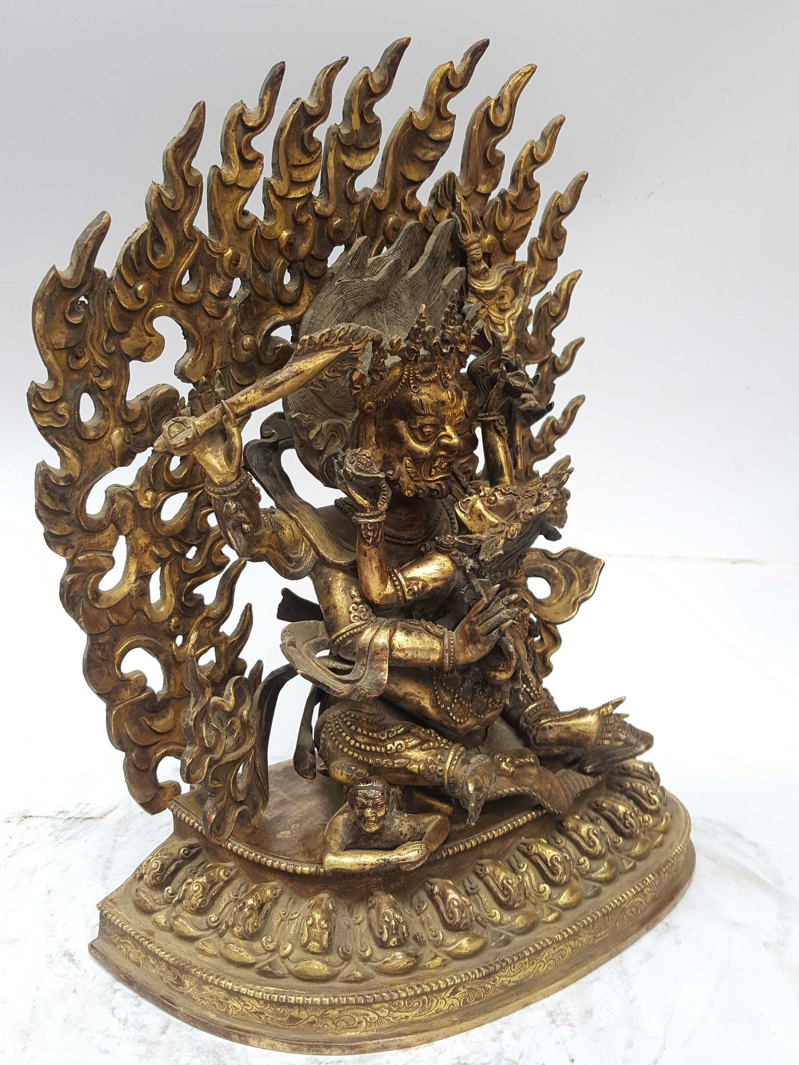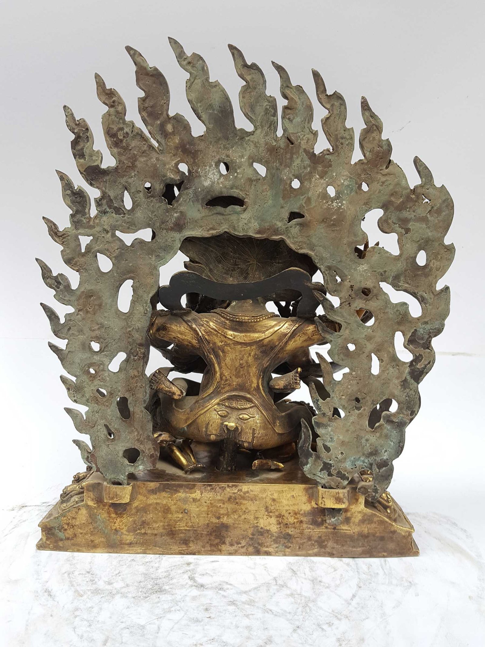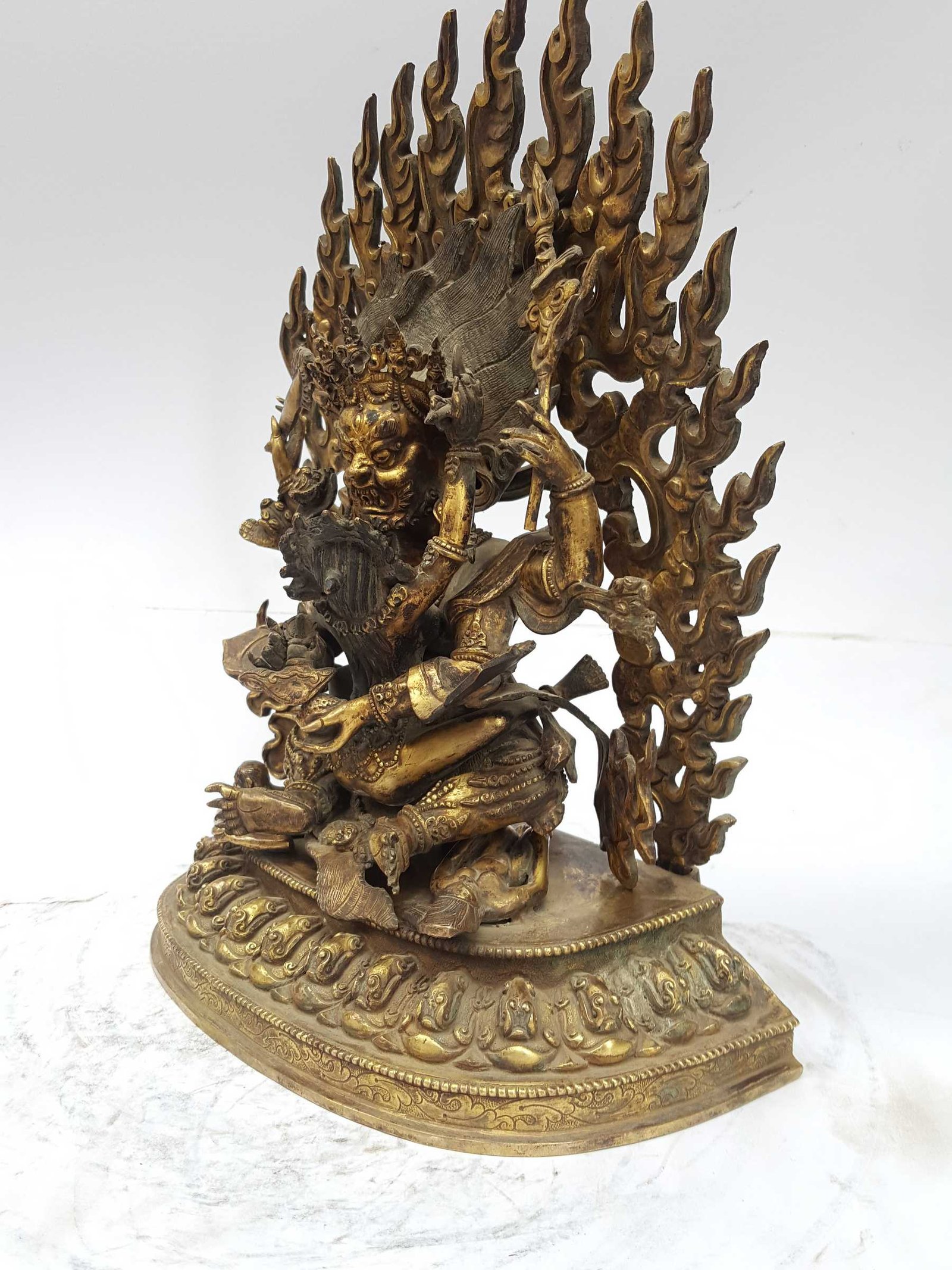 The Mahakala Four Arms has full gold plated antique finishing. This finishing is a combination of fire mercury gold plating and antique finishing. This traditional technique involves the application of a genuine layer of gold onto the Mahakala Four Arms using the time-honored process of mercury gold plating. Skilled artisans meticulously handle the amalgamation of gold with mercury, ensuring precise application and a truly authentic result. To enhance its charm further, the Mahakala Four Arms undergoes an antique finishing process. This meticulous treatment adds a touch of age and character to the gold plating, creating a sense of antiquity. Through careful craftsmanship and the application of specialized techniques, the Mahakala Four Arms acquires a beautifully aged appearance that adds depth and uniqueness to its overall aesthetic. Read More