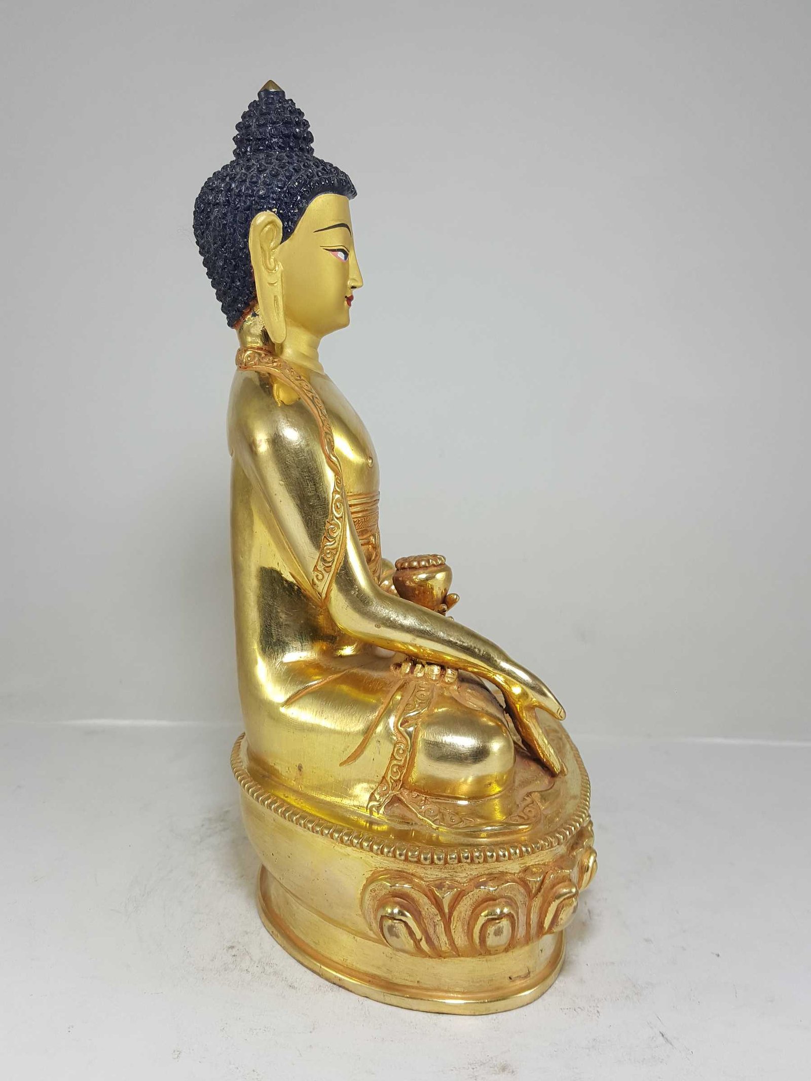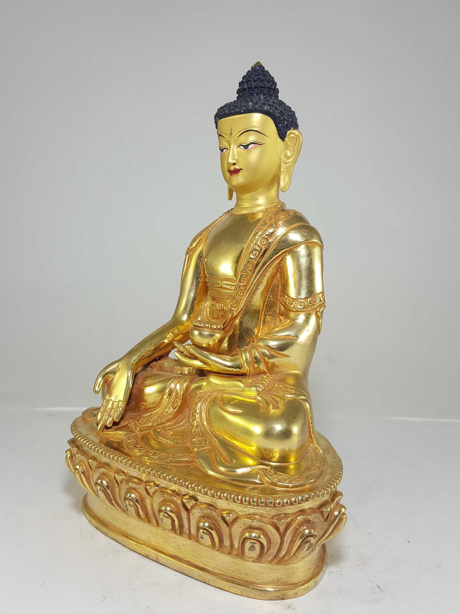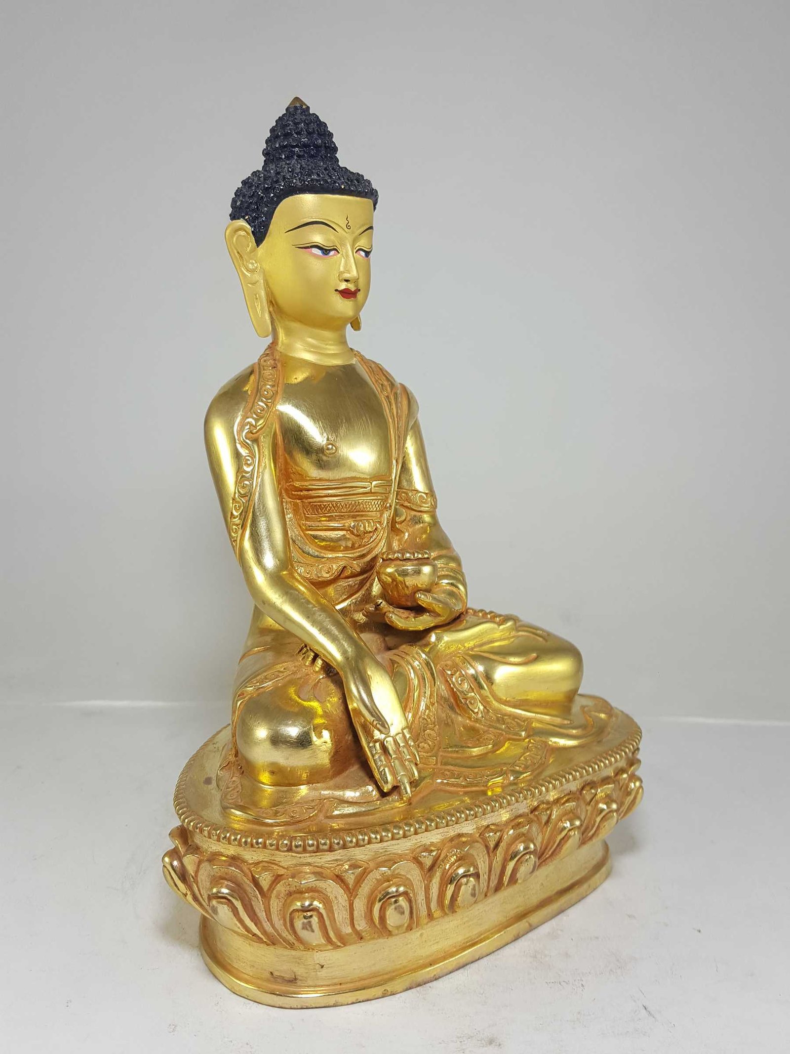This Ratnasambhava Buddha is finished with full gold plating. also known as mercury gold plating or fire gold plating. This traditional technique involves the application of a genuine layer of gold onto the Ratnasambhava Buddha. Referred to as mercury gold plating, it is considered the correct and authentic form of gold plating in Nepal. Despite being more expensive than electroplating, this traditional mercury gold plating is gaining popularity again in Nepal. People are drawn to its authenticity, longevity, and the unmatched beauty it brings to the Ratnasambhava Buddha. The resurgence of interest in this traditional form of gold plating reflects a growing appreciation for the craftsmanship and cultural heritage of Nepal Read More