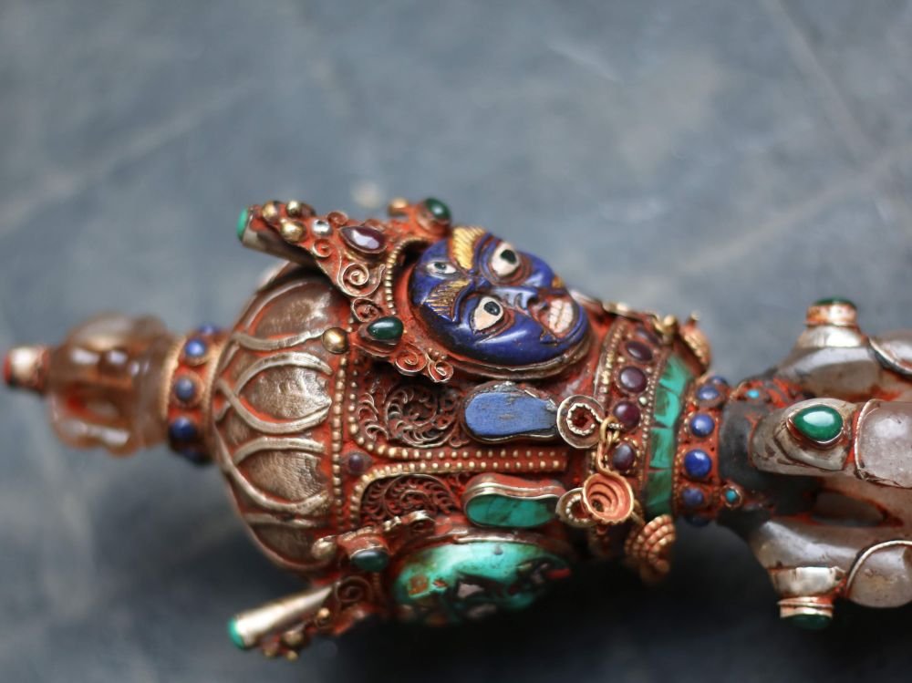 The phurbas of the gubajus are different from those of the jhankris. As a rule, they have only one head on which there is a double vajra as shown here. Gubajus focus on the head as a mirror image of themselves in order to meditatively connect with the power of the phurba. The three or more heads of the upper area of the phurba indicate the collection of energies that the jhankris use.