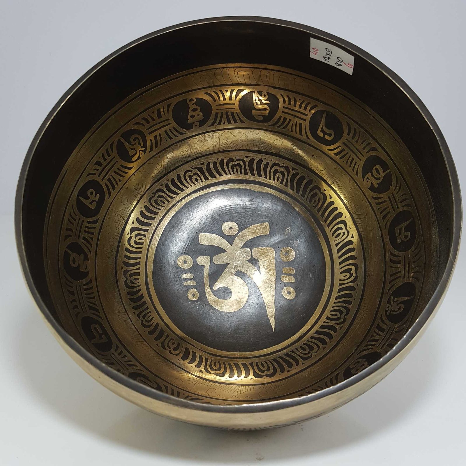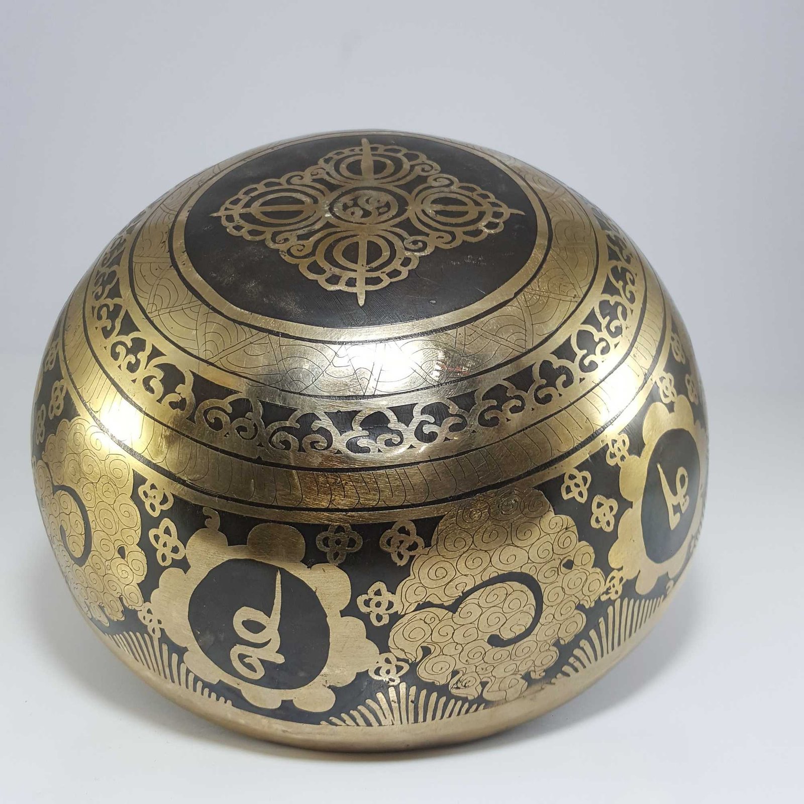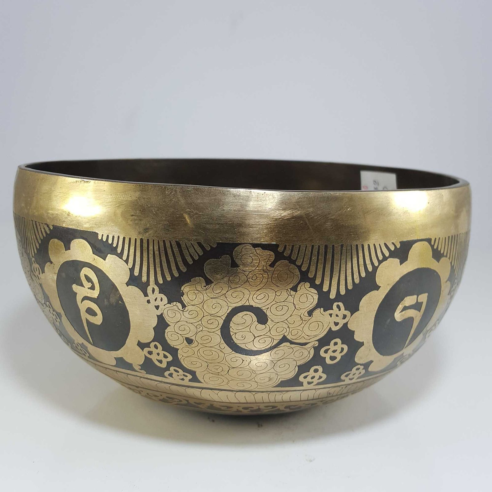 Stock NO : 40 Handmade Beaten Therapy Bowl with Etching and Carving G, Throat Chakra, Select Accessories , A bowl used for meditation and healing, producing a soothing sound that promotes relaxation and mindfulness