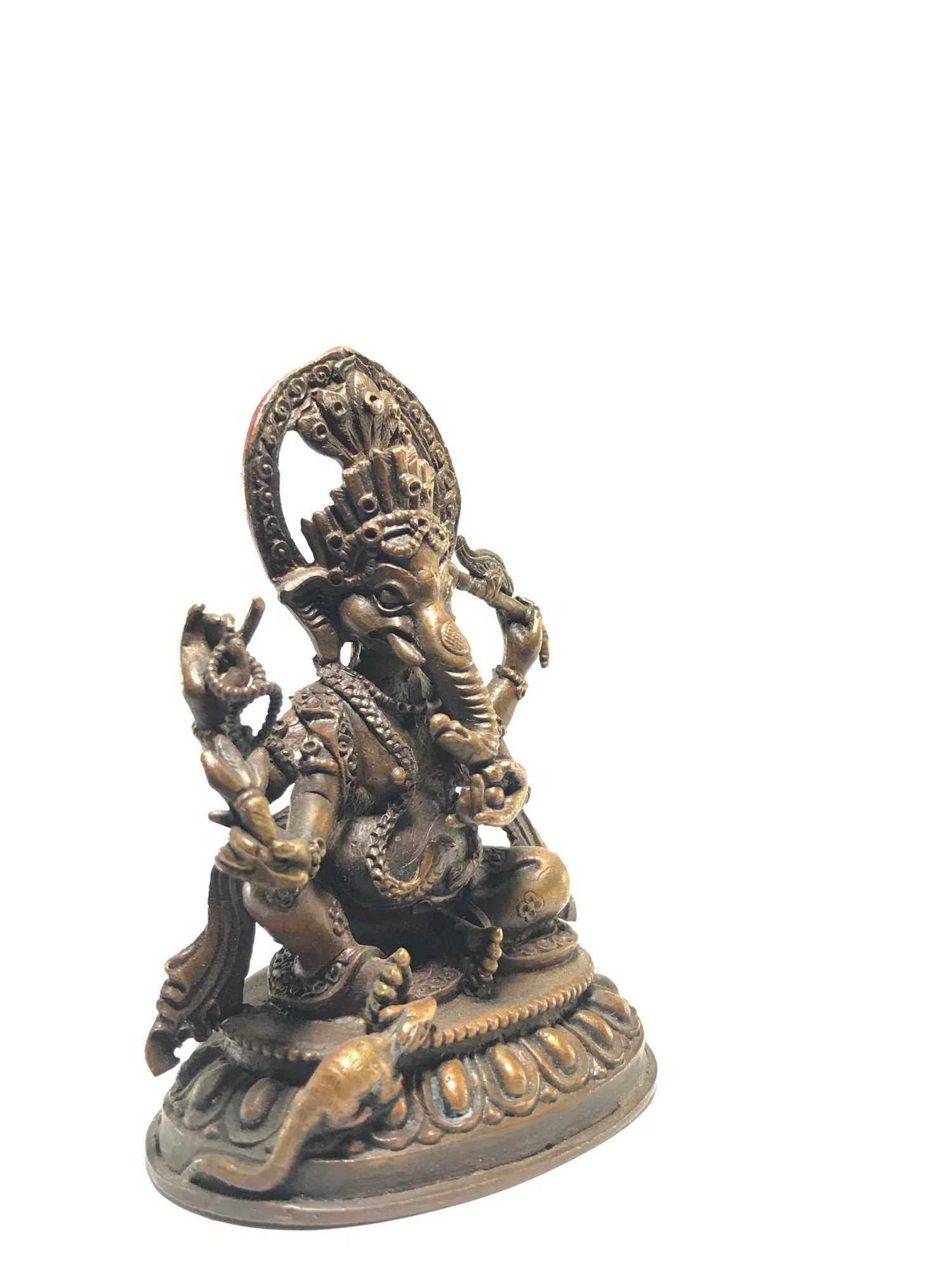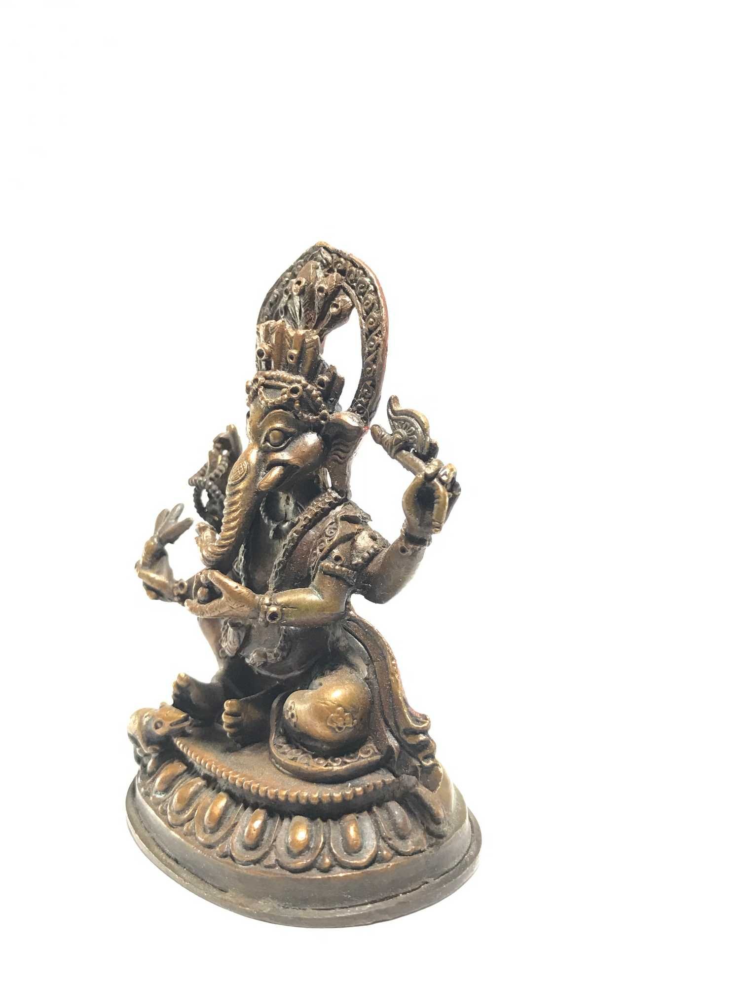This Ganesh has been meticulously treated with a chocolate color antique patina. The intention behind this patina is to replicate the appearance of a copper statue that has gracefully aged over a century. Unlike a simple coat of paint, this patina is not applied superficially and is designed to endure. It undergoes an artificial oxidation process that adds depth and character, while also serving as a protective layer against natural oxidation.