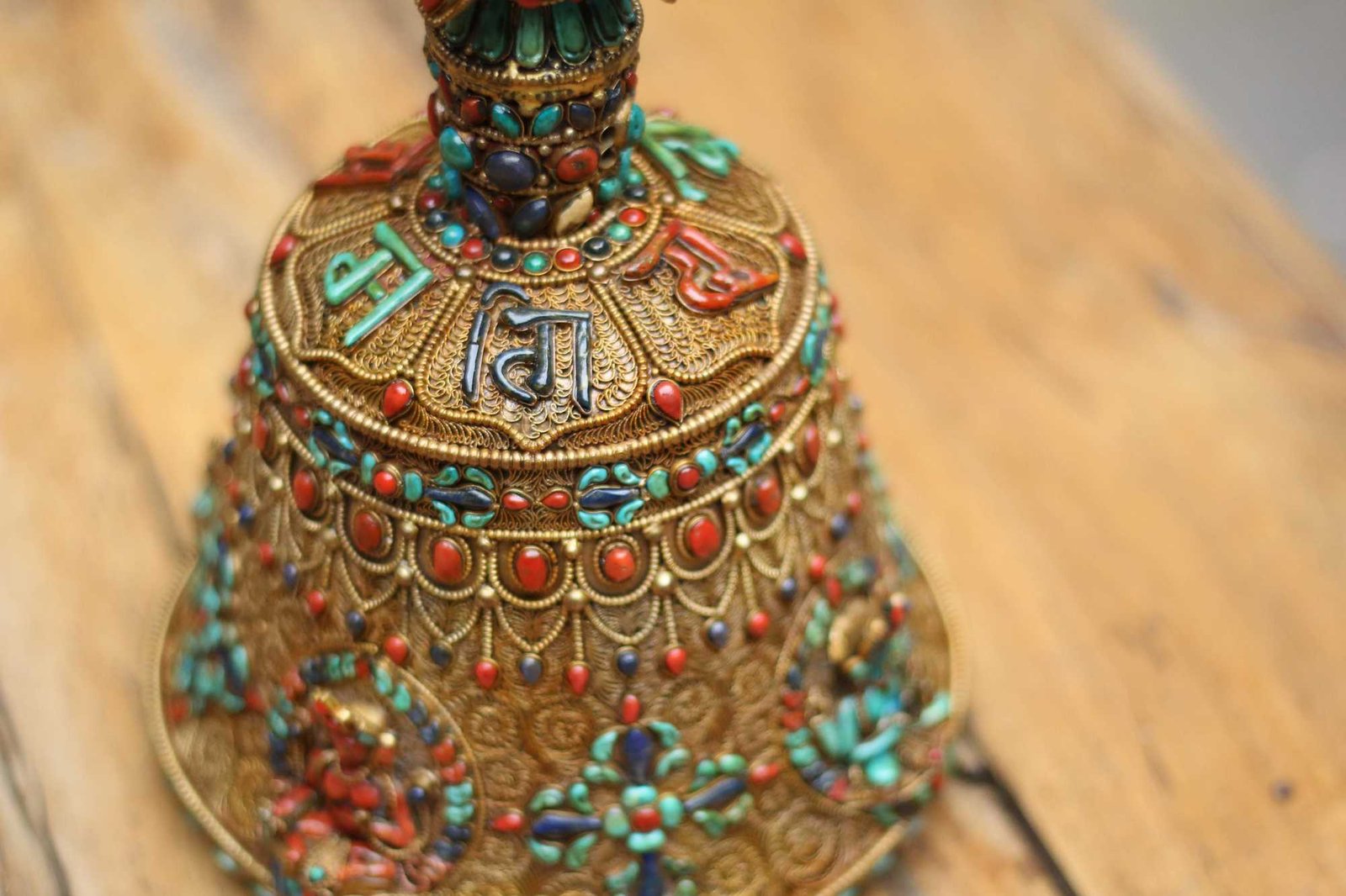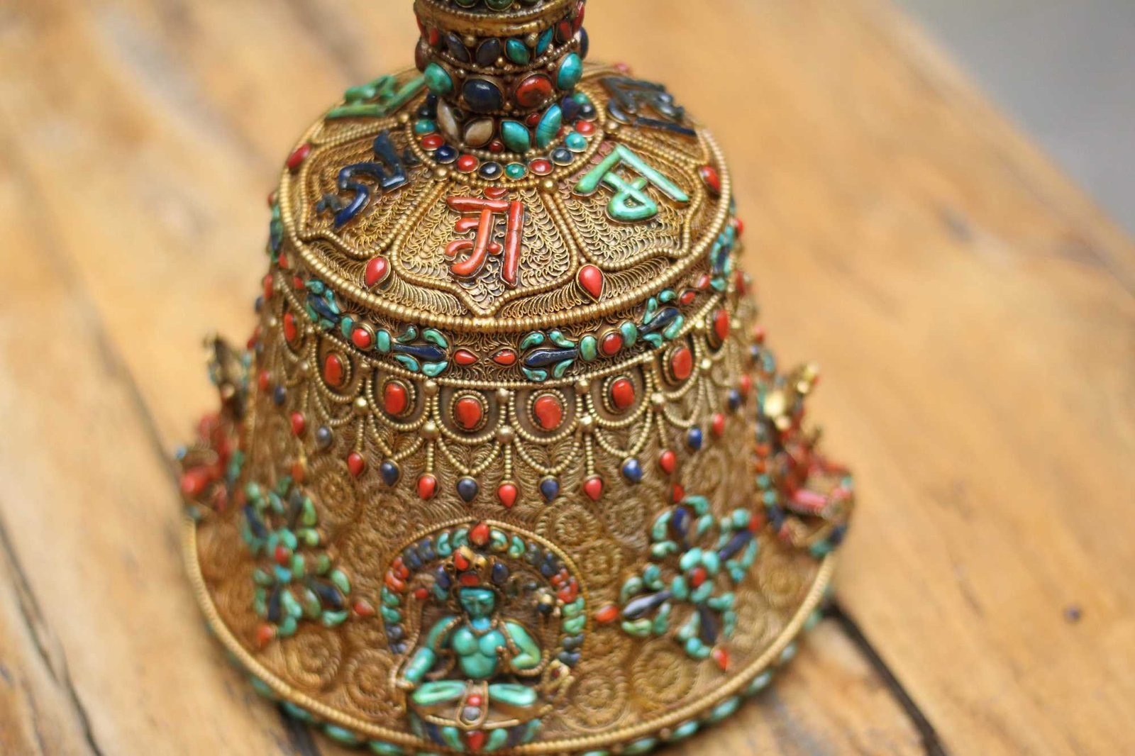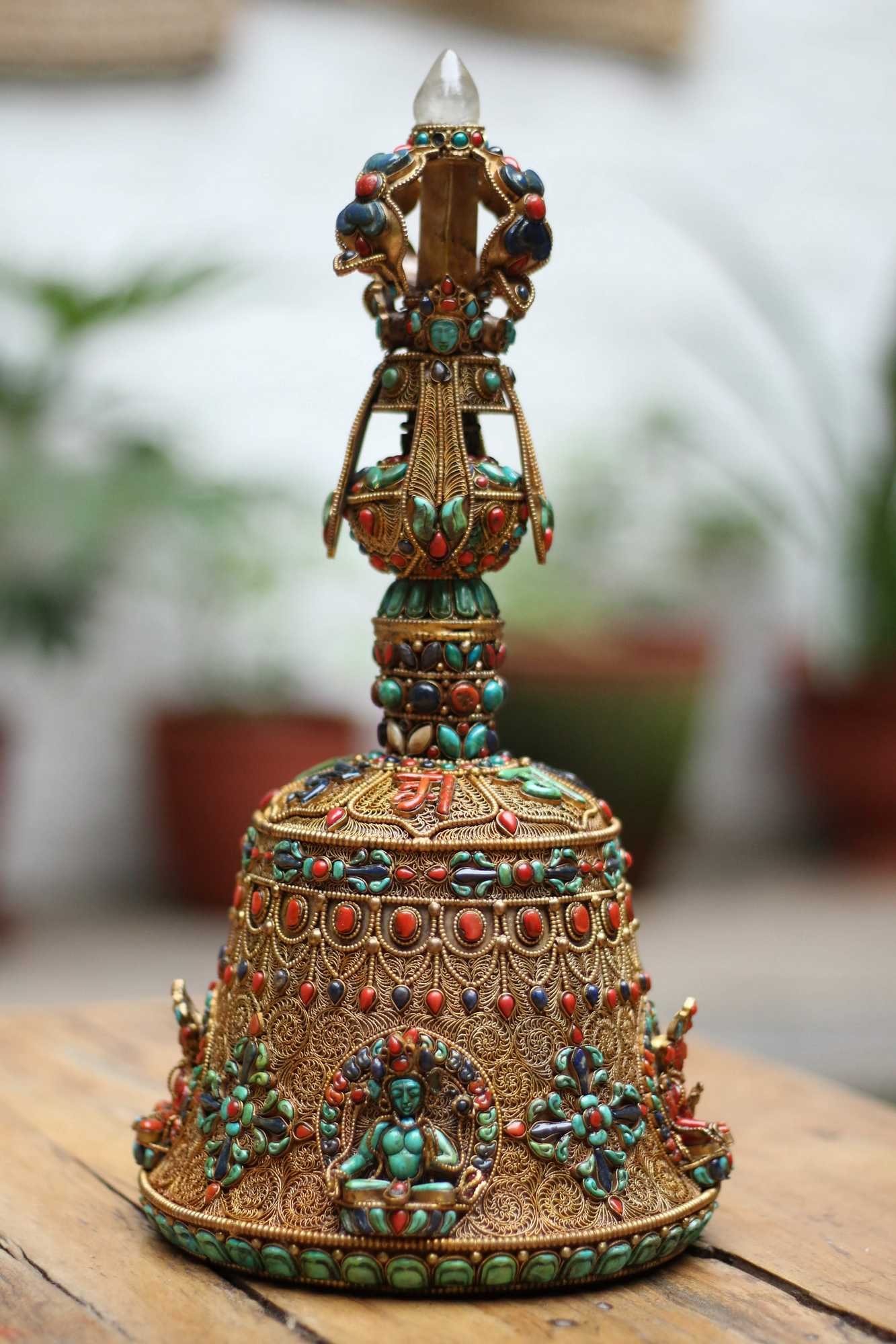 Tibetan Bell with Siku Design Gold Plated and Real Inlaid Stones , dispelling ignorance and marking the beginning of spiritual practice
