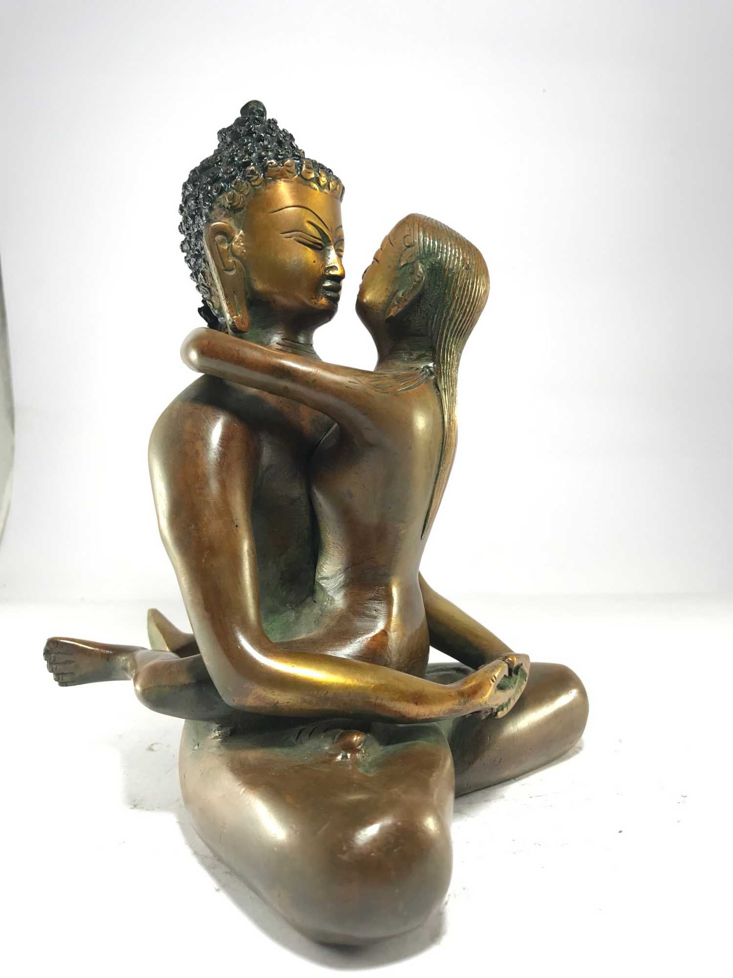 Samantabhadra also known as Visvabhadra, is naked called 'sky clad' , presented embracing figures the white female figure is called Samantabhadri in an body position [Skt. Asana] called Yib-Yum togetherness known as the body of blissful union called Sambhogakaya. The word Samantabhadra means Universal loving Virtue. A union of the inner and outer world. The principle of duality is visualized in male & female, dark-light, love-hate, day & night. The co-emergence [Skt. Sahaja] of wisdom [Skt. Prajna] with fitness of action [Skt. Upaya] which is similar to compassion leads one to a state of Great Bliss [Skt. Mahasukha]. The state of Great Bliss is akin to individual Nirvana.The eight embedded jewels represent the Eightfold Path realised by Sakyamuni. There is a small mirror [Skt. Aina or Darpana] representing introspection, sight or form together with a jewel offering in the foreground. The two hand symbols [Tib. Ting Sha] represent the sense offering of sound. The rainbow beams arising from the crimson nimbus around the head of Samanta Bhadra represent a mastery of Boddhi Nature & one manifestation of the Sambhogakaya is the Rainbow Body. There is a small mirror [Skt. Aina or Darpana] representing introspection, sight or form together with a jewel offering in the foreground. The two hand symbols [Tib. Ting-Sha] represent the sense offering of sound. The rainbow beams arising from the crimson nimbus around the head of Samanta Bhadra represent a mastery of Boddhi Nature & one manifestation of the Sambhogakaya is the Rainbow Body. The co-emergence [Skt. Sahaja] of wisdom [Skt. Prajna] withfitness of action [Skt. Upaya] which is similar to compassion leads one to a state of Great Bliss [Skt. Mahasukha].