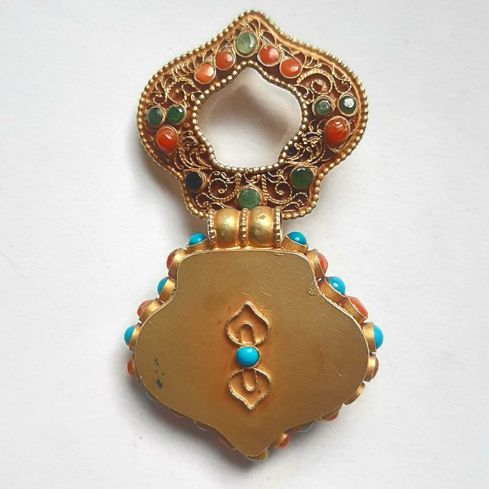 Tibetan Silver Green Tara Ghau Amulet, Gold Plated and Stone Setting