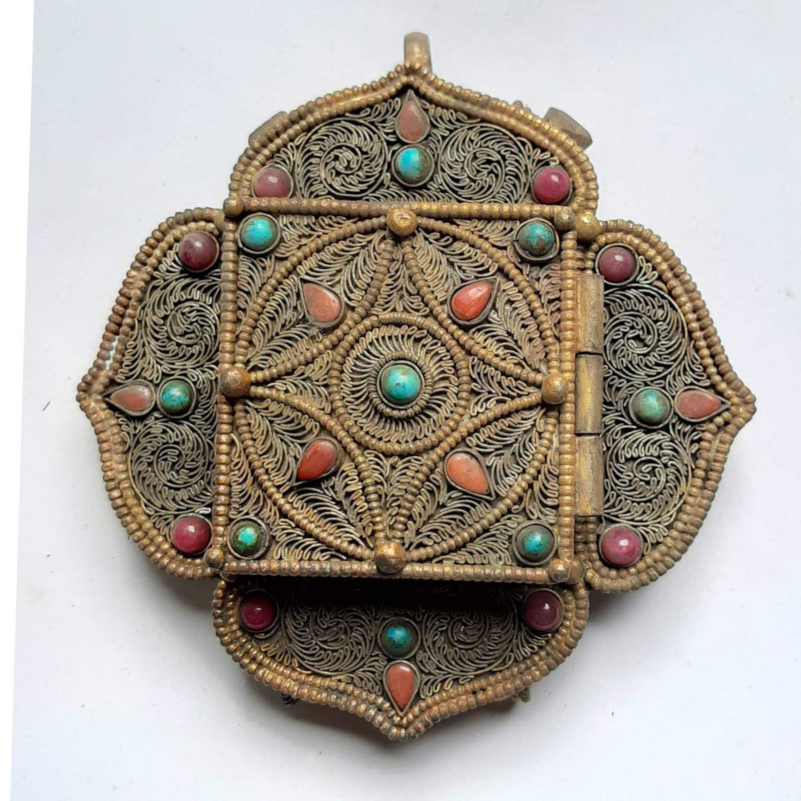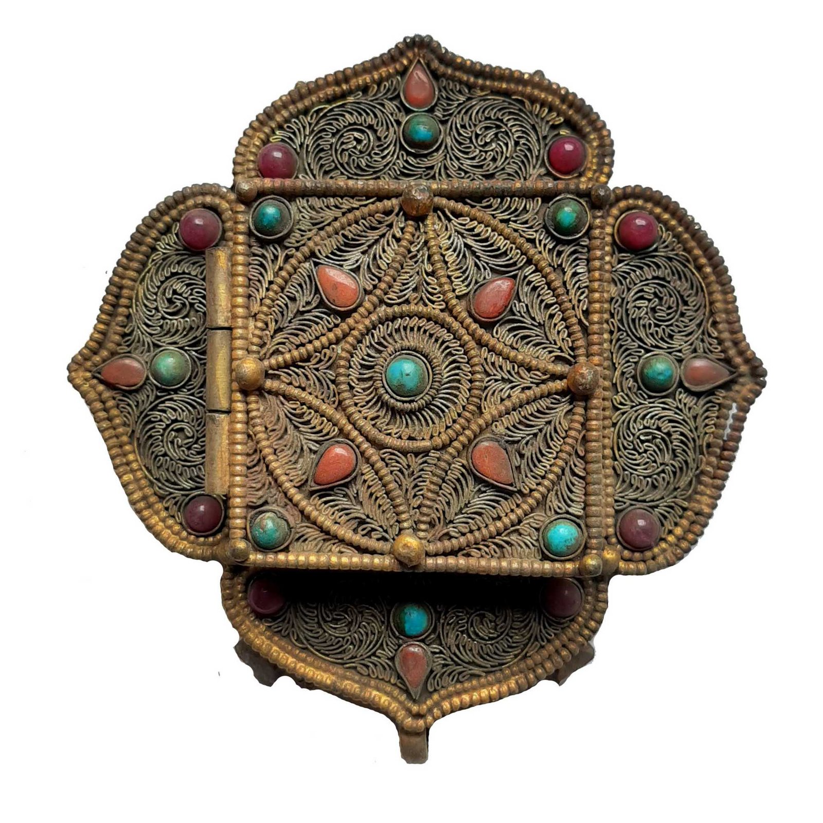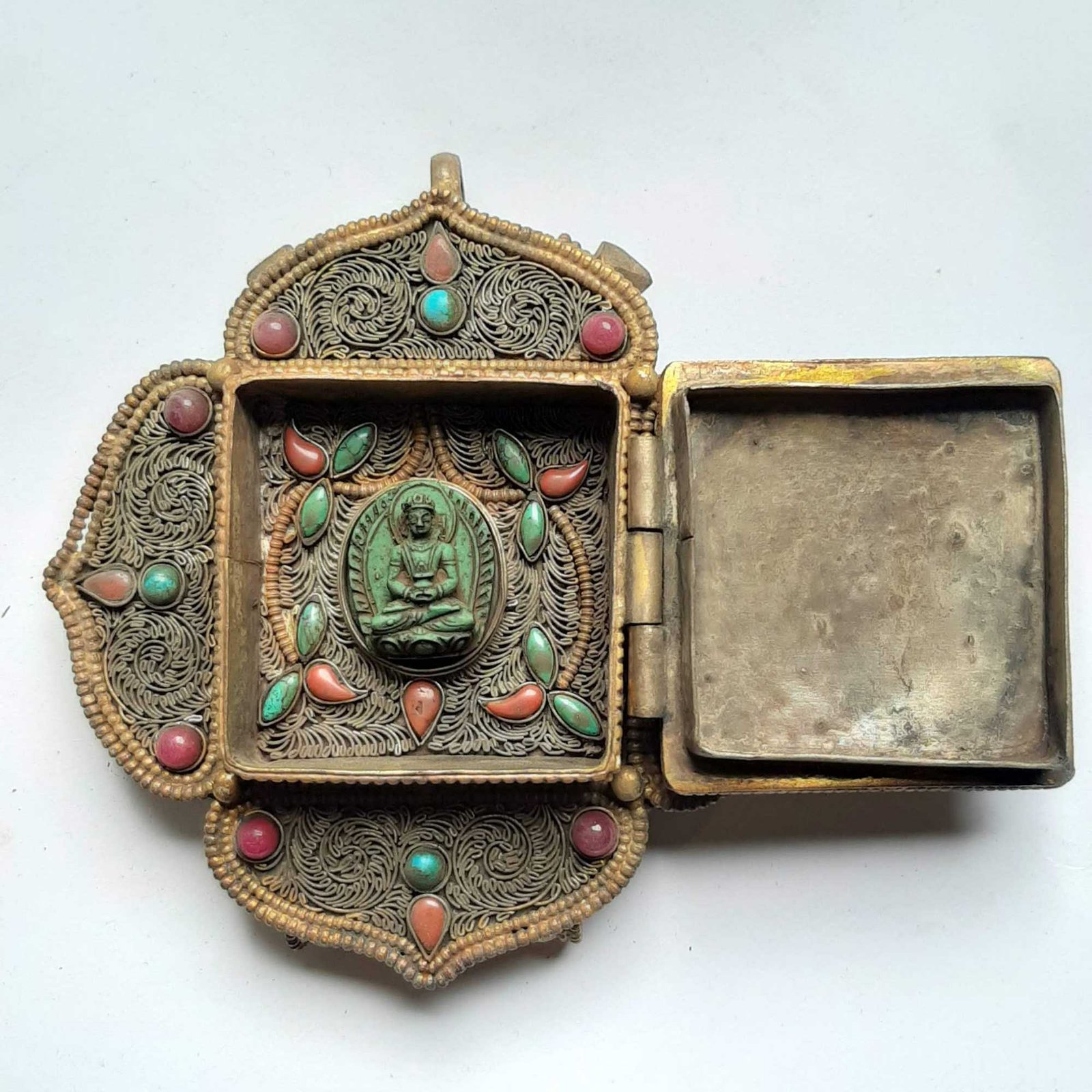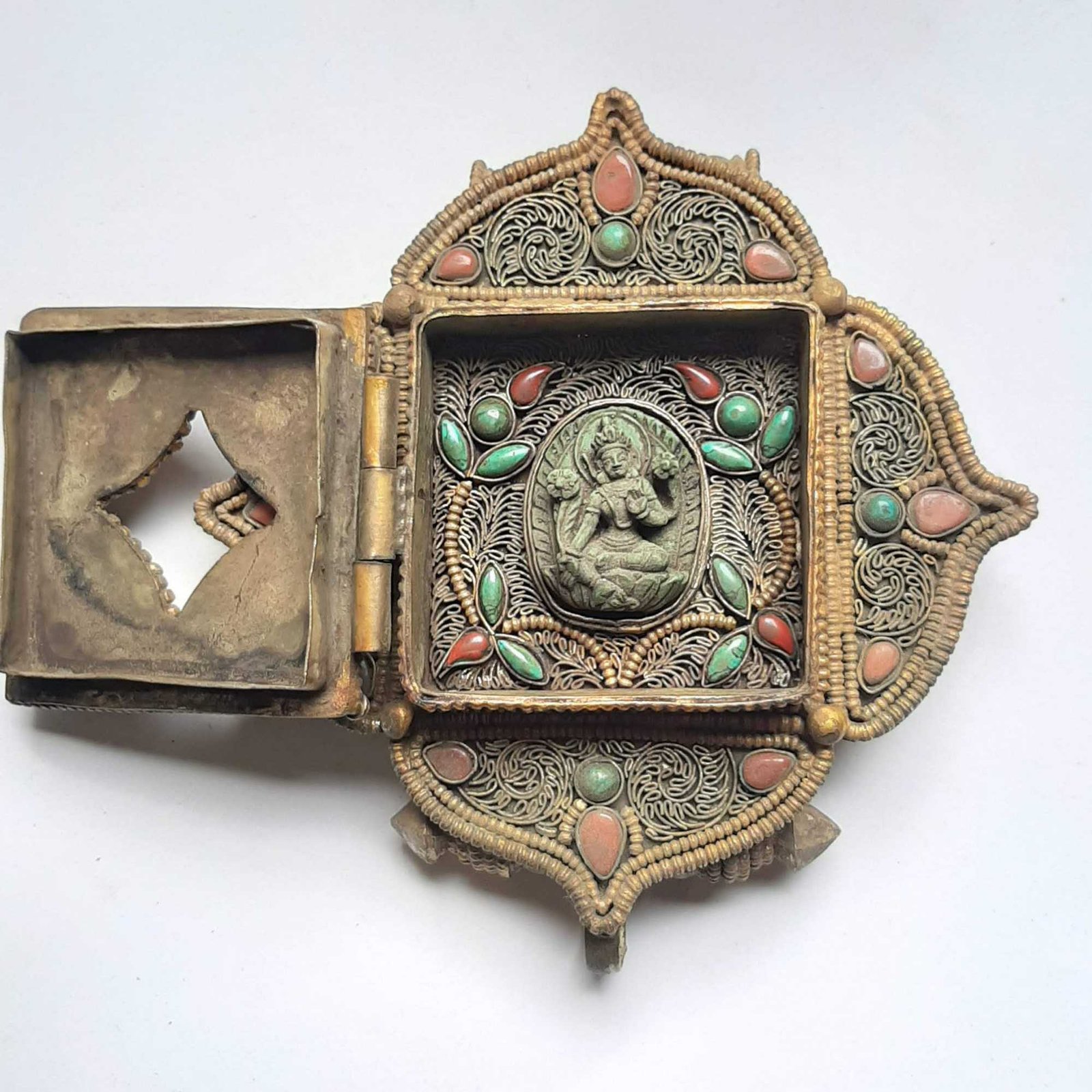 Ghau is a portable shrine in which an image of the owner's personal deity (Ishta Devata) is kept wrapped in silk cloth. Most Tibetans used Ghau at home and during traveling. At home, it is kept on alter but when traveling it is fastened at the cross belt. Generally, Ghau has trefoil shapes to and a window in the middle through which one can see the personal deity. Ghau is made of two parts which fit together to form a box. The back is usually left plain and the front is richly decorated. Read More