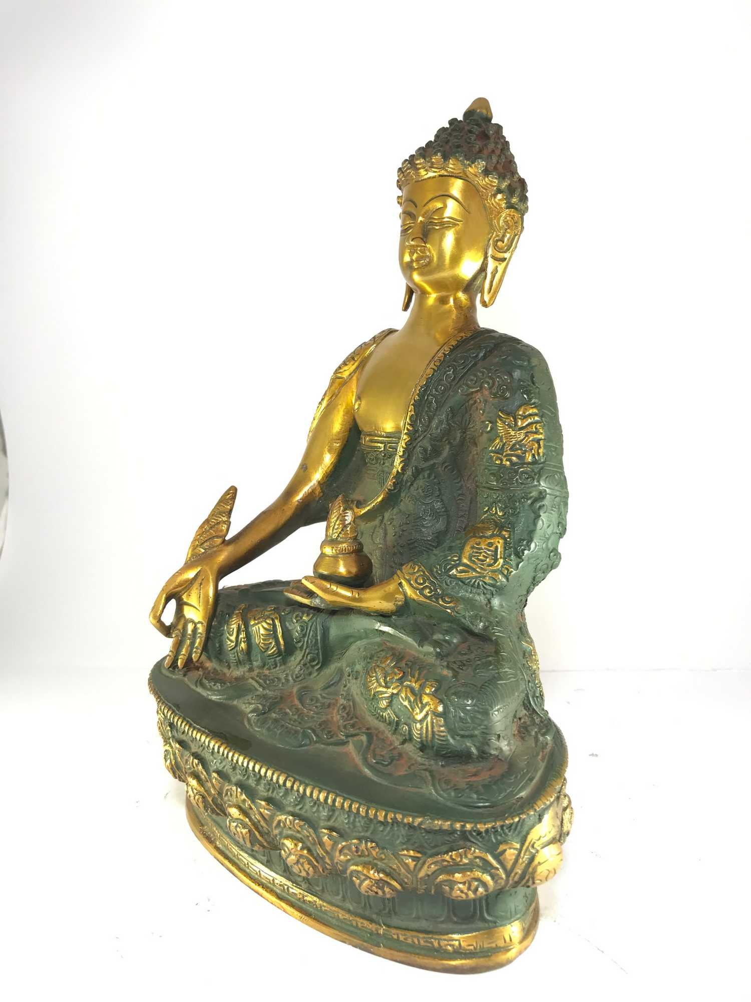 This Medicine Buddha has been created using the sand casting system, also known as sand molding casting. This widely employed manufacturing process utilizes a sand mold to produce metal products and components in various sizes and shapes. Sand casting holds significant popularity in the industry, accounting for approximately 60% of all metal castings. The sand casting process involves six primary steps. First, a pattern or replica of the desired sculpture, in this case, Medicine Buddha, is created using a material like wood or metal. The pattern is then placed in a flask, which is a box-like structure divided into two halves. The next step involves packing the flask tightly with specially formulated molding sand, creating a mold cavity that matches the shape of the pattern. The pattern is subsequently removed, leaving behind a negative impression of the sculpture within the sand mold. Read More