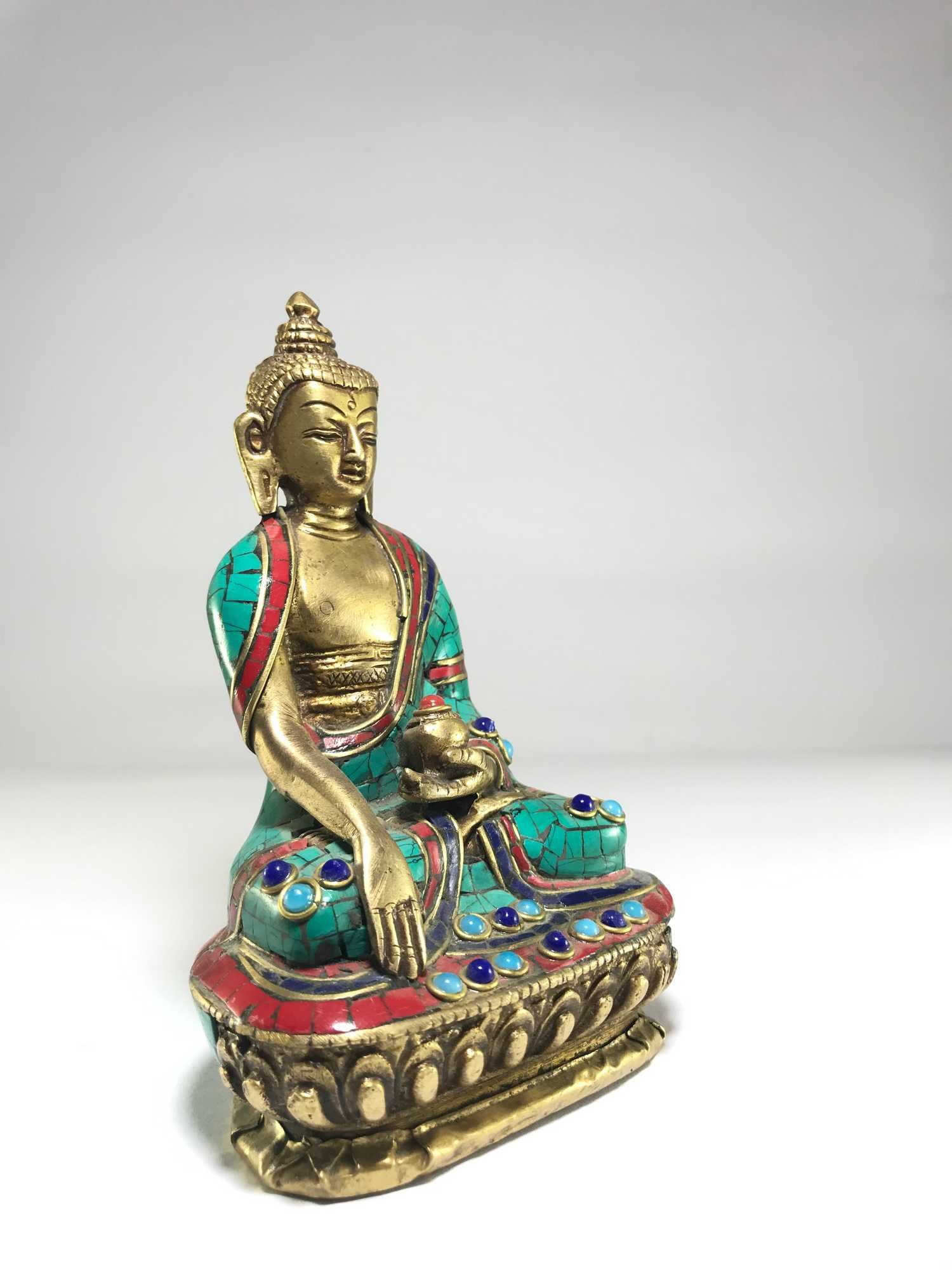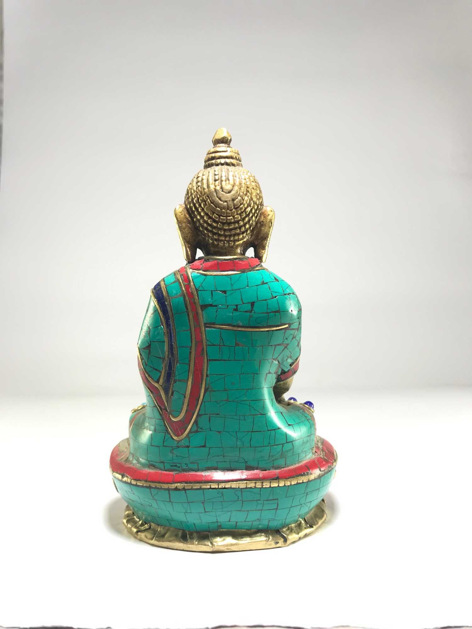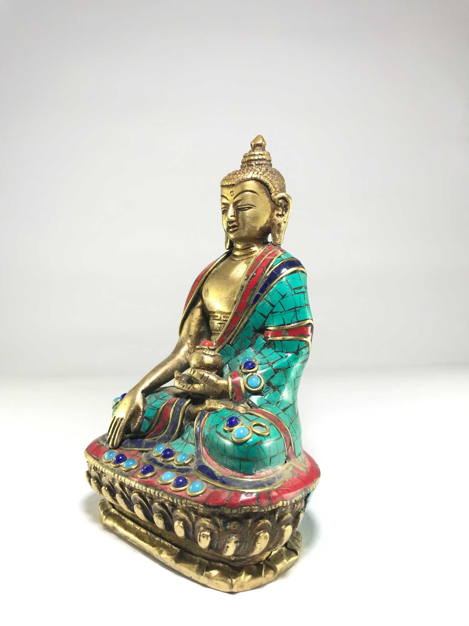 The Shakyamuni Buddha is adorned with an exquisite array of semi-precious stones, including turquoise, coral, and lapis lazuli. These stones are carefully selected and meticulously placed on the Shakyamuni Buddha's surface, adding a touch of opulence and enhancing its overall beauty. Each stone is thoughtfully positioned using a high-quality adhesive, ensuring secure and long-lasting attachment. The vibrant colors and unique patterns of the stones create a captivating contrast against the backdrop of the Shakyamuni Buddha, elevating its visual appeal and making it truly eye-catching. Read More