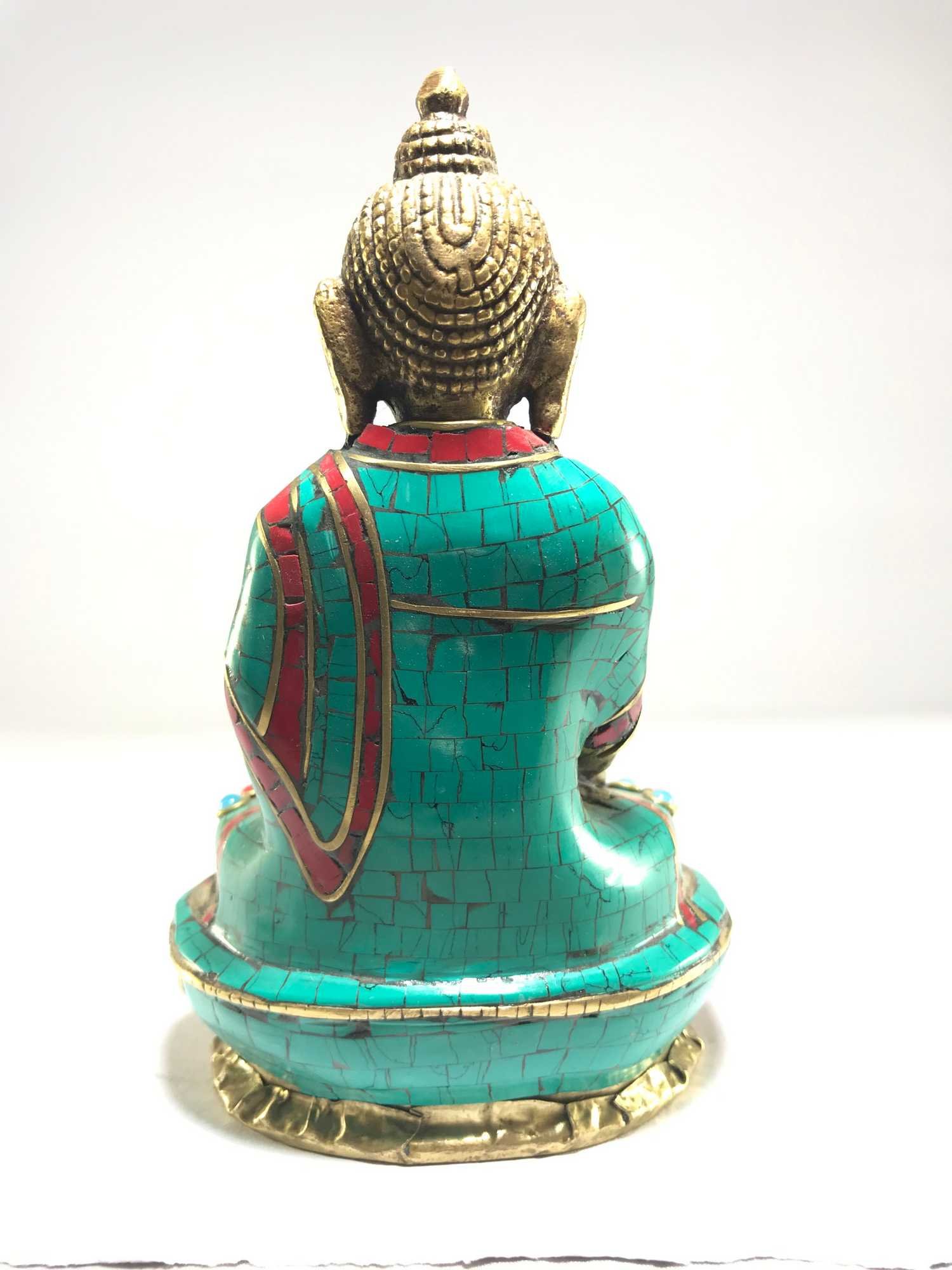 The Ratnasambhava Buddha is adorned with an exquisite array of semi-precious stones, including turquoise, coral, and lapis lazuli. These stones are carefully selected and meticulously placed on the Ratnasambhava Buddha's surface, adding a touch of opulence and enhancing its overall beauty. Each stone is thoughtfully positioned using a high-quality adhesive, ensuring secure and long-lasting attachment. The vibrant colors and unique patterns of the stones create a captivating contrast against the backdrop of the Ratnasambhava Buddha, elevating its visual appeal and making it truly eye-catching. Read More