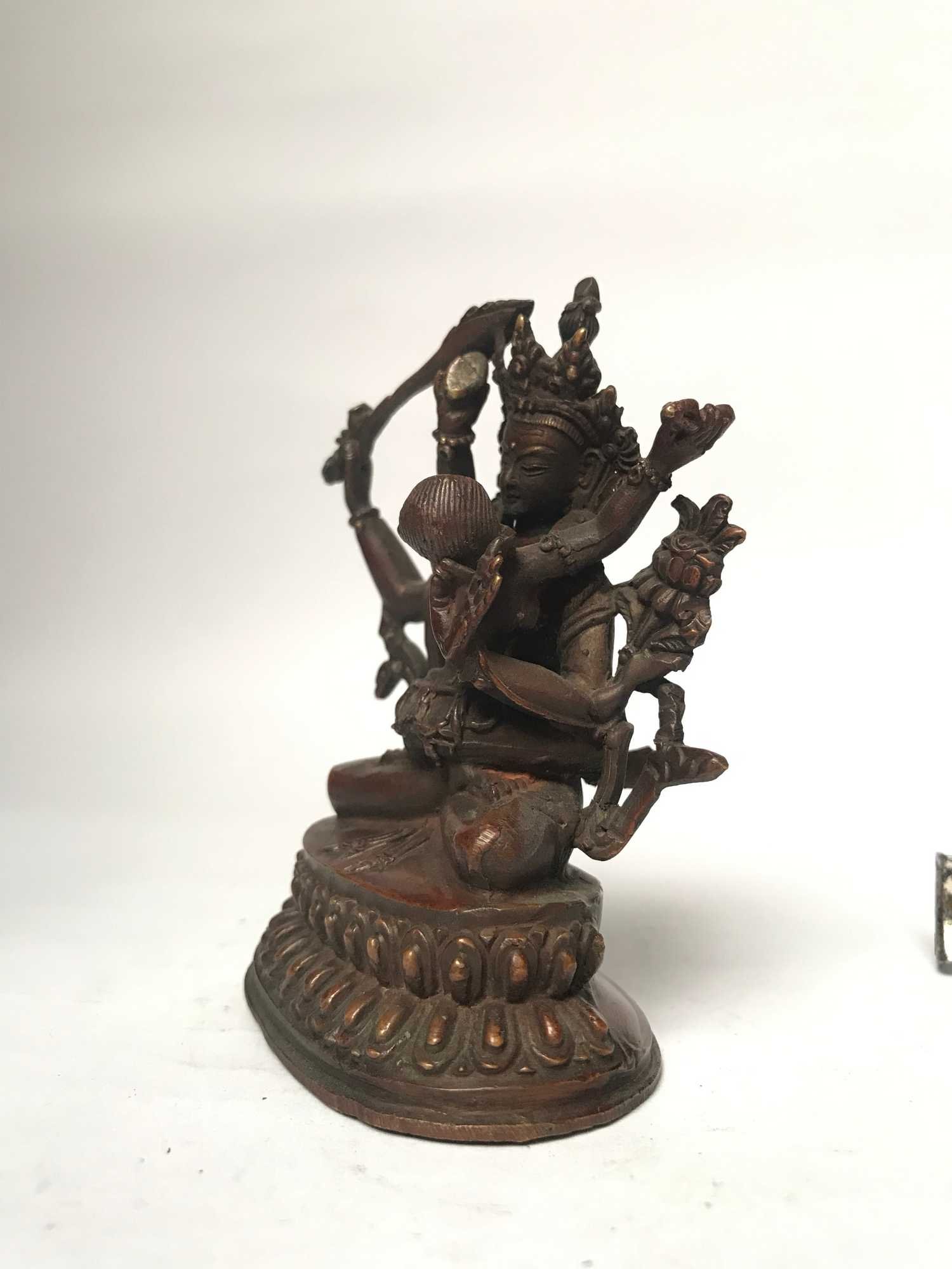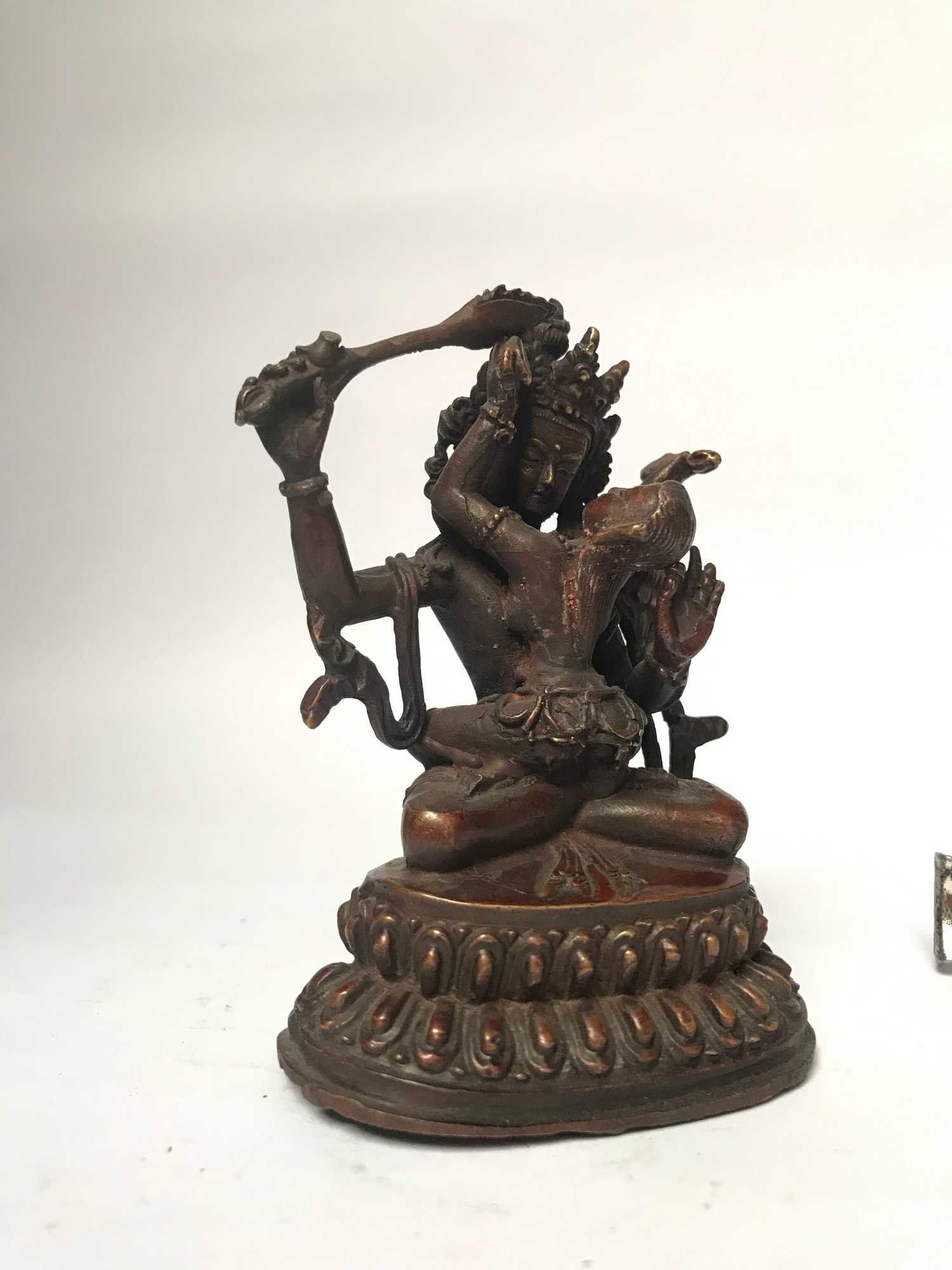 : IntroductionShakti Yab-yum is a common symbol in Nepalese and Tibetan art. It represents the primordial union of wisdom and compassion, depicted as a male deity in union with his female consort via the similar concept of interpenetration or "coalescence," as illustrated by the concept of Indra's net. The male figure represents compassion and dexterity, while the female figure represents insight. The female is seated on the male's lap in yab-yum. A rare rendition of a similar figure, but reversed, with the male sitting on the female's lap, is known as yum-yab. Read More