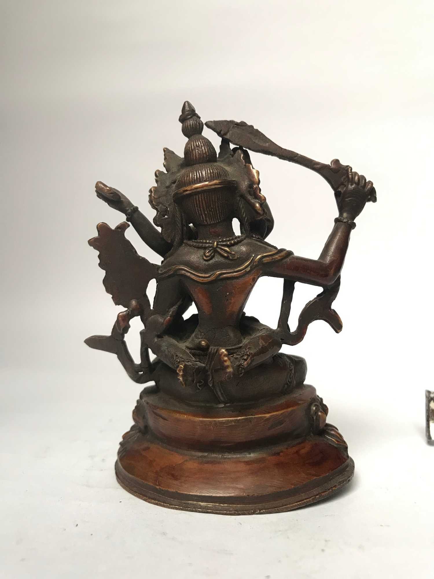 This Manjushri has been meticulously treated with a chocolate color antique patina. The intention behind this patina is to replicate the appearance of a copper statue that has gracefully aged over a century. Unlike a simple coat of paint, this patina is not applied superficially and is designed to endure. It undergoes an artificial oxidation process that adds depth and character, while also serving as a protective layer against natural oxidation.
