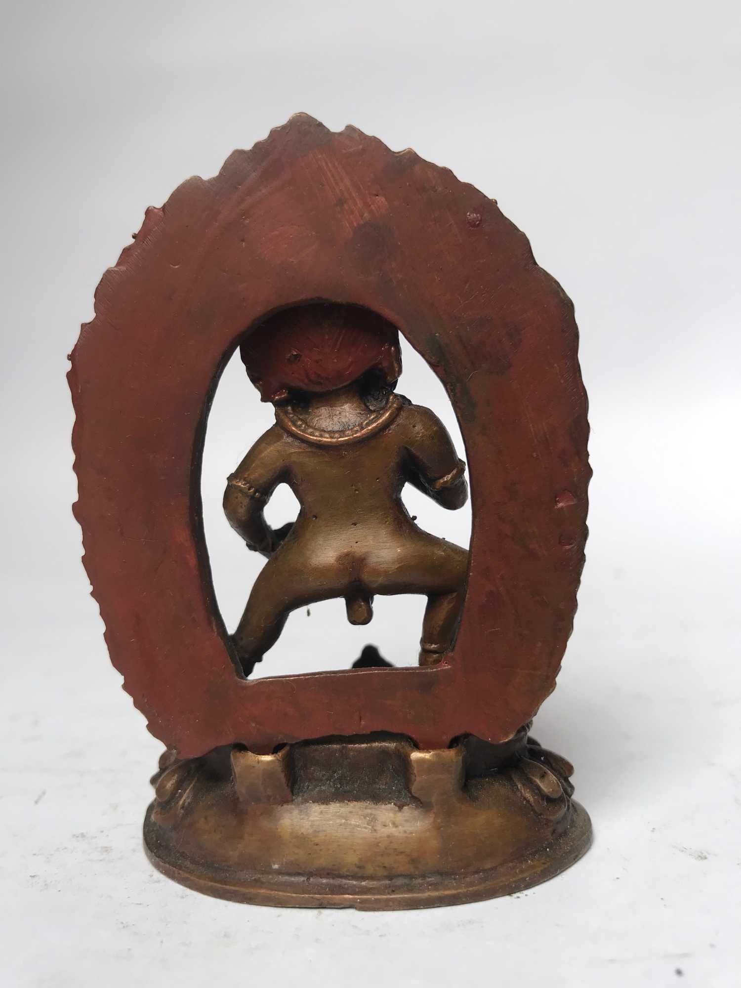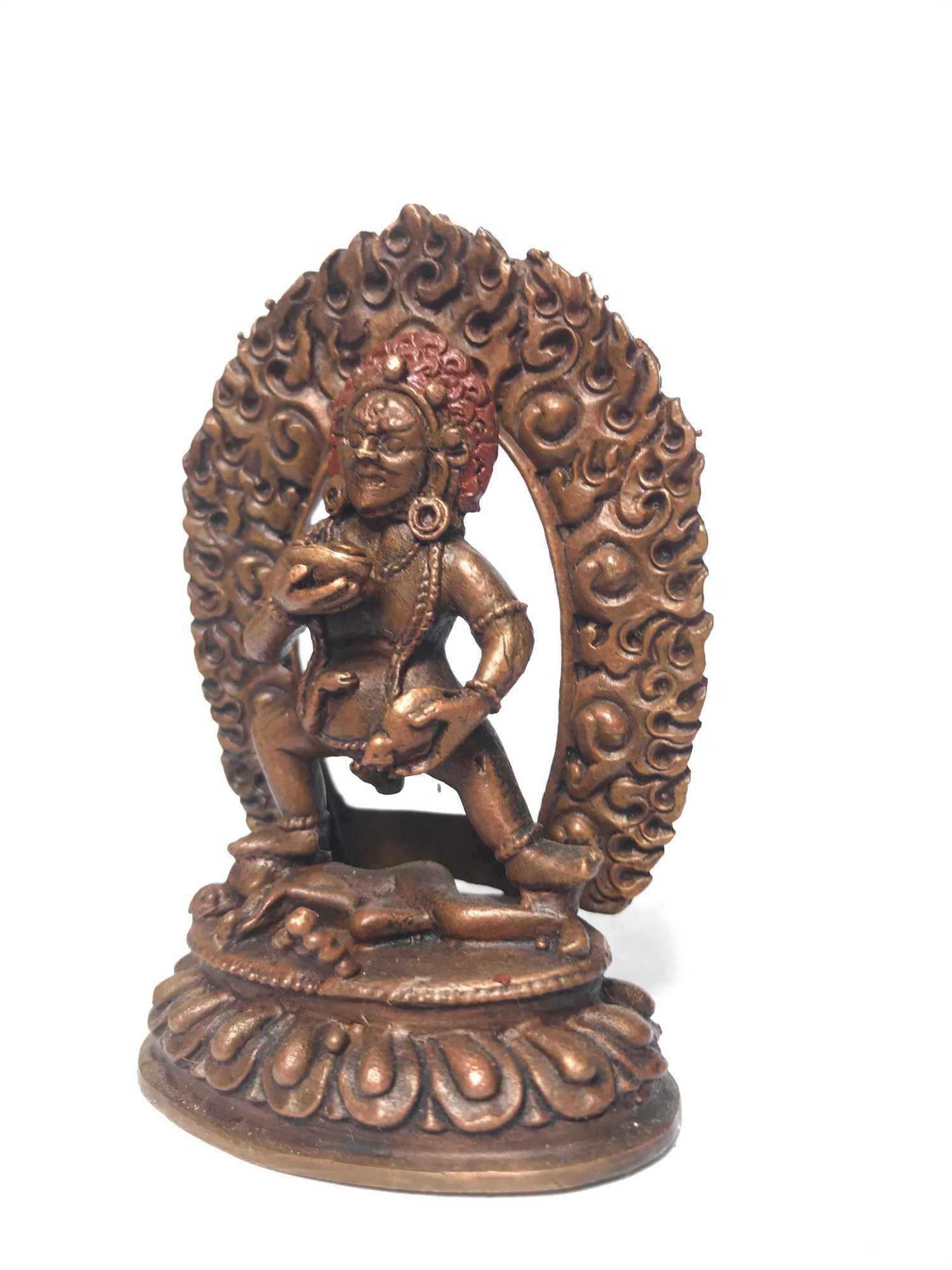 This Black Jambhala has been meticulously treated with a chocolate color antique patina. The intention behind this patina is to replicate the appearance of a copper statue that has gracefully aged over a century. Unlike a simple coat of paint, this patina is not applied superficially and is designed to endure. It undergoes an artificial oxidation process that adds depth and character, while also serving as a protective layer against natural oxidation.