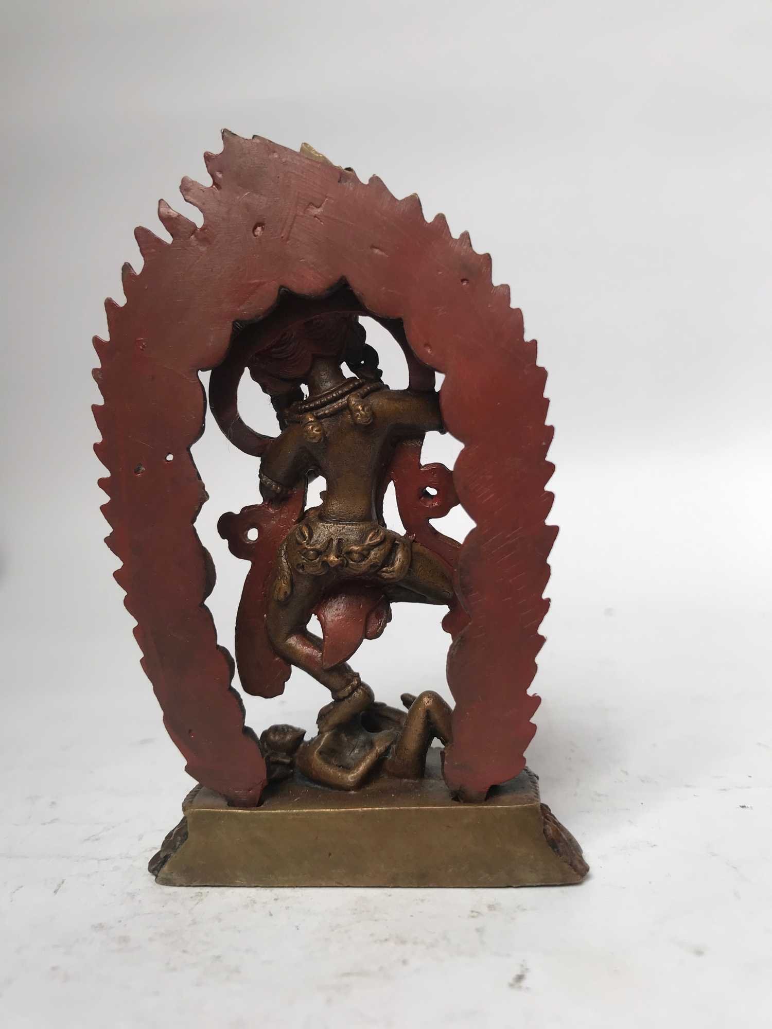 This Vajravarahi has been meticulously treated with a chocolate color antique patina. The intention behind this patina is to replicate the appearance of a copper statue that has gracefully aged over a century. Unlike a simple coat of paint, this patina is not applied superficially and is designed to endure. It undergoes an artificial oxidation process that adds depth and character, while also serving as a protective layer against natural oxidation.