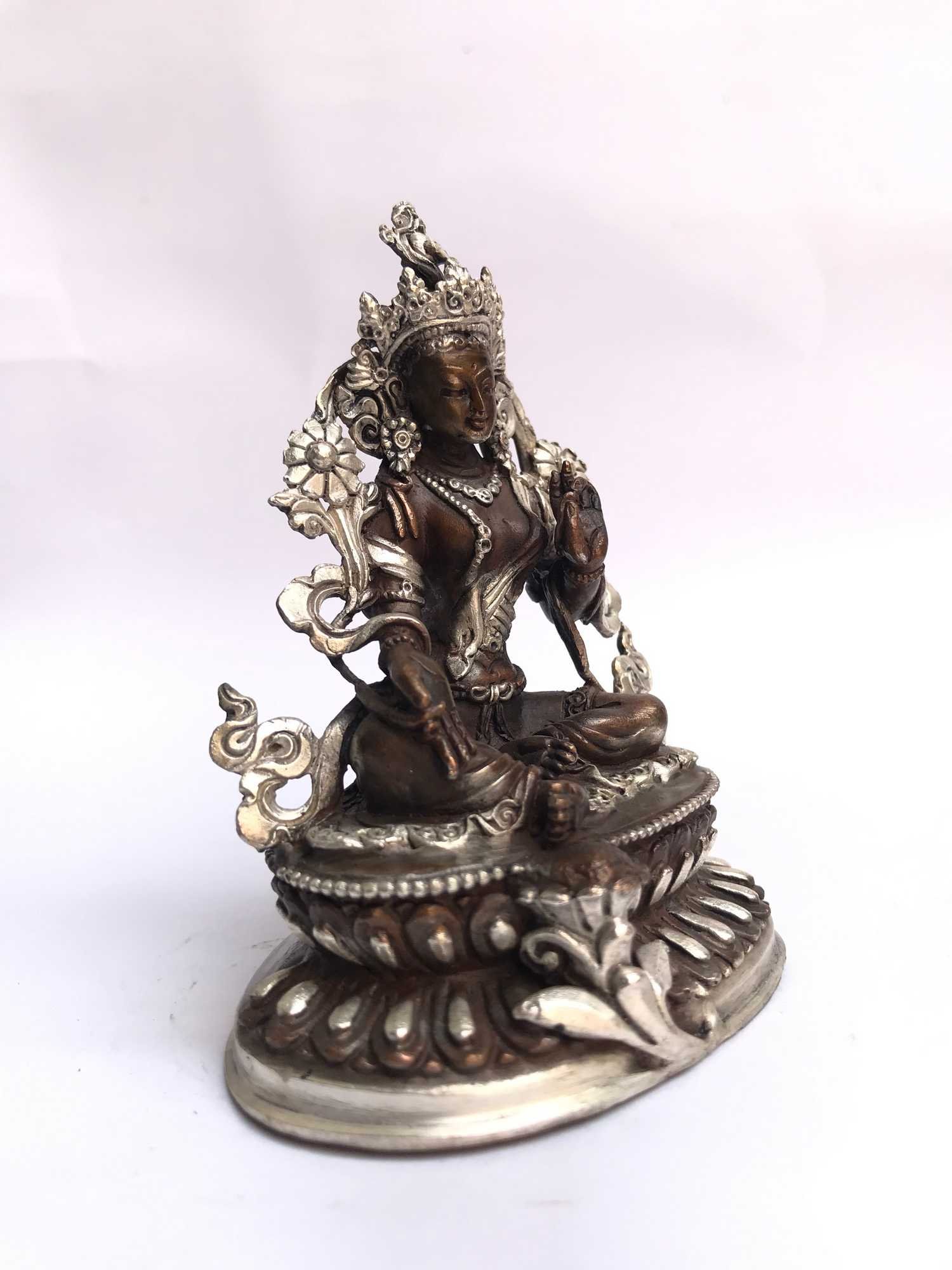 Tibetan Statue of Green Tara, Double Lotus Base, Silver Plated Oxidized , Goddess of Compassion, Protection, and Swift Action