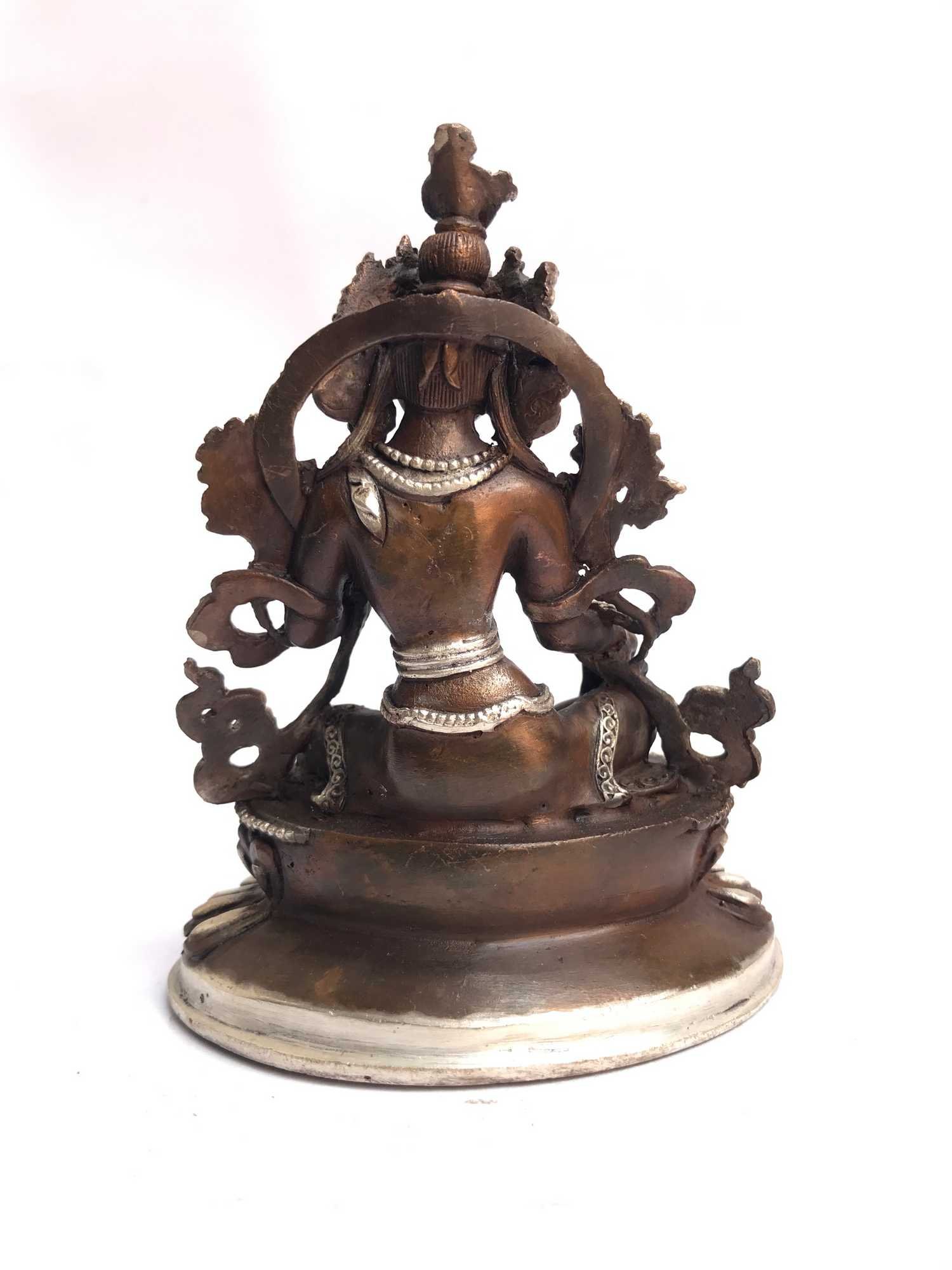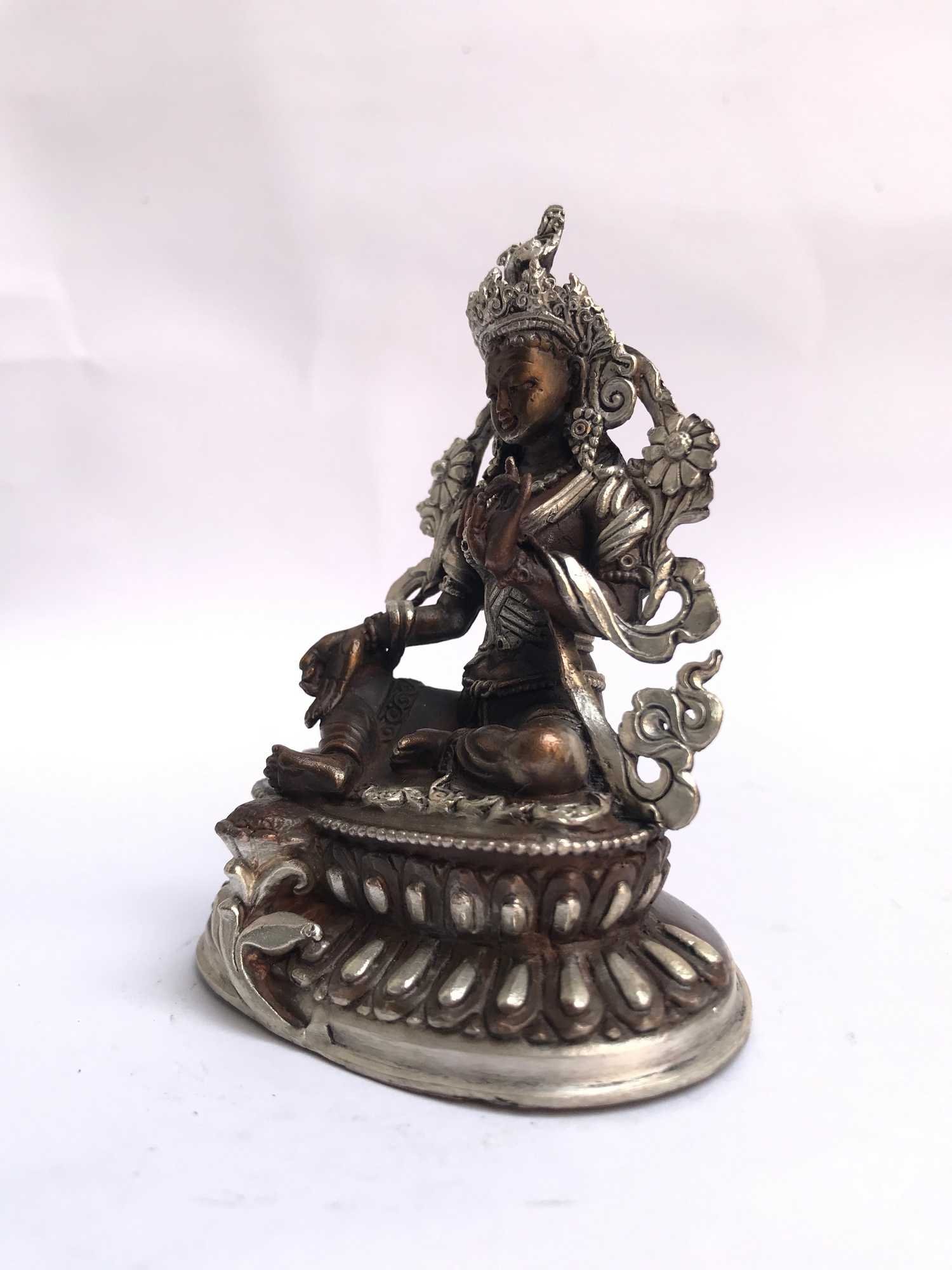 The Green Tara features a captivating combination of partly silver plating and dark oxidation. This unique finishing technique combines the lustrous shine of silver with the rich, deep tones achieved through oxidation. In the process of creating this finish, selected areas of the Green Tara are expertly silver-plated, creating a radiant and reflective surface that catches the light. The remaining areas are intentionally oxidized, resulting in a darkened patina that adds depth and character to the piece. Read More