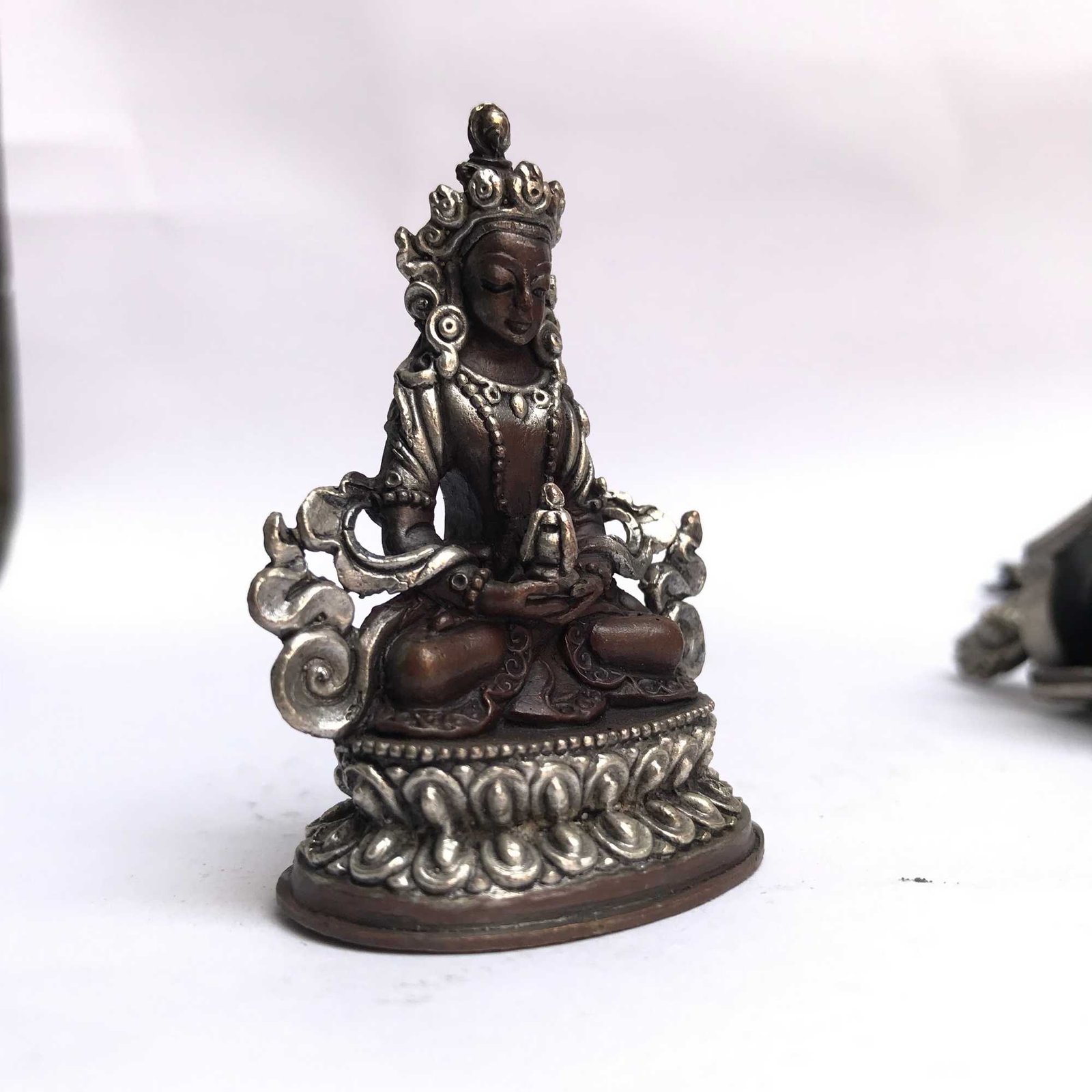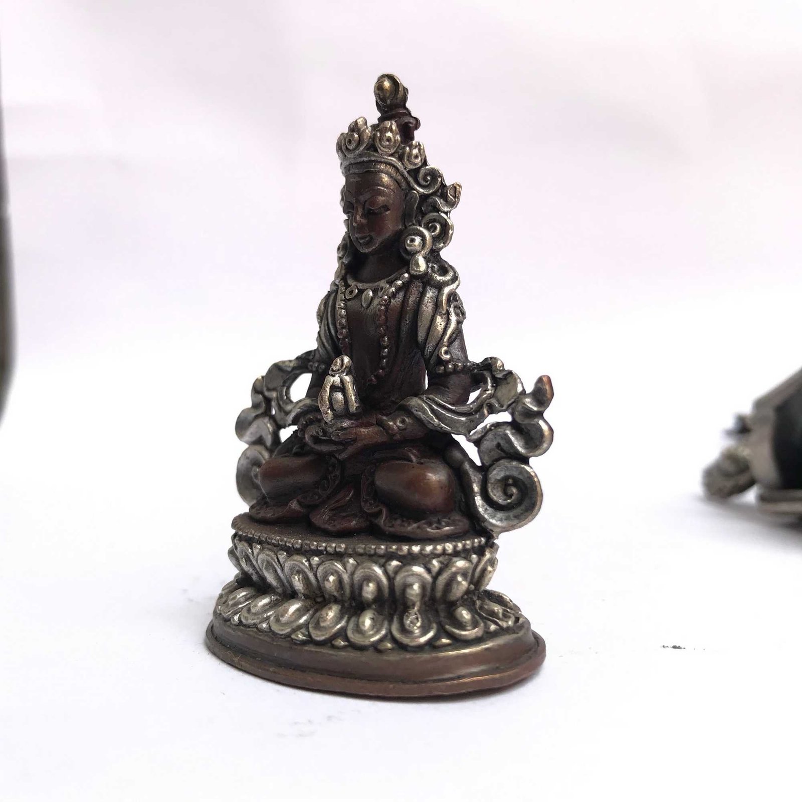Tibetan Statue of Amitayus, Aparimita, Double Lotus Base, Silver Plated Oxidized , Buddha of Long Life, Wisdom, and Spiritual Vitality
